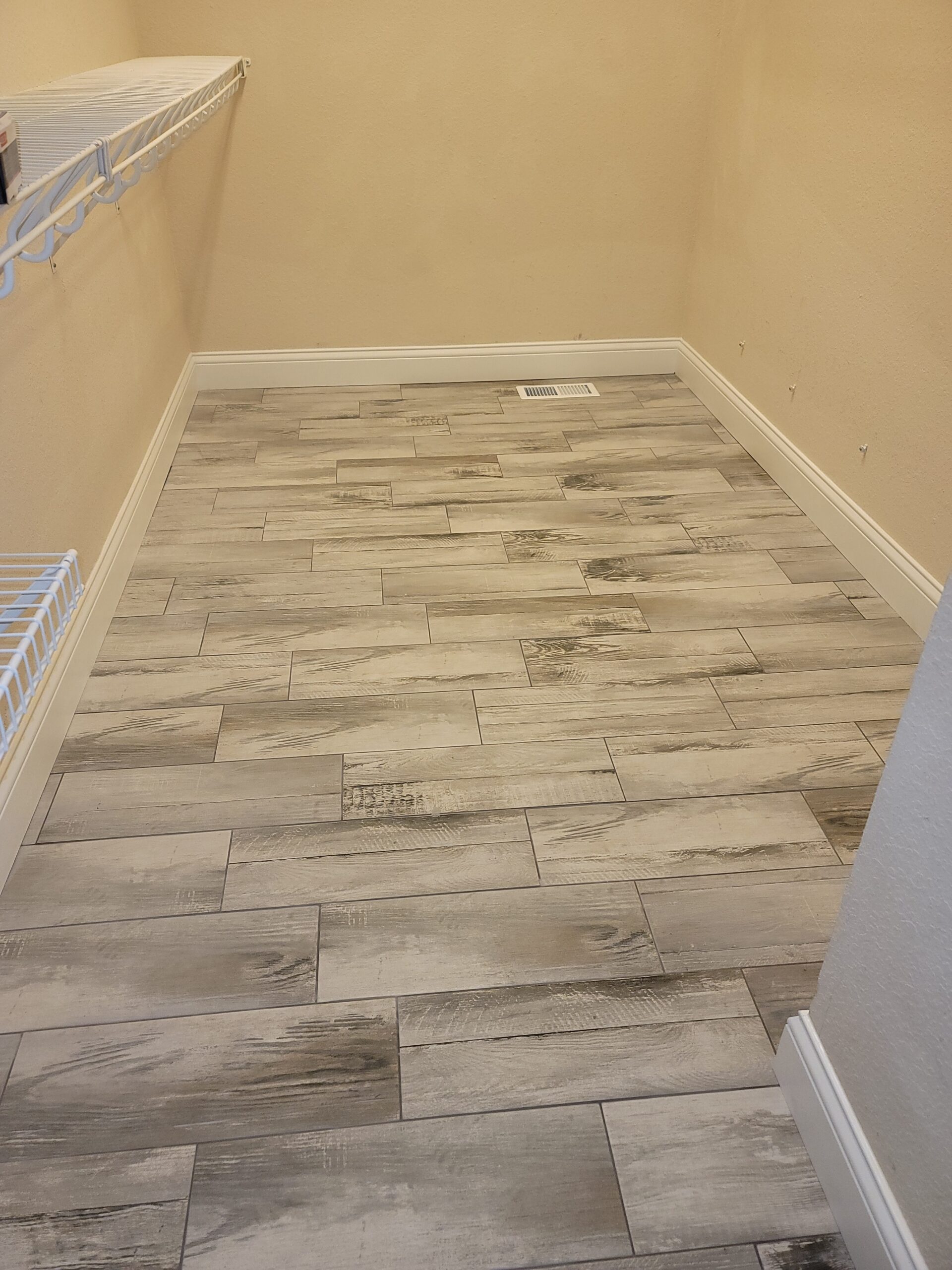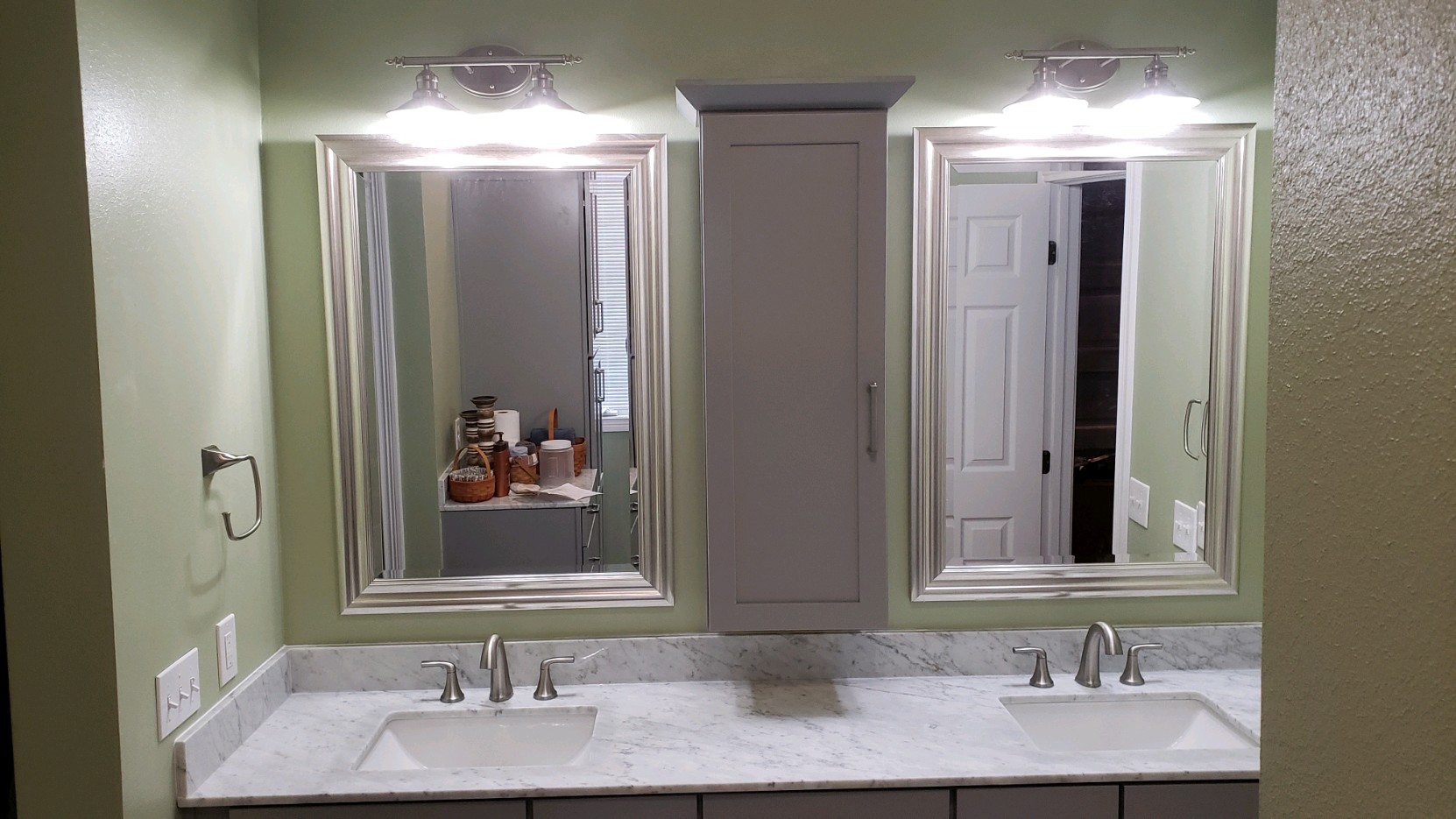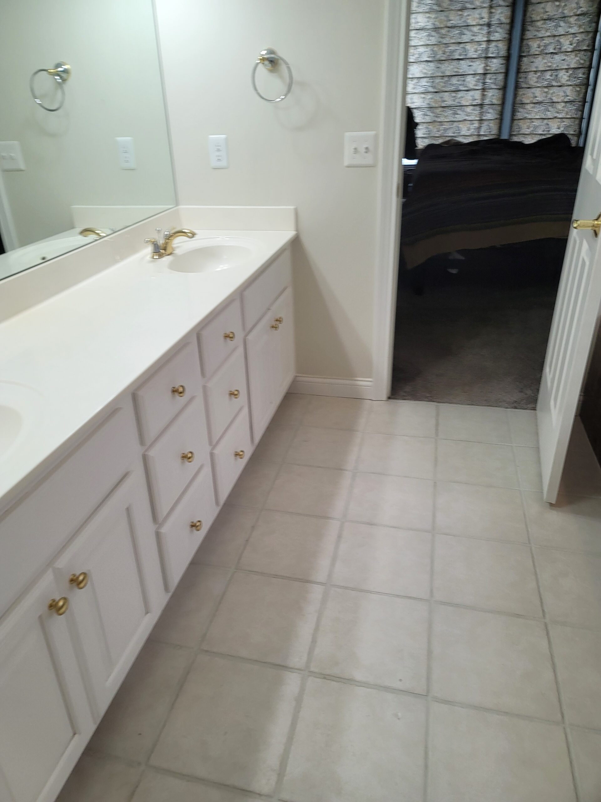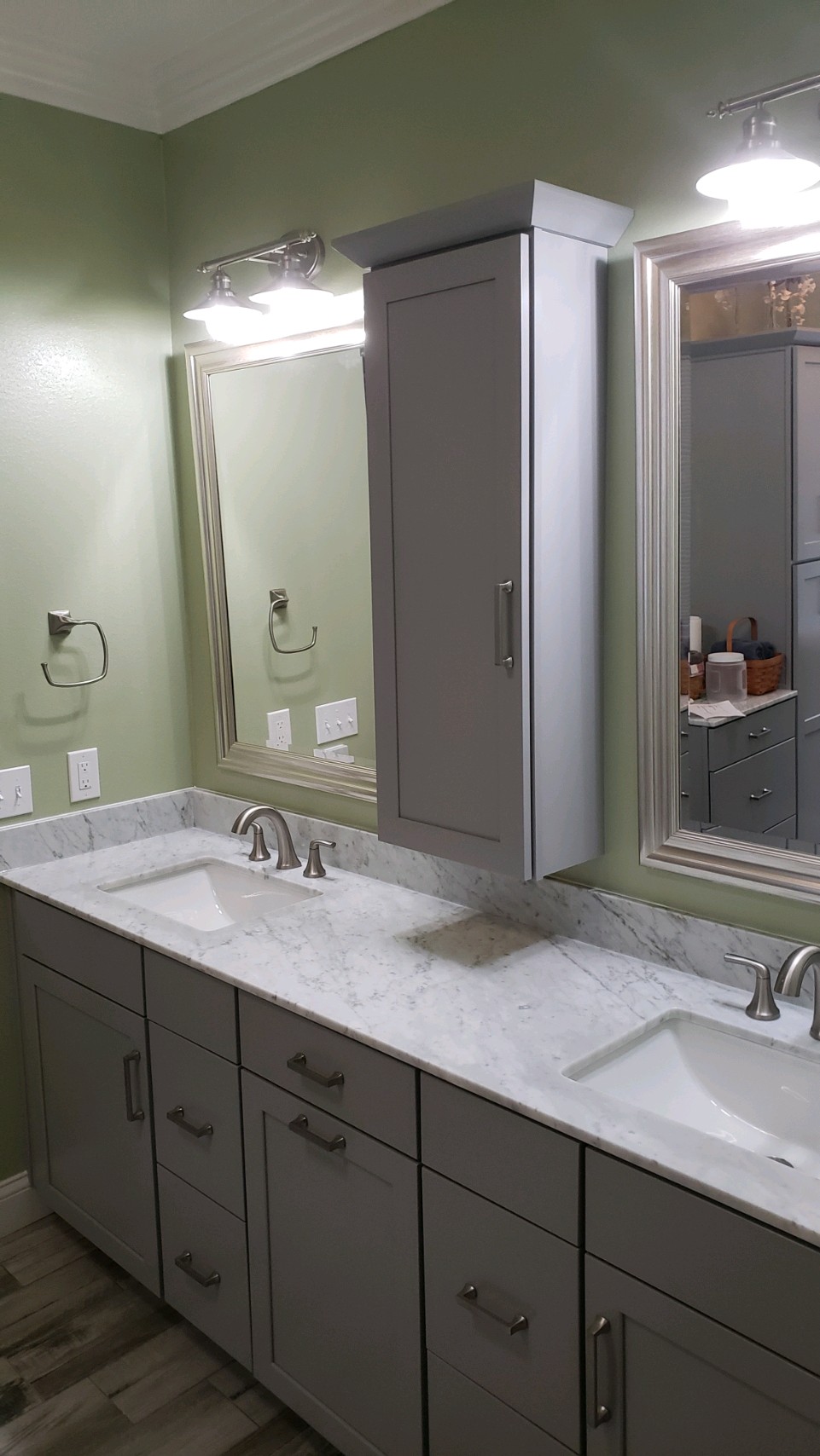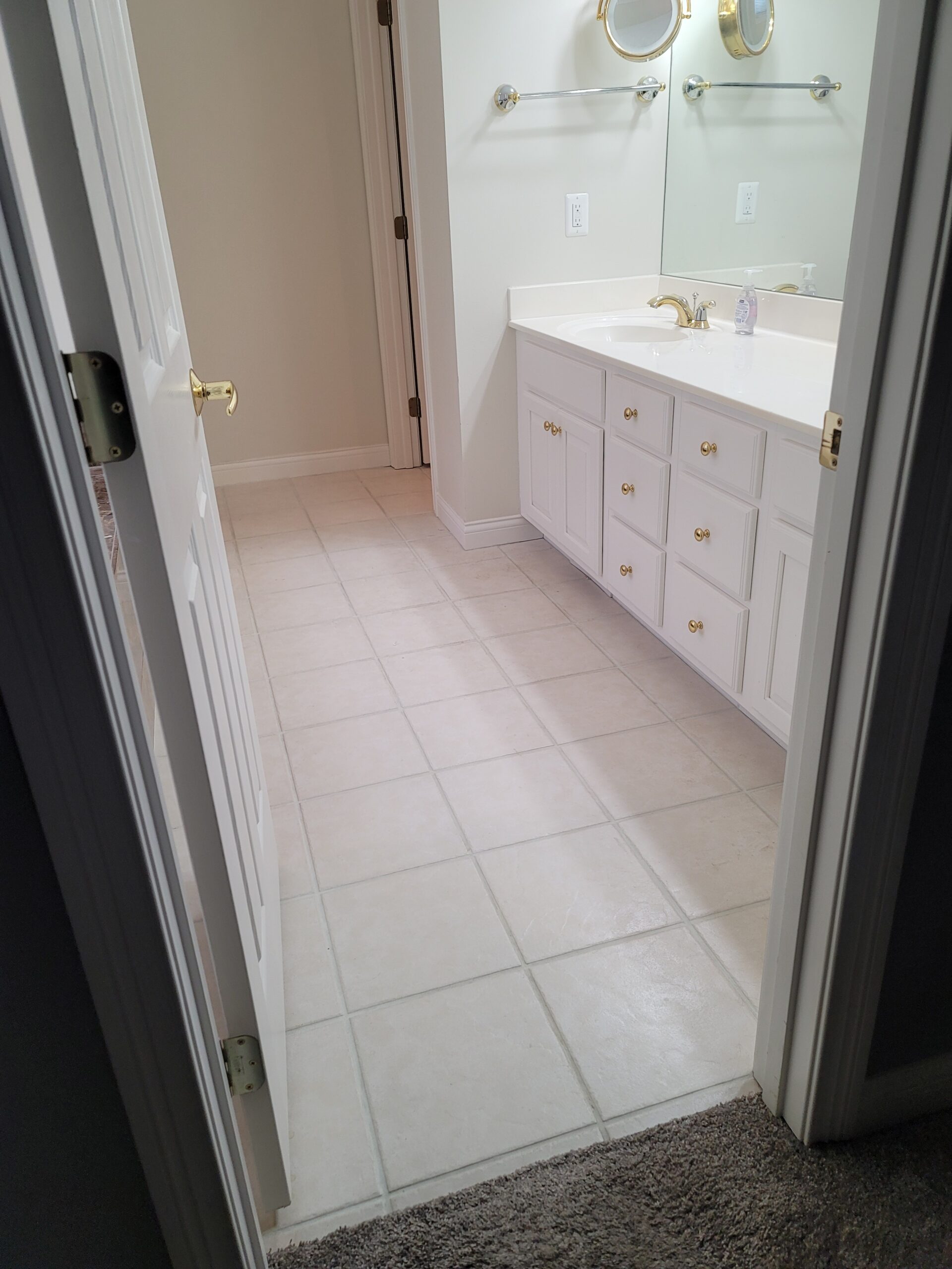 Doesn’t even seem like the same room! The vanity stayed in the same location, but all of the fixtures were updated to follow the theme. We replaced the existing flooring with tile that paired beautifully: