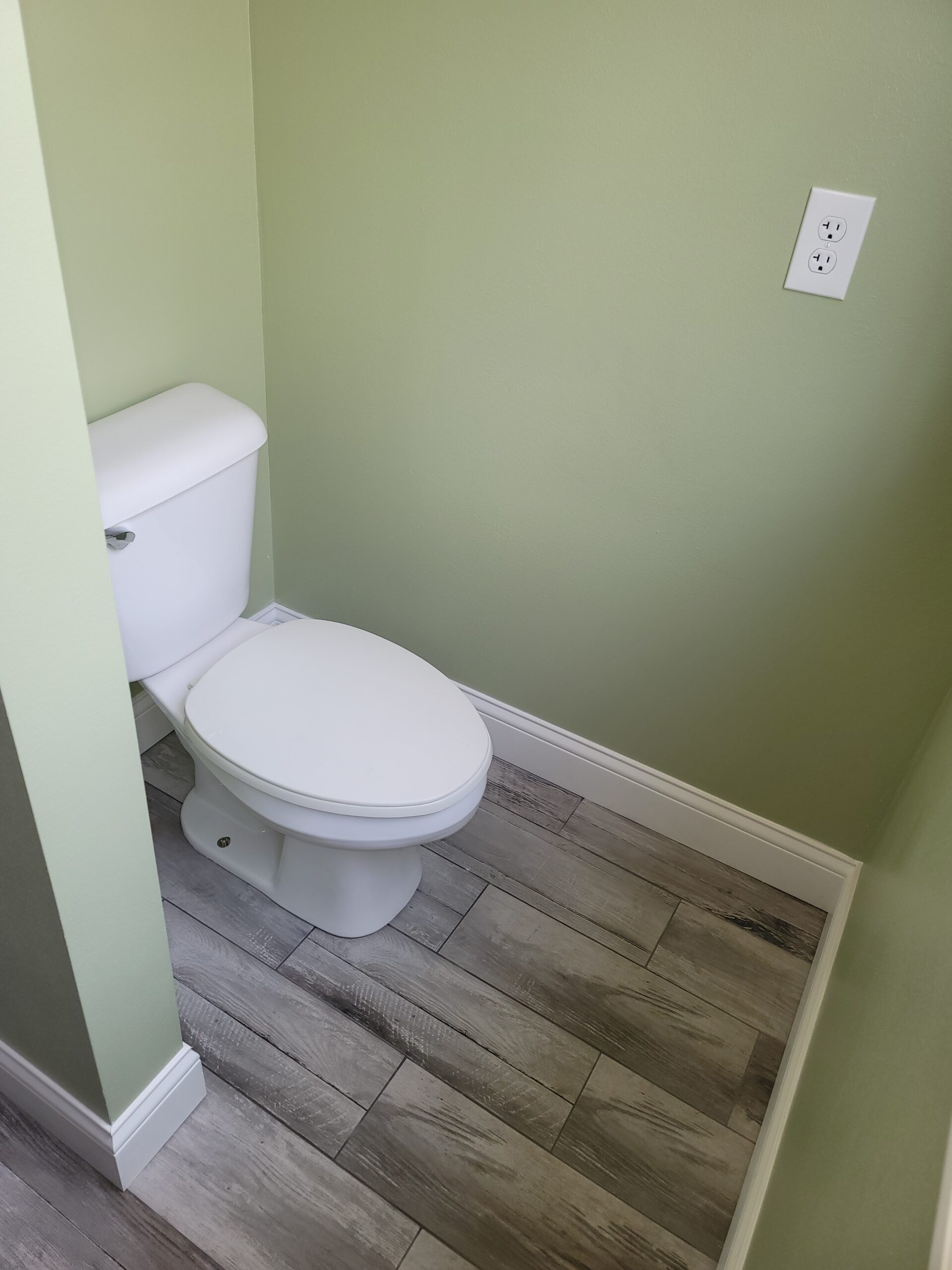 We deleted the tub and routed the plumbing for the toilet over to this location. We framed a couple of walls to create a private toilet space, but made sure to keep it lower than the ceiling to add some character. Here is the result:
