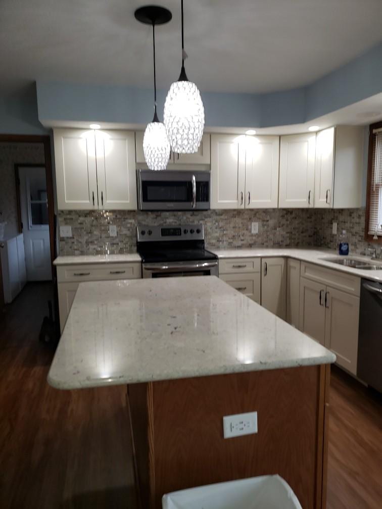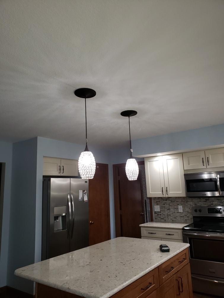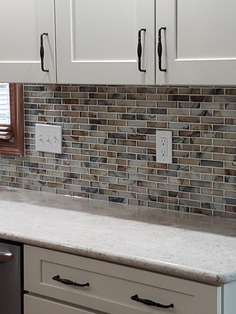 Working with a designer can make a huge difference. The designers that we use work tirelessly to bring your thoughts to fruition. Our client elected to install an accent island to be the focal point of their new kitchen space. Due to the amount of utilities in the soffit, the client elected to keep them in place. When planning your kitchen remodel, be sure to go over all scenarios before starting – this can save you a lot of headache through the process. The lighting above the island was adequate, but dated, so new pendant lights were dropped over the island to bring a new feel to the kitchen. The tile splash was chosen to pull all of the colors of the room together, and it worked out perfectly! Throw in the new floor, and this space is ready to serve our client’s needs for years to come.