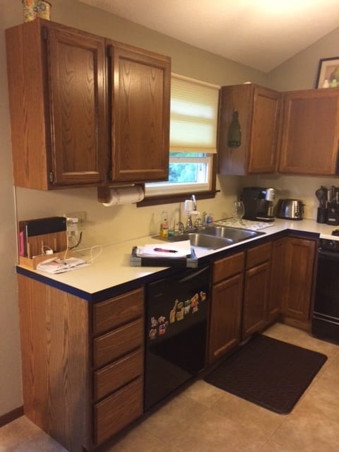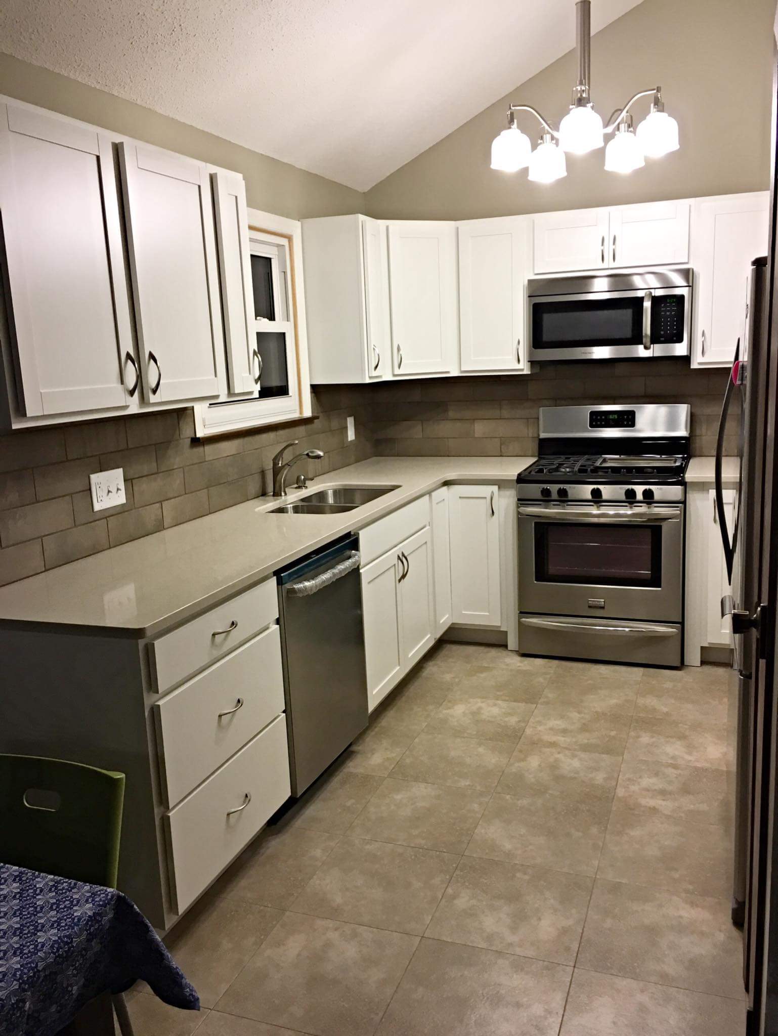 Kitchen update needed because of the dated look. New cabinets and counter top installation, along with back splash and appliances, resulting in a fabulous space!! The old cabinets were so dark and the lighting was awful. The wall color stayed the same, but you can still see such a difference. Simple, yet elegant white cabinets installed along with a gray tile splash to really set the space off. Pairing this with stainless steel appliances results in a space that any home owner could enjoy!