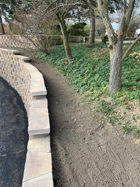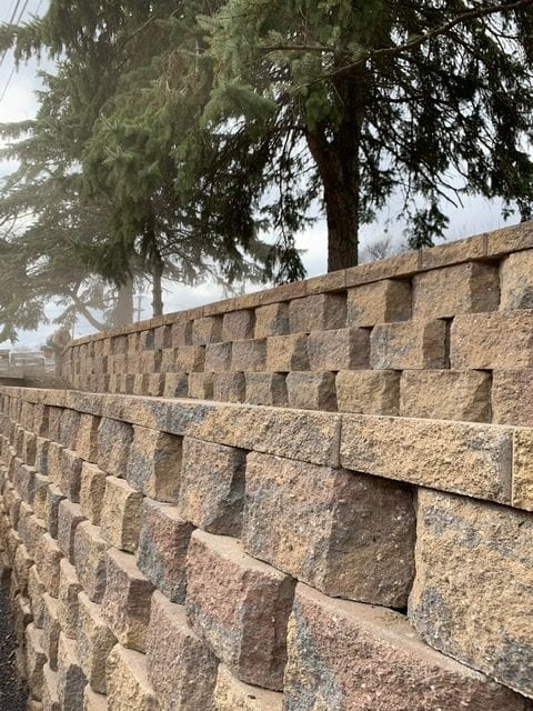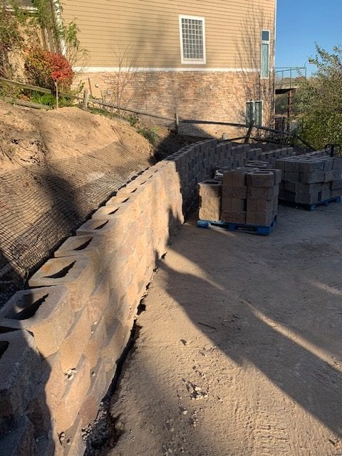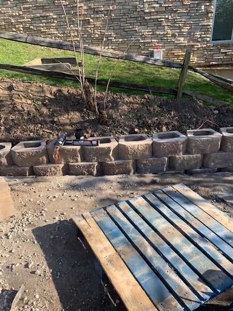 For a project like this, we brought in equipment and plenty of elbow grease. We excavated the old retaining wall and started the process of prepping for the new block. A lot of planning and logistics went into the process of laying out this project. To properly install a long lasting retaining wall, you can not just simply start laying block. You must install a compacted base for your new wall to stand on. Also, a drainage tile must be installed to remove the pressure of standing water trapped behind the wall. In addition to using adhesive, you must install products that help stabilize the wall as well. For this project, we installed Geogrid per manufacturer’s instructions. Time to start laying block!