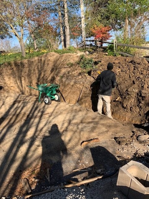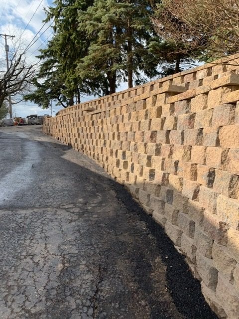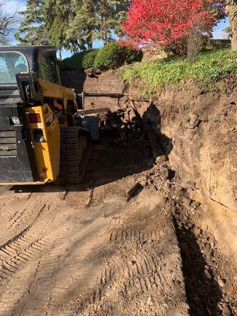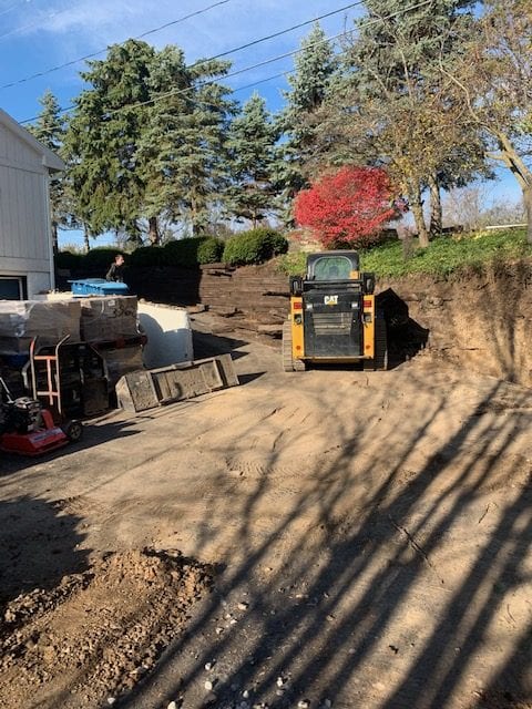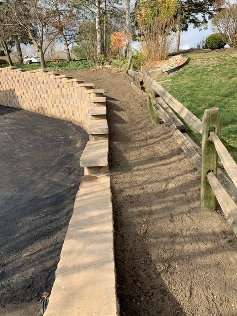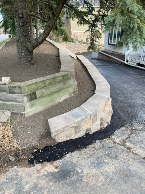 Ever look at a project and think to yourself “this is overwhelming!”? Here at A+ Home Improvements, our goal is to provide a level of confidence to our clients when they decide to tackle a project. In this scenario, our client wanted to replace their retaining walls. No biggie, right? Well these were not the typical retaining walls that typically come to mind. Our client lived down river road and had a narrow driveway that meandered down the side of a hill. One each side stood a large retaining wall. The original timbers used to build the wall were starting to fail, and something had to be done. Our client chose to install block instead of lumber. After selecting materials and staging the job site, we started in head first!