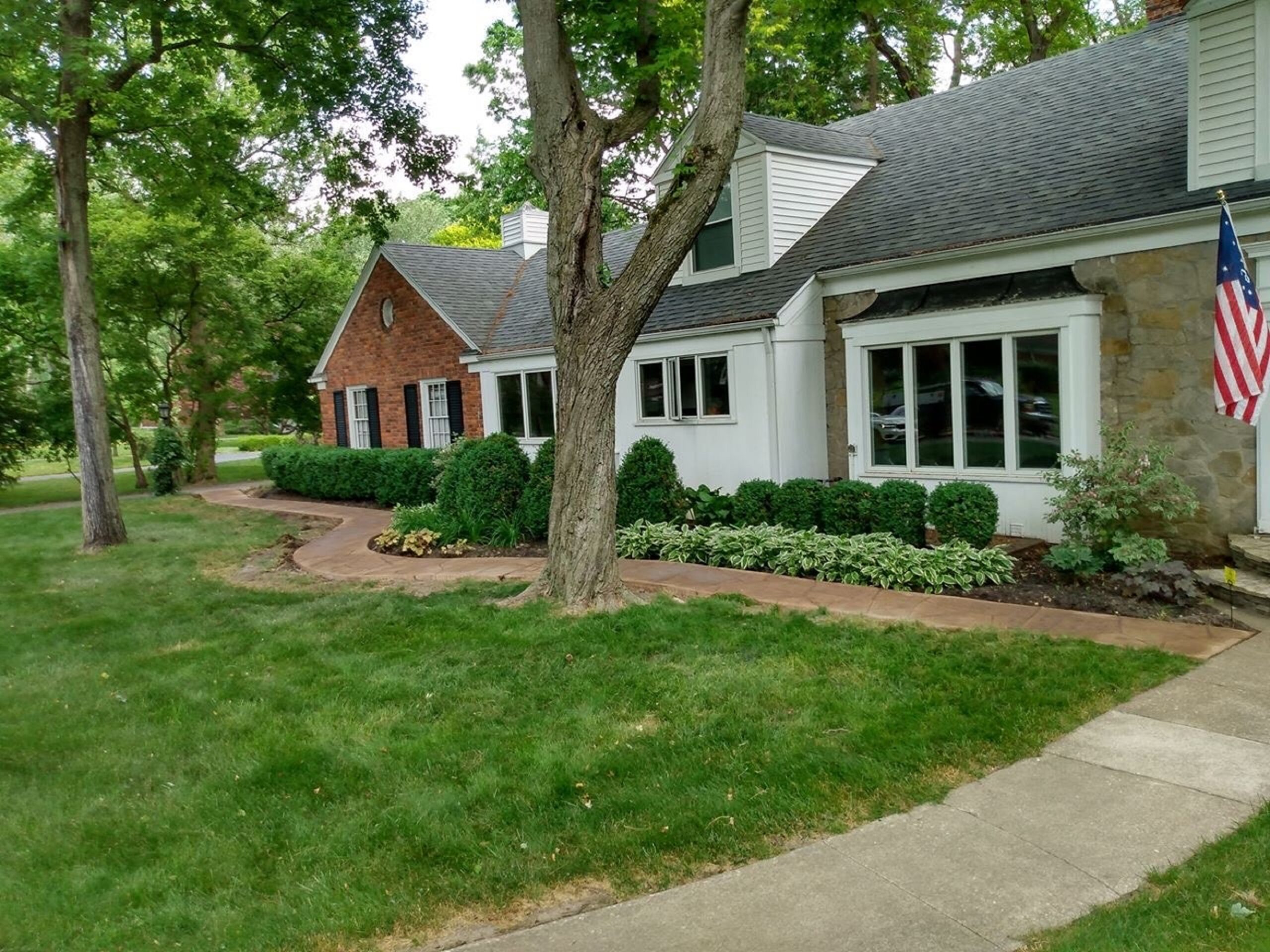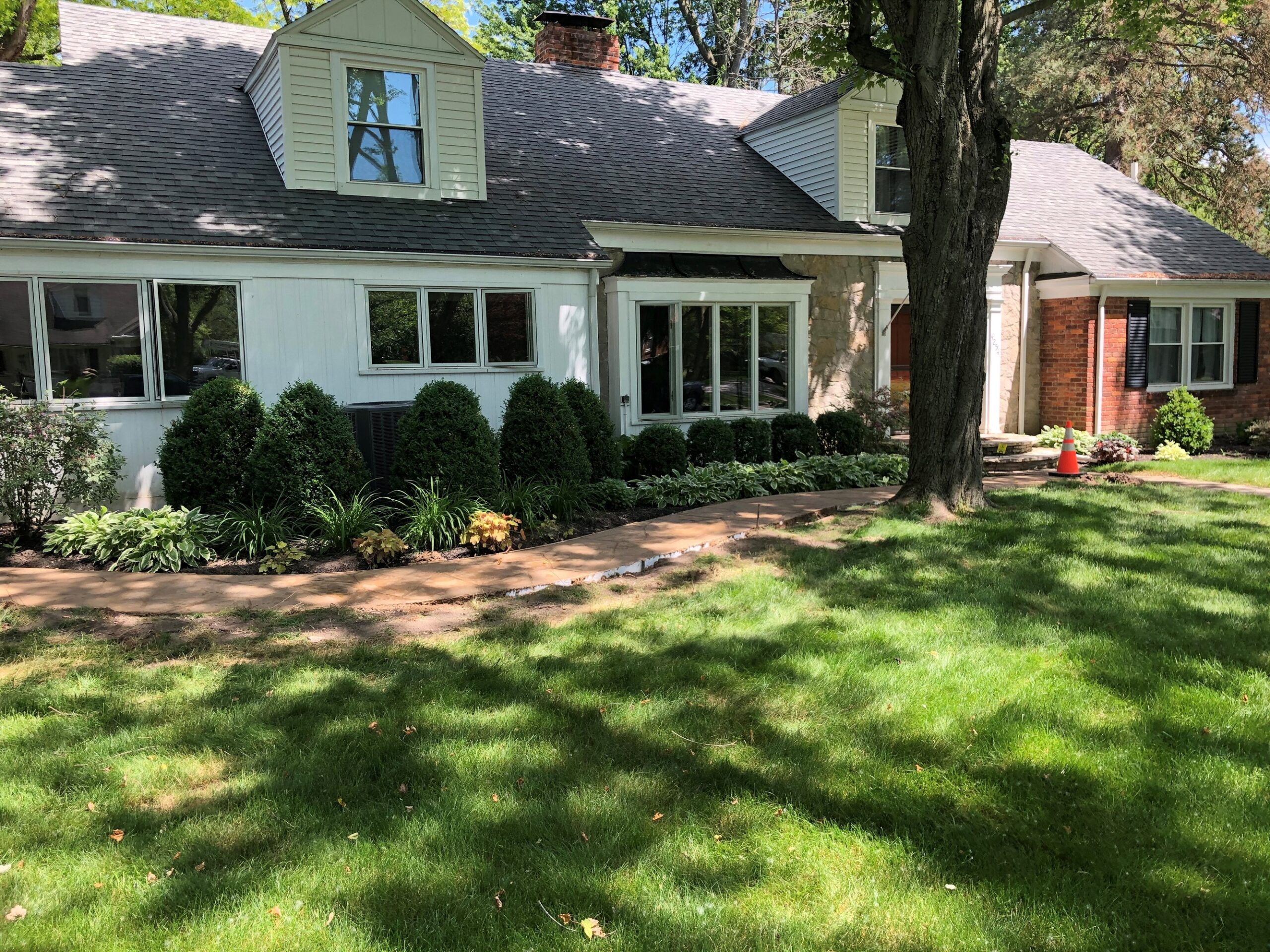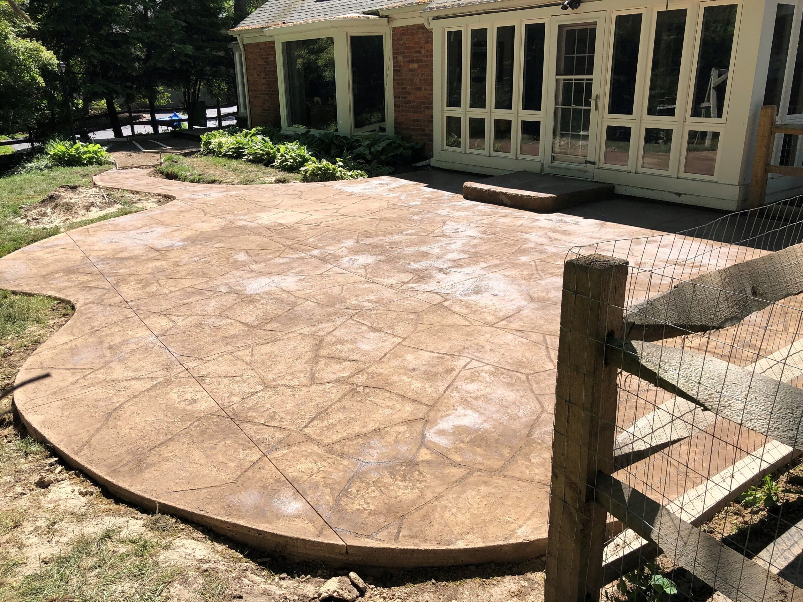 While the pictures show the concrete still curing, you can see how awesome of an area the patio created! To tie everything around the house together, we also replaced the front sidewalk with a stamped sidewalk to match. The pictures never seem to portray the amazing transformation that a new stamped patio provides. Now the dog had a yard to run in, and our client’s had the perfect perch to watch him from.