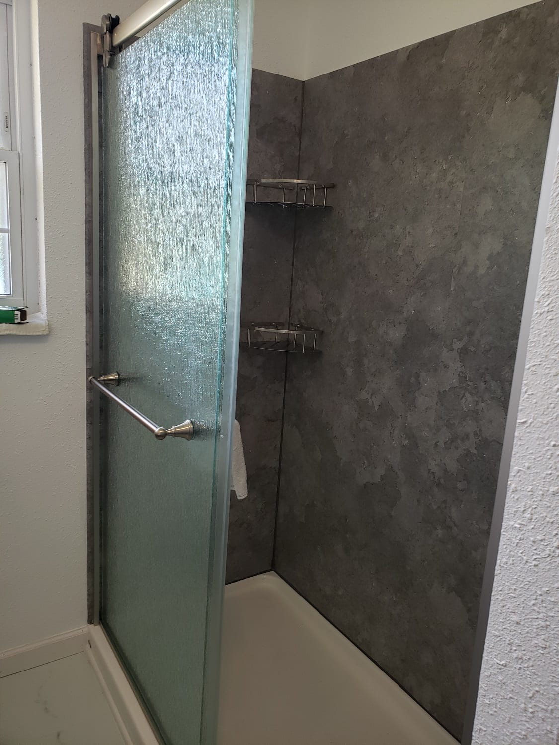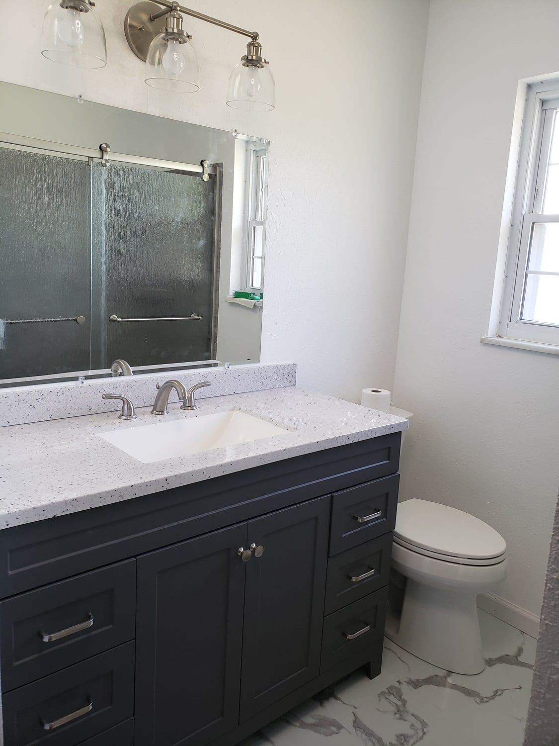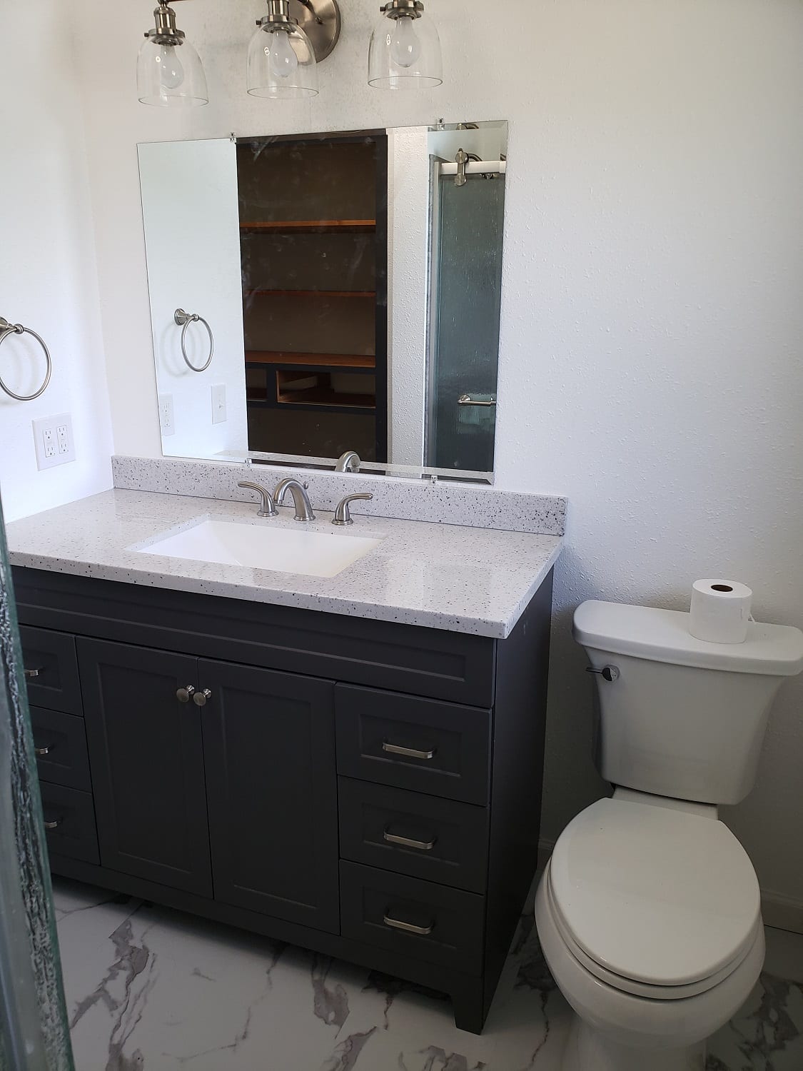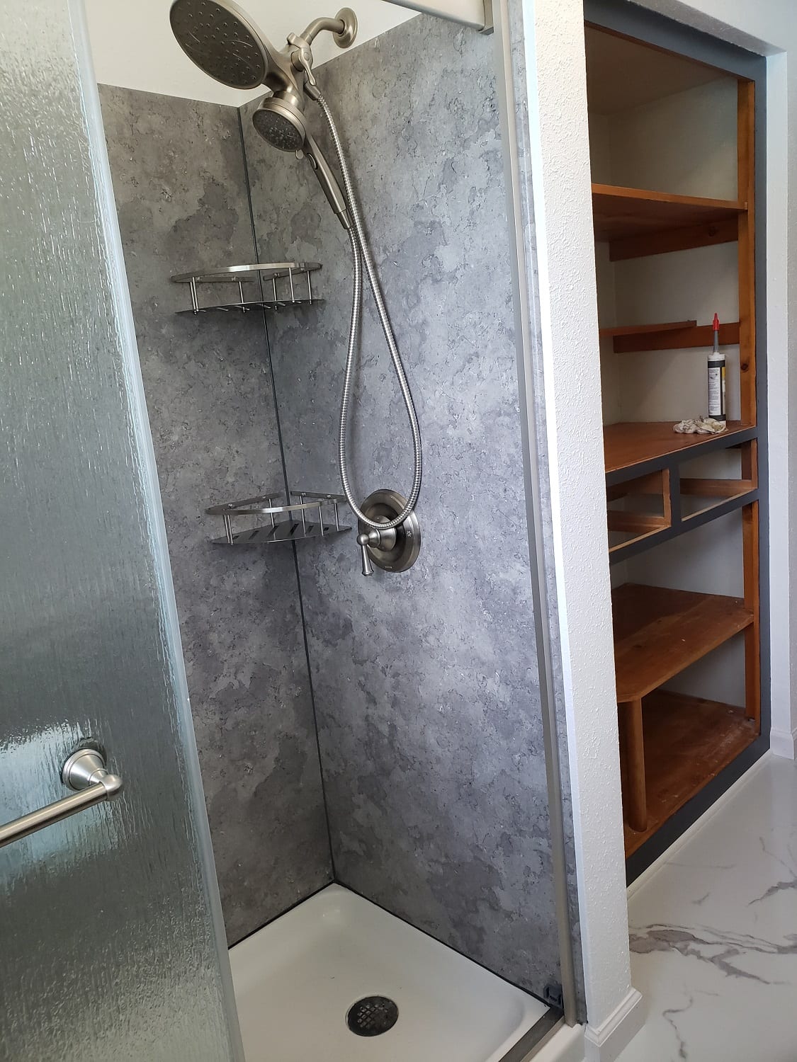 Definitely a big difference from the previous pictures! Our client opted to choose color selections from the gray family, which has been a popular choice over the last few years. It doesn’t even look like the same bathroom anymore. They chose to keep the built in shelving for storage, which allotted them more room to keep all of their items. With no real need for a tub in this bathroom, our clients switched to a walk in shower with a beautiful solid surface surround that is easy to clean and really stands out. They also chose a marbled gray and white flooring that pulled the whole look together!