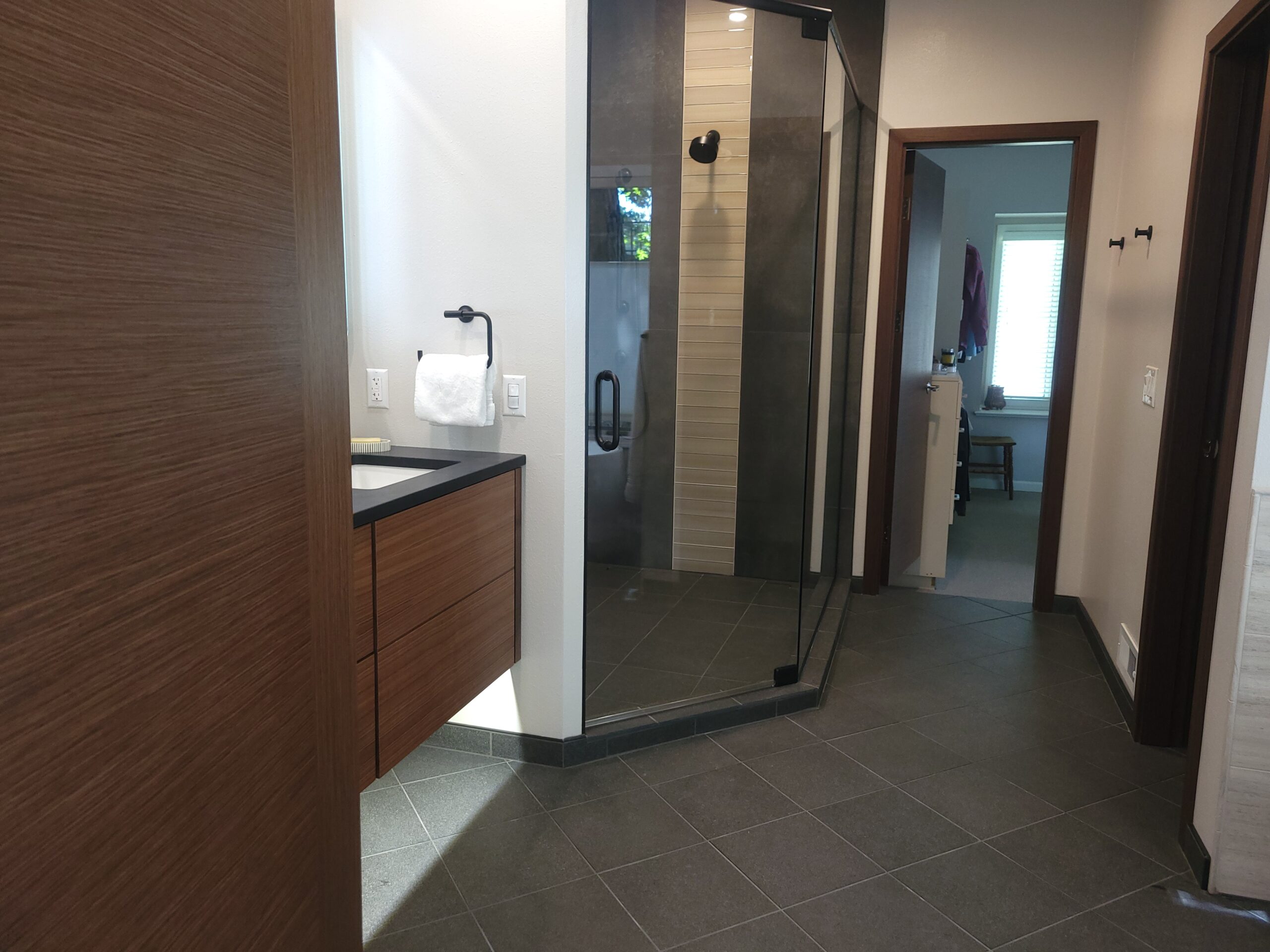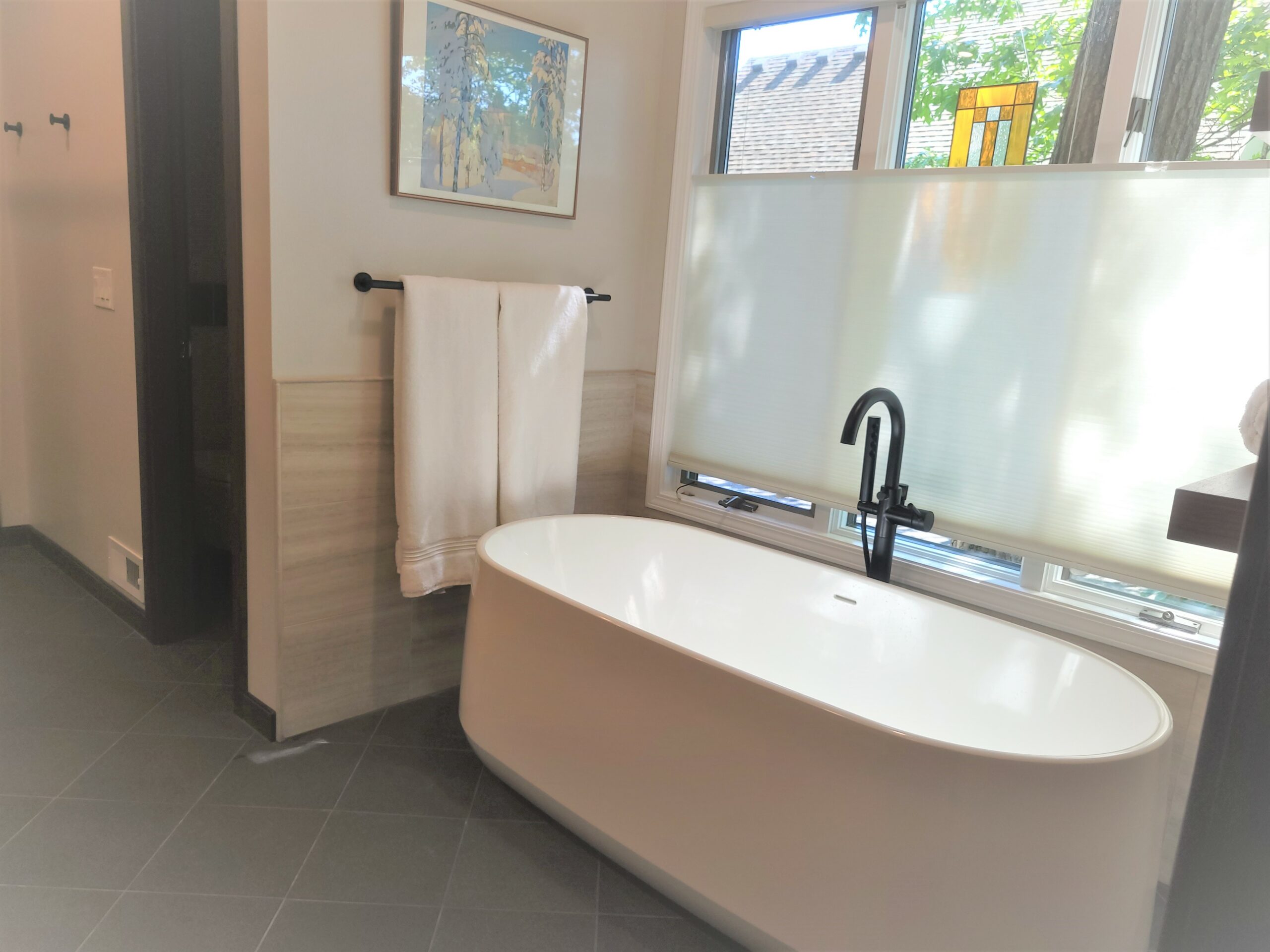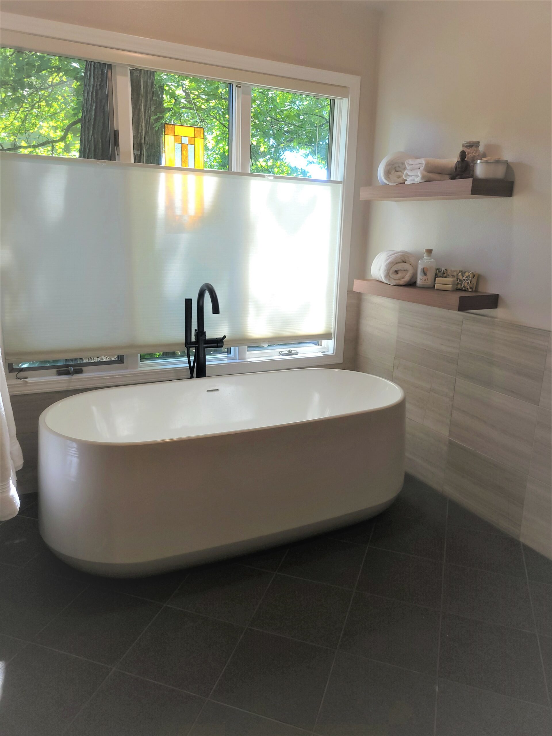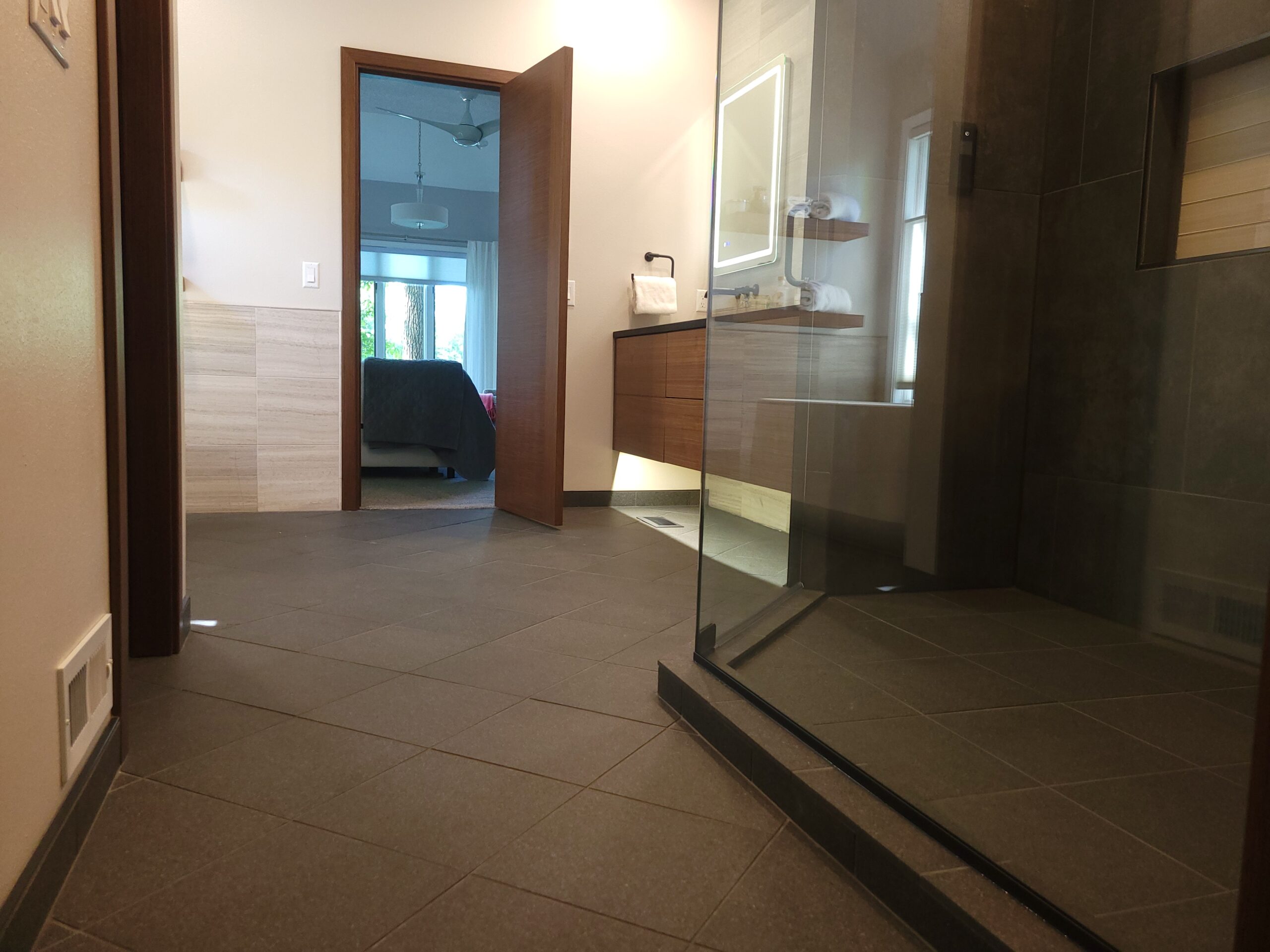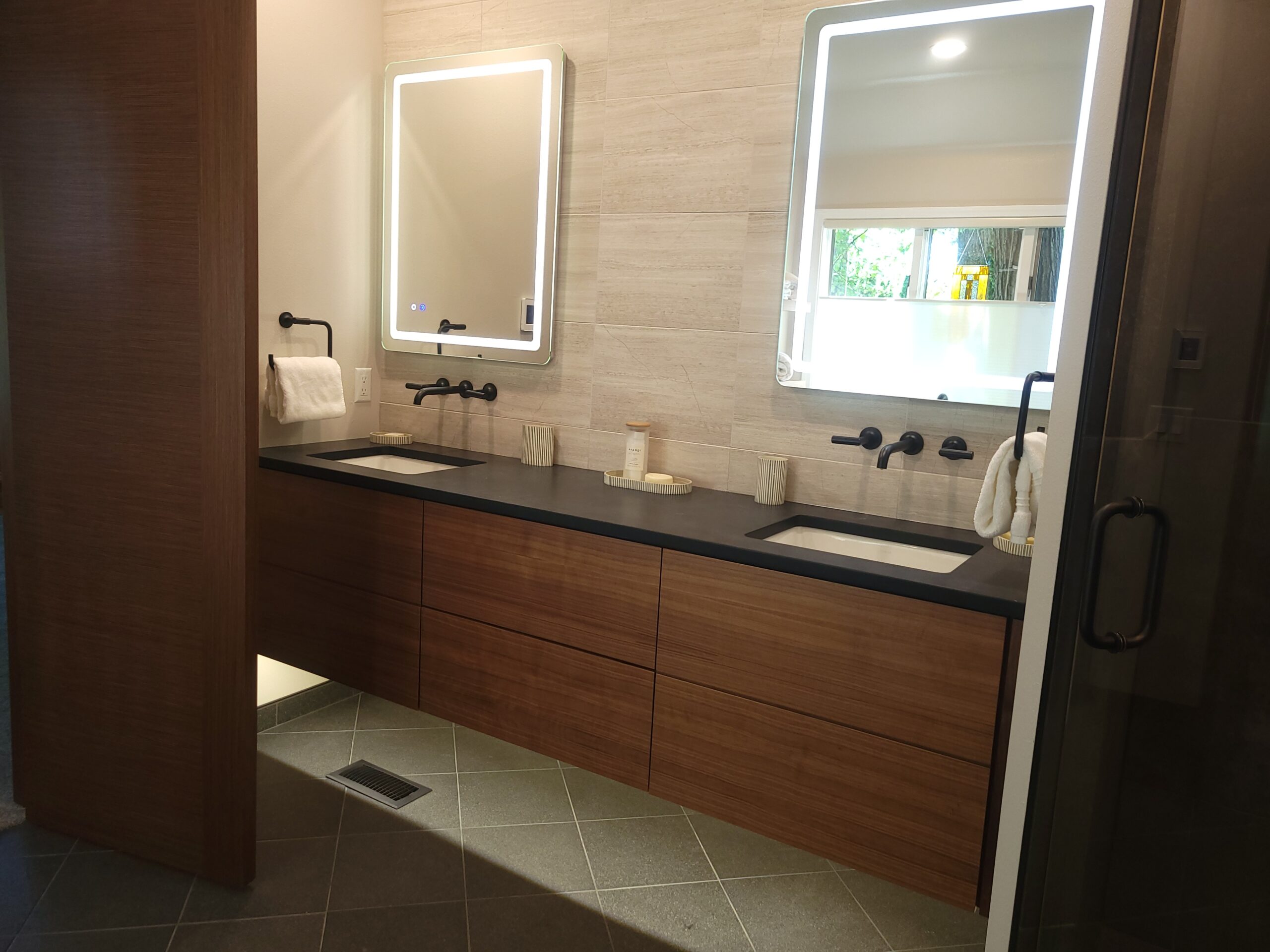 For the vanity, we likewise wall mounted the unit and installed motioned controlled under vanity lighting. This allowed our client to enter the area at night with a light ambient glow as opposed to a sleep-wrecking bright light. The addition of integrated led mirrors and lighting provided plenty of light for the new bathroom. We utilized the area in front of the large window to position an elegant free standing tub and tub filler. The final touch consisted of a the tiled floor. We installed electric floor heat with a touch screen programmable thermostat. This bathroom contained it all!