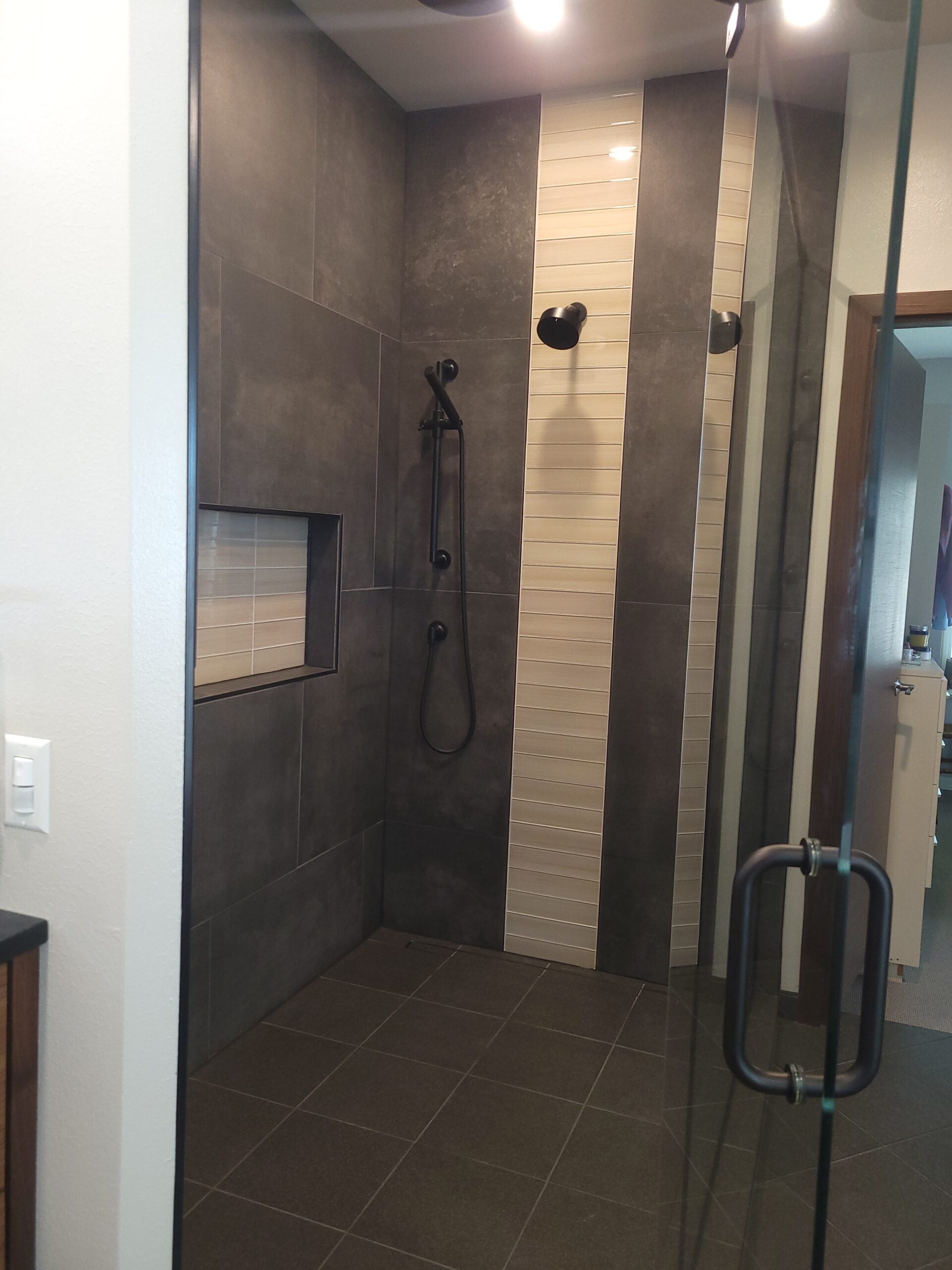 If the pictures don’t already say enough, let us walk you through the concept. The existing bathroom consisted of an dated, large soaking tub. The toilet location used to be situated where the new shower enclosure now exists. Our clients desired a huge shower, and the new space delivered! The shower faucet consisted of a manifold controlled by an electronic switch system, offering a unique and elegant way to control the different shower water sources. To create some privacy, we framed a new toilet room to close of the space from the rest of the bathroom. The home owner also wanted a clean toilet area, so we installed a carrier mount and wall mounted the toilet.