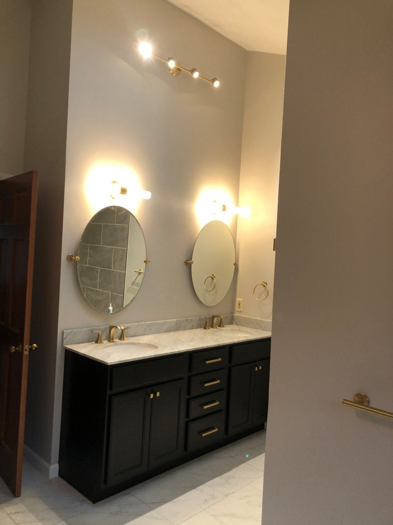 See the bulky soffit that appears to swallow up the vanity location? This had to go! We deleted the soffit and added some accent track lighting to totally change the look of the space. Out with the old mirror, in with an elegant his and hers setting. Notice the floor – the existing tile was definitely dated. Our client chose a gorgeous white/gray marbled tile that pulled every facet of the new space together. Now that we deleted the shower, where will the new one go? Well, that’s where the fun part started!