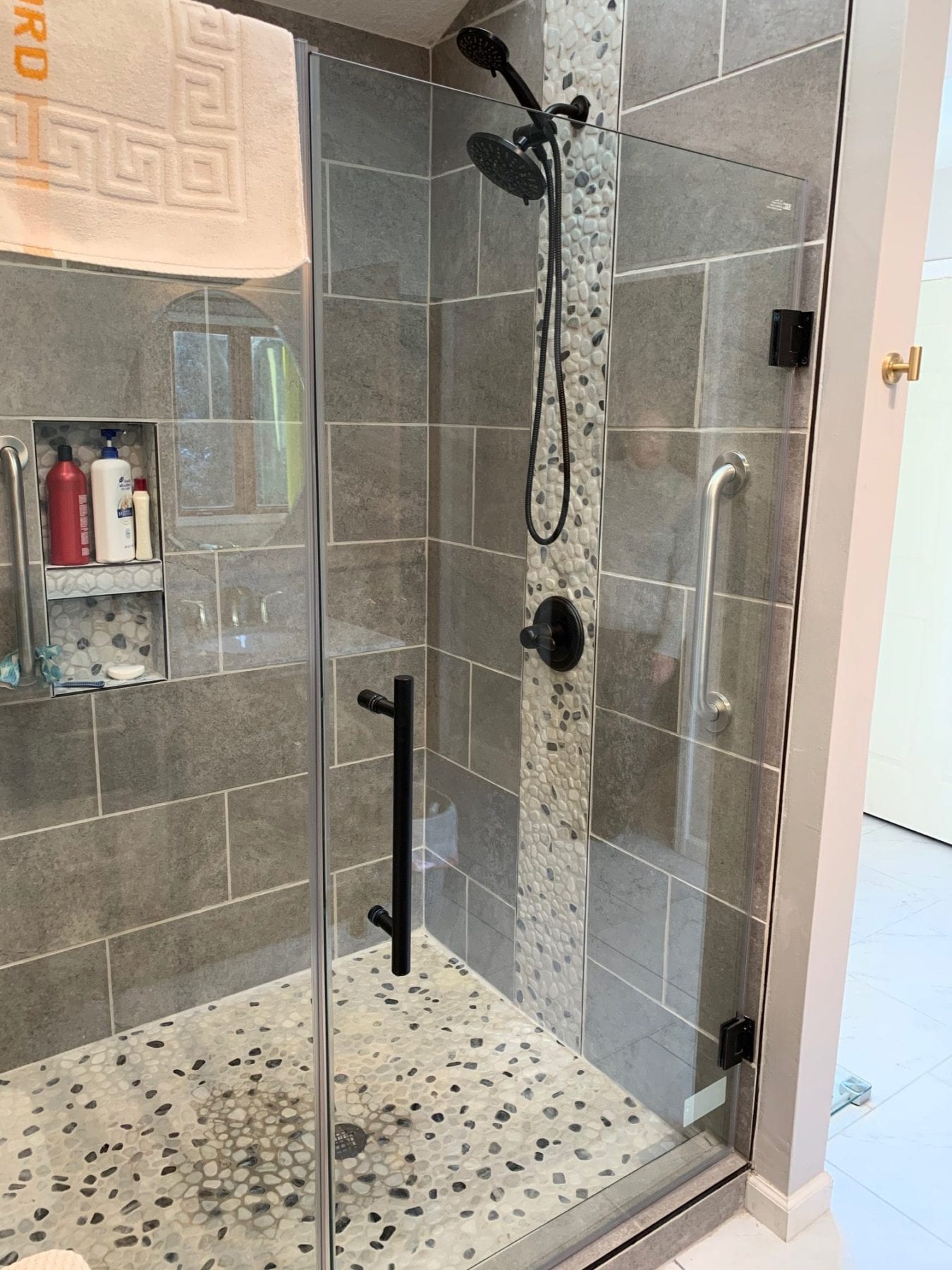 The focal point of the old bathroom layout was a dated, worn out roman tub. To create a new atmosphere, the tub was deleted and we framed a 72″ shower in its place. This custom tiled shower contained a convenient bench, recessed shampoo niches, a stunning pivot shower door, and, of course, contemporary tile to really set it off! The gray tile used for the surround paired perfectly with the pebbled gray/black/white floor to give a one of a kind look. To add a little more character, we installed a matching tile water fall feature at the faucet wall that added a touch of pizzazz. To avoid dark shadows, we installed recessed lighting above the shower enclosure to provide the perfect amount of accent lighting. Our client loved it, and we were equally excited to see the end result of this project.