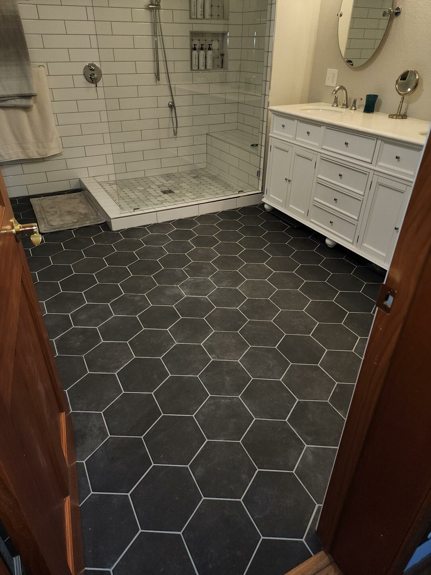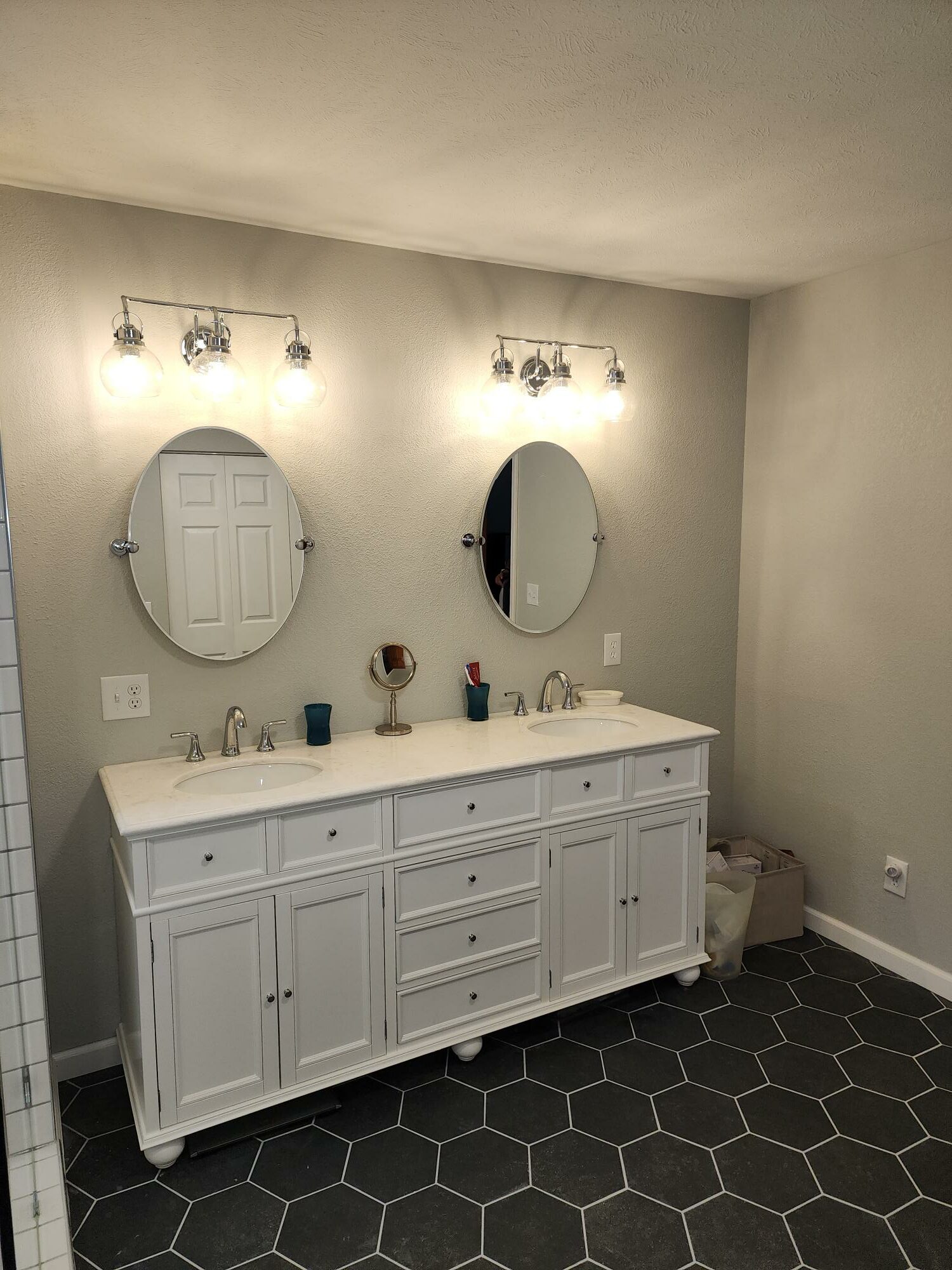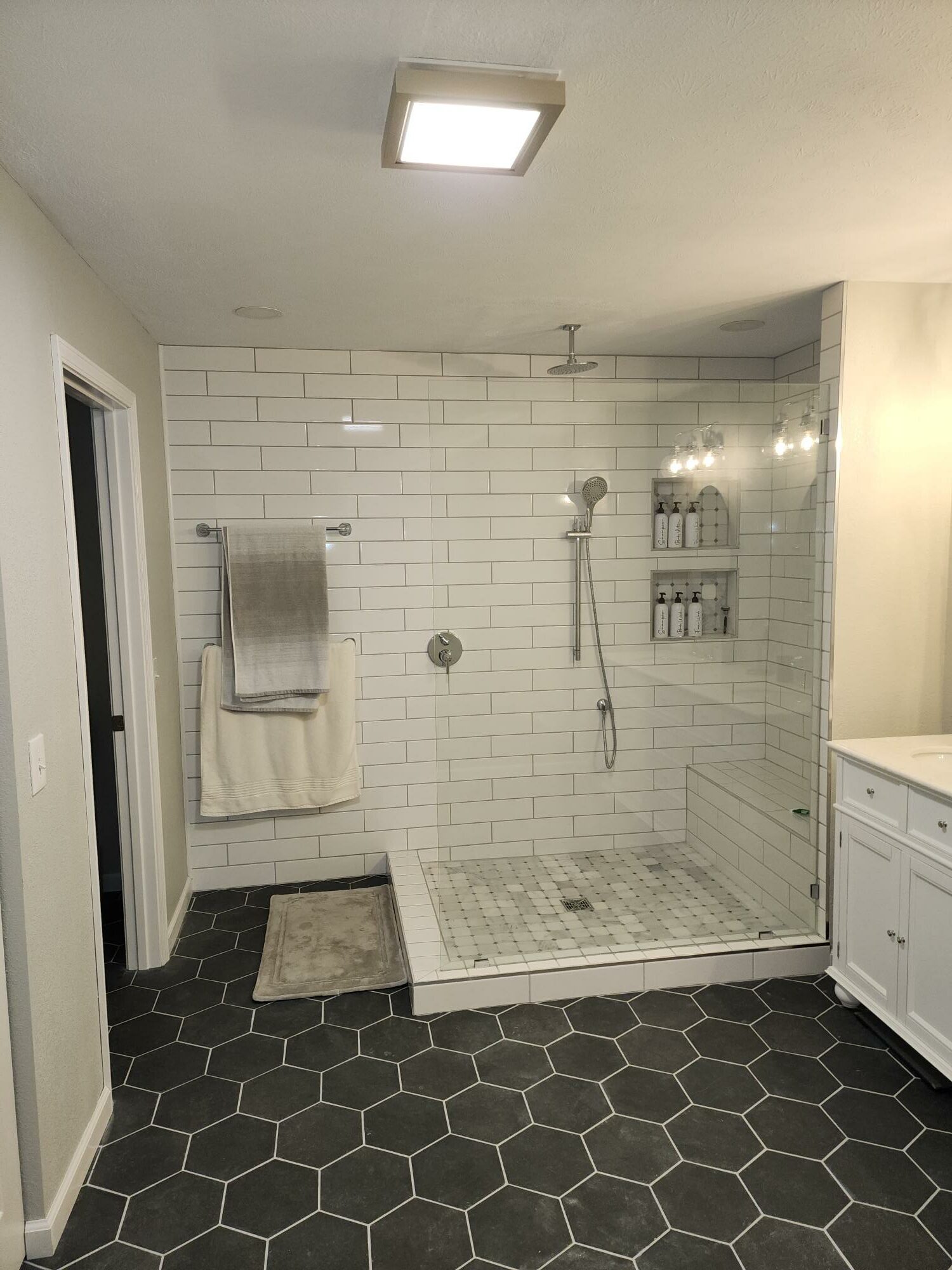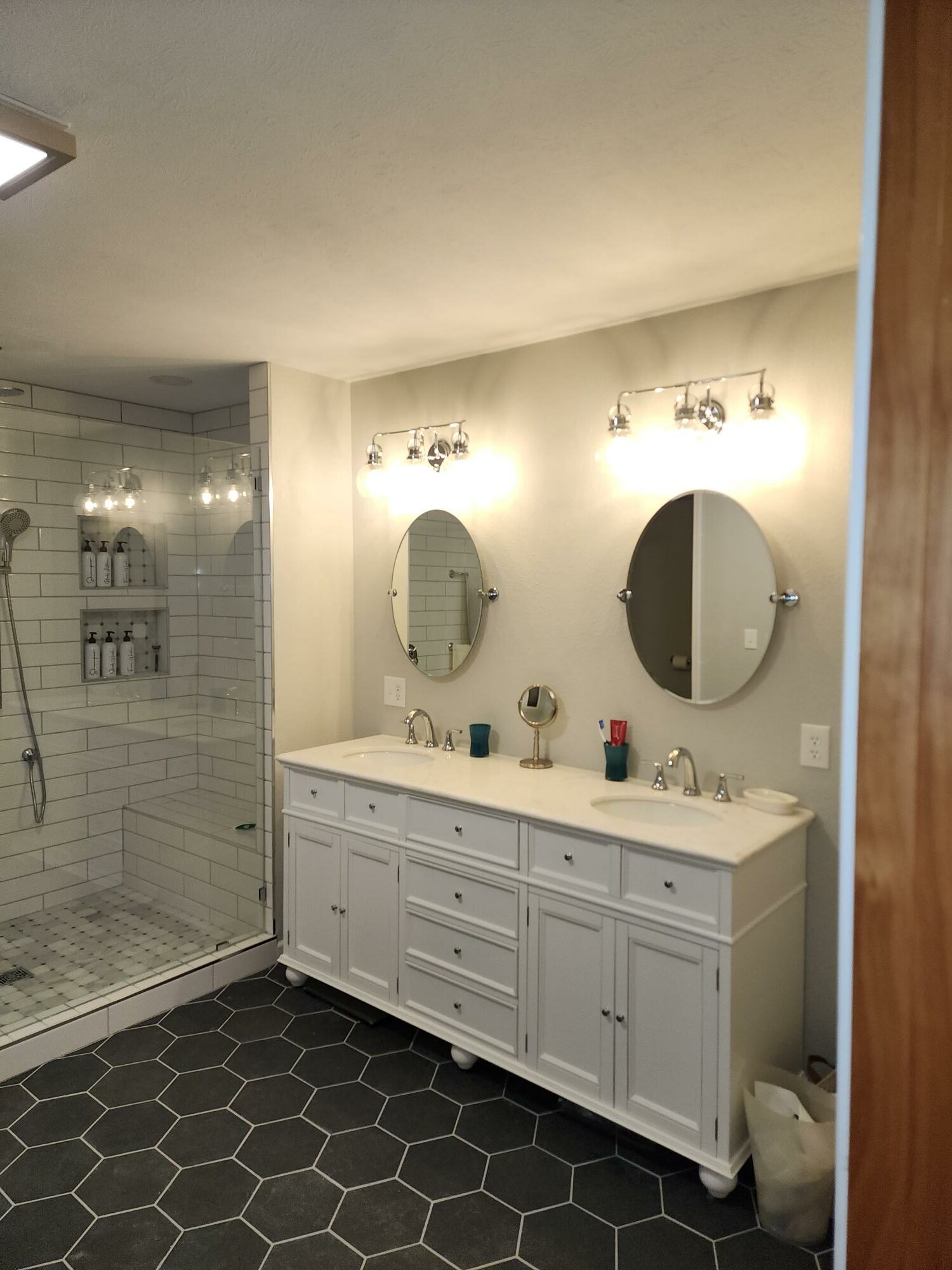 It doesn’t even look like the same bathroom! No we turned our attention to the rest of the master bathroom suite. We installed new led lighting and fixtures centered around a beautiful new double vanity. To pull the look together while adding contrast, we installed a dark gray hexagon tile floor. This project was an absolute blast to complete for our client!