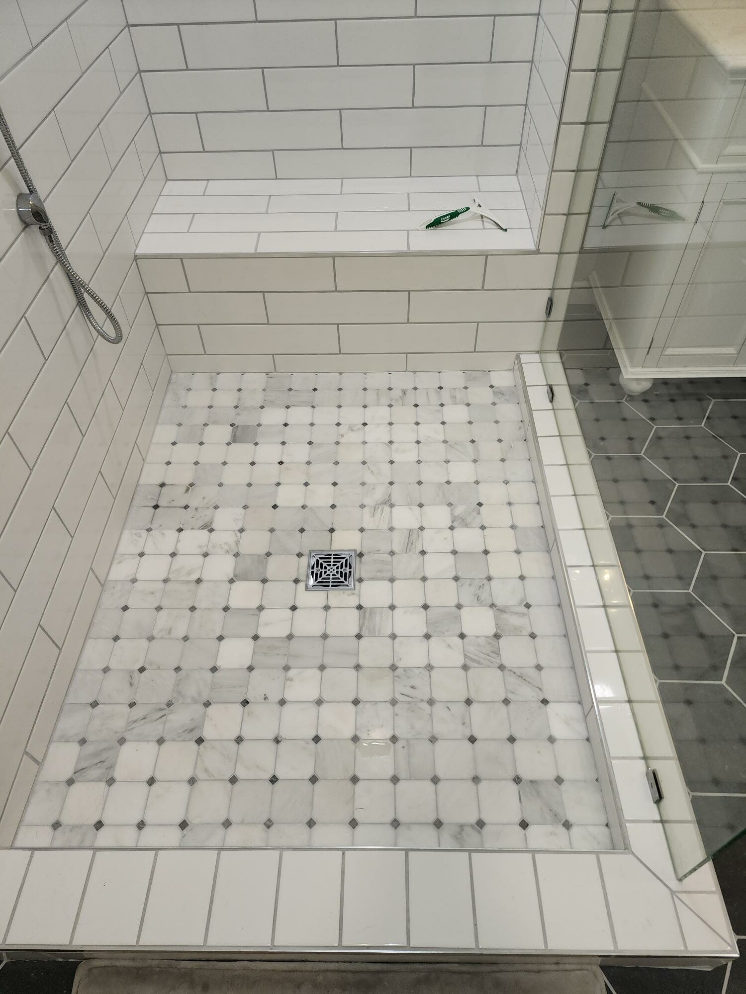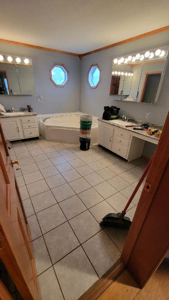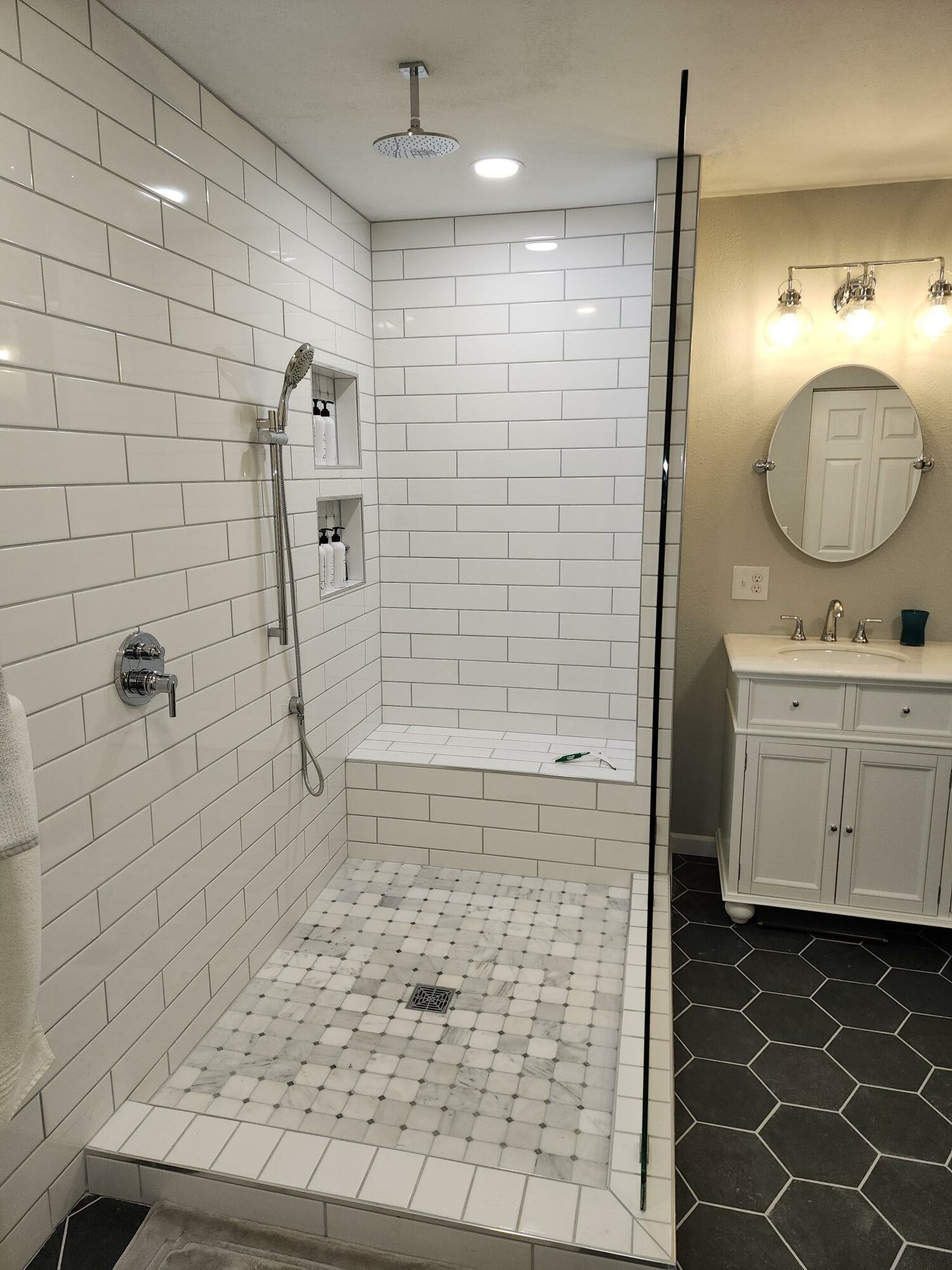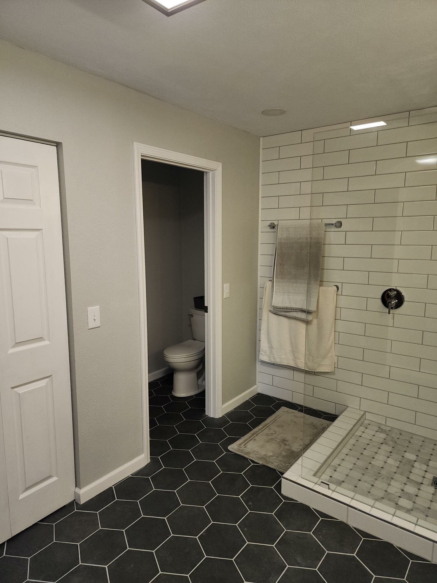 It doesn’t even look like the same bathroom! No we turned our attention to the rest of the master bathroom suite. We installed new led lighting and fixtures centered around a beautiful new double vanity. To pull the look together while adding contrast, we installed a dark gray hexagon tile floor. This project was an absolute blast to complete for our client!