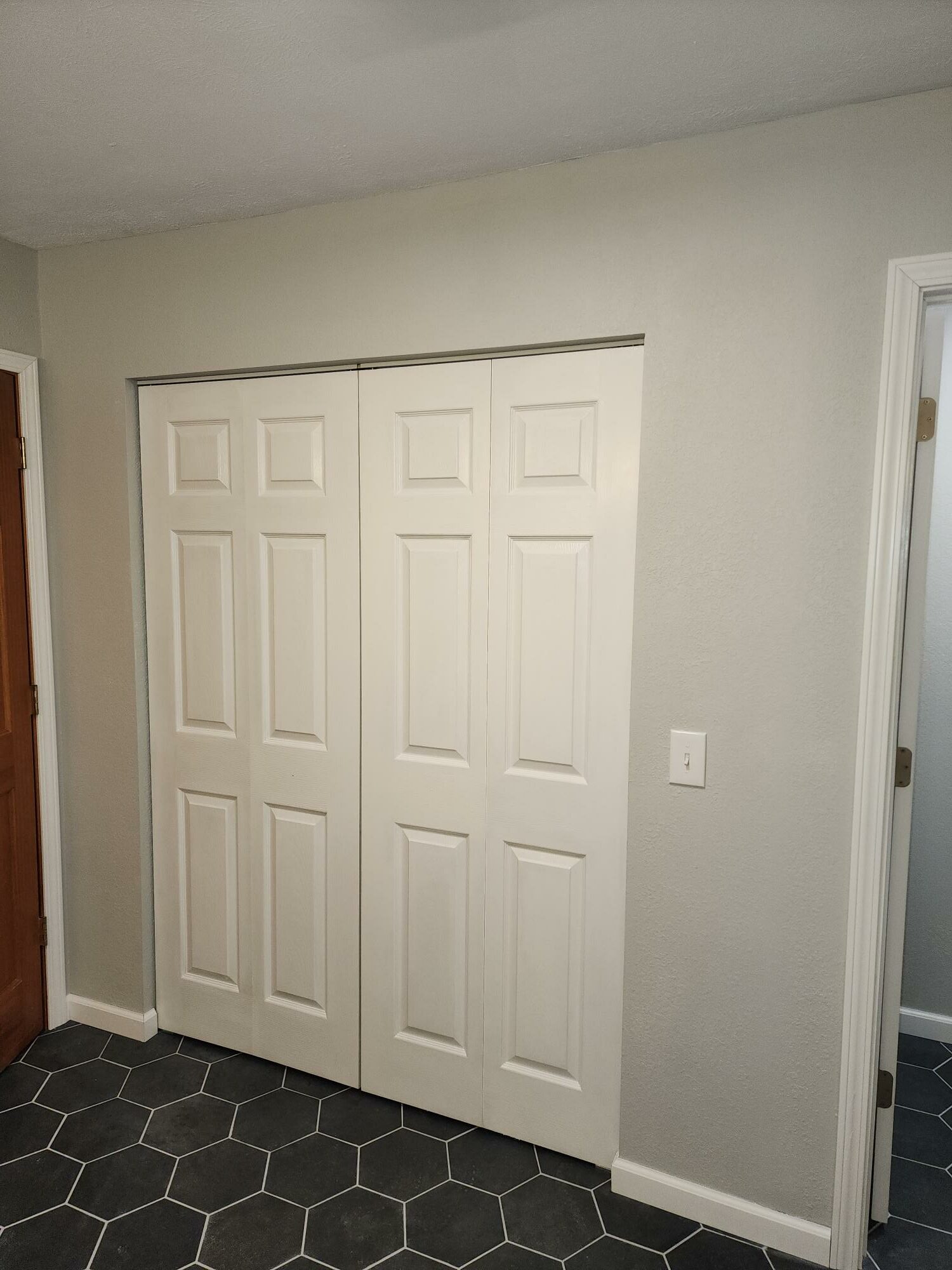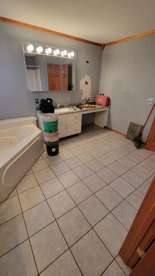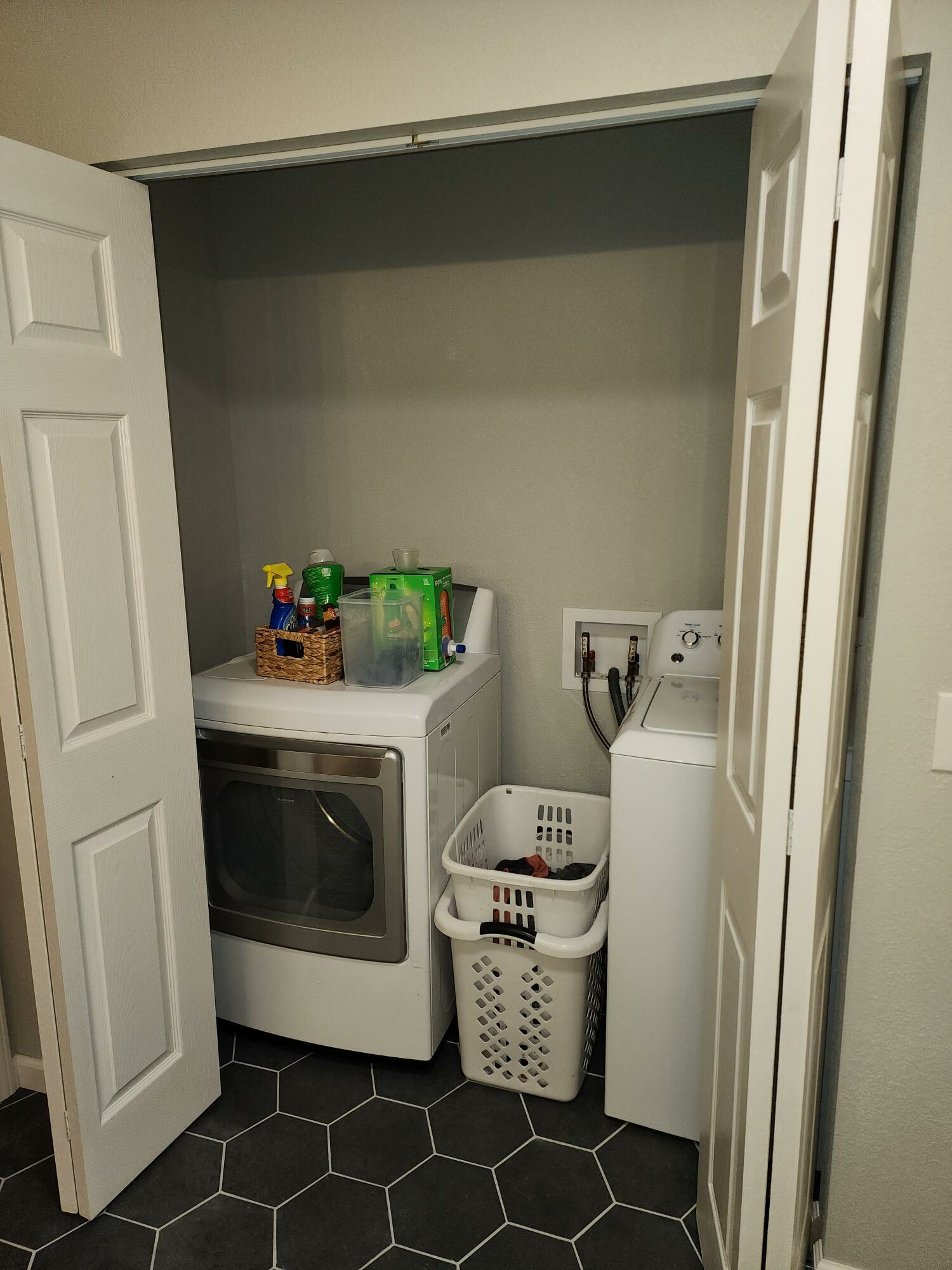 Hey everybody, welcome back to another A+ Home Improvements’ project! We love all of our renovations, but some stand out a little more than others. Our next client’s master bathroom offered a large space, but it was not conducive to our client’s lifestyle. A large, unused corner tub separated two individual vanities, creating an unorganized space. The bathroom also contained a dated shower enclosure and worn tile flooring. Our client desired a true master bathroom suite. A big must for our client entailed incorporating a laundry area into the space without creating an eyesore. To accomplish this, we deleted the existing shower enclosure and framed for a laundry room that could be closed off to the rest of the bathroom. Take a look at the before and after pictures of the laundry area: