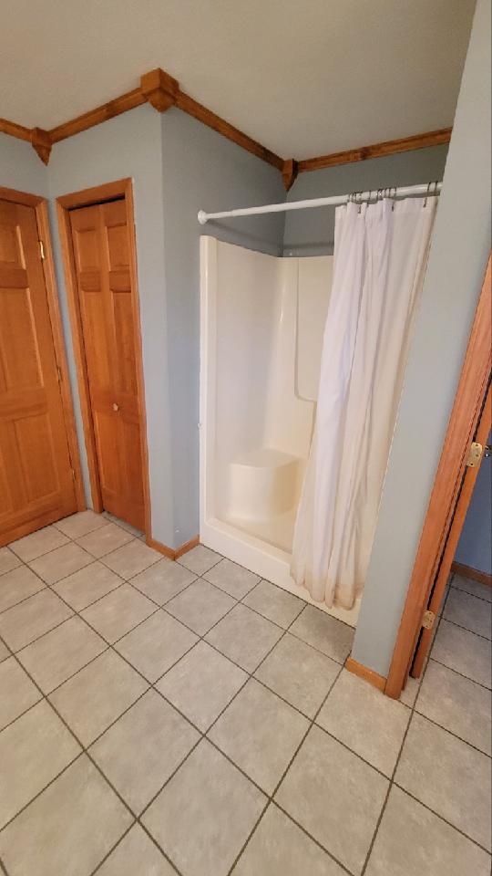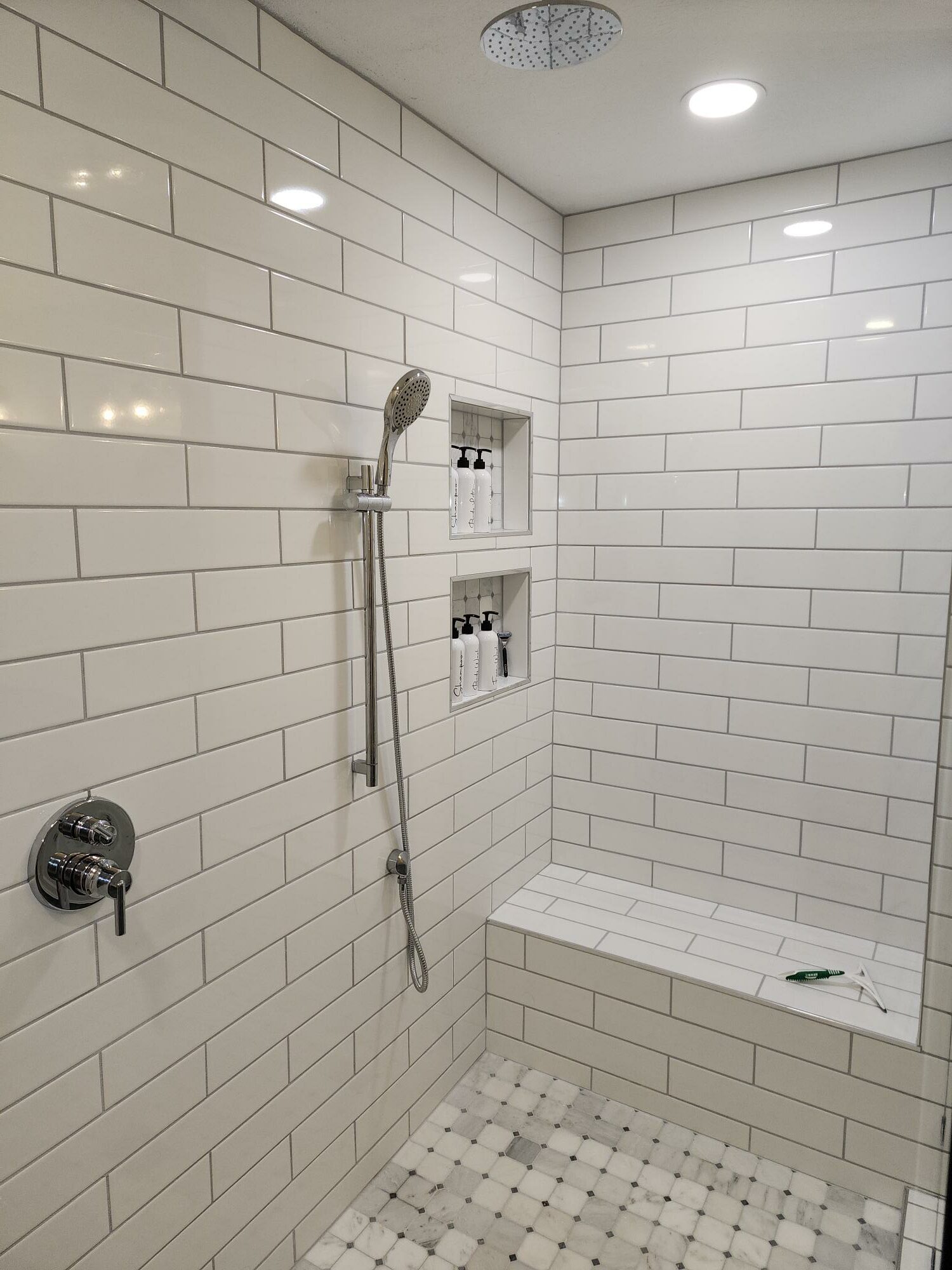 All kinds of wasted space! To accomplish our goal of a large shower, we deleted the two windows and pieced in the siding. We framed out the exterior wall to accommodate our new shower plumbing while simultaneously giving us room for additional insulation. The new shower contained a ceiling mounted rain shower along with a handheld shower head for versatility. We incorporated a tiled bench, and installed a glass panel that allowed for simple walk-in access for the home owner. The results were stunning!!
