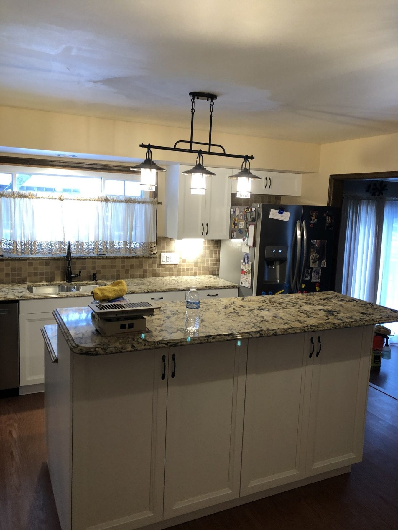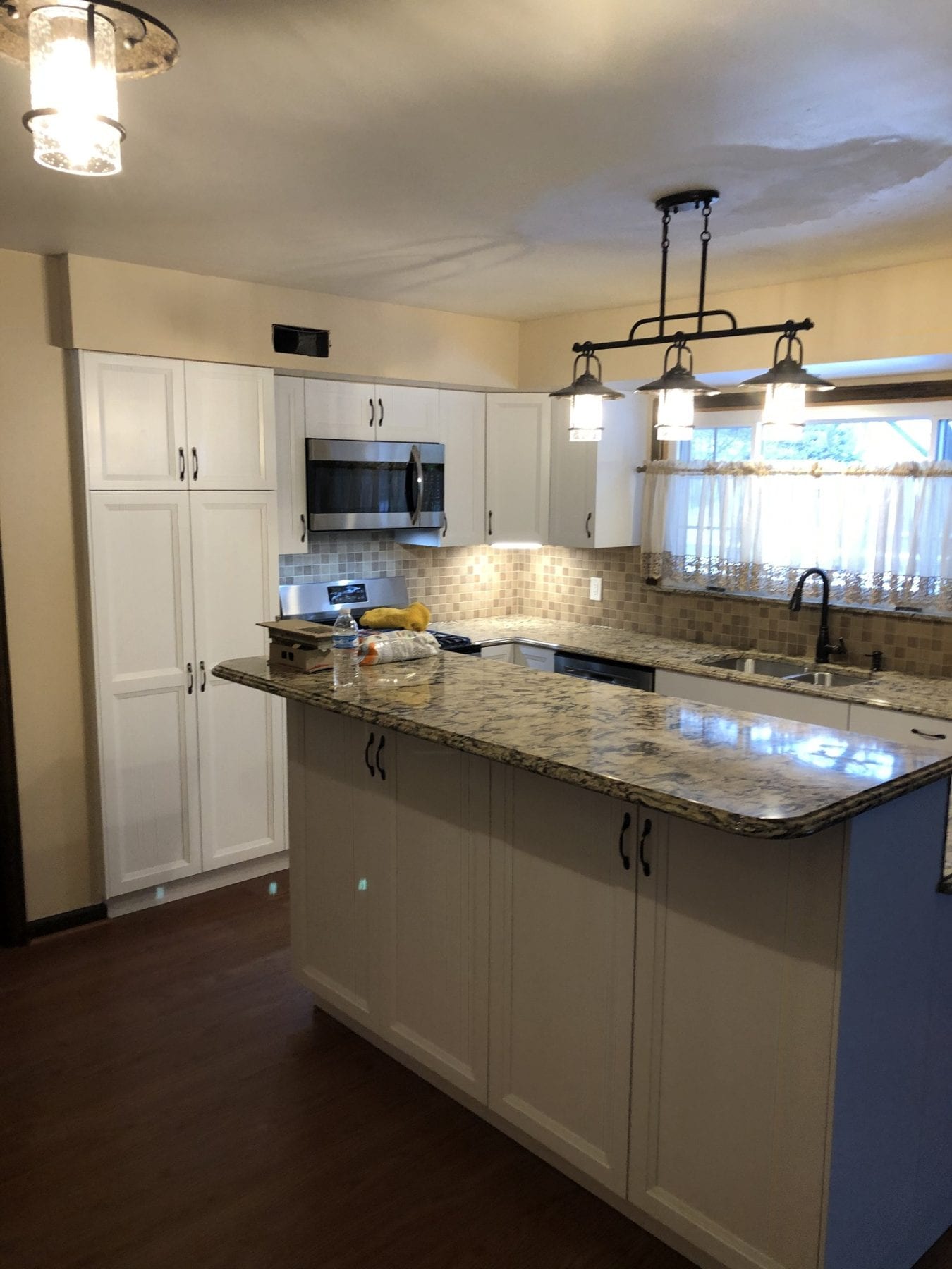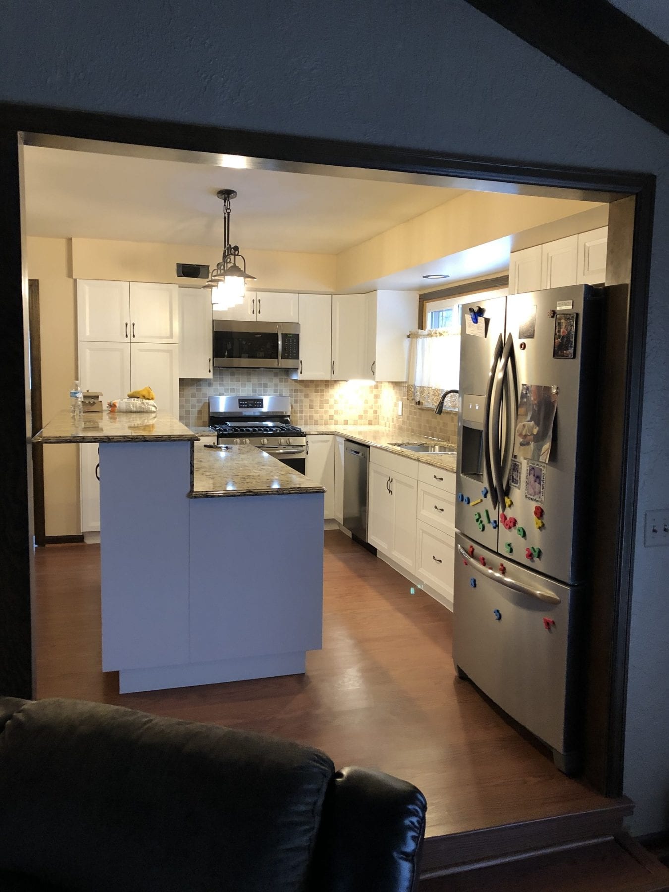 This space is fairly common in homes, but this shows that maximizing your kitchen space can be done. The raised island provides extra seating, as well as additional counter space to utilize. The light that the customer chose is perfect and fits well with the design. To cap off the project, we installed a tile back splash that helped pull all of the colors in the kitchen together. The kitchen ended up being exactly what our client was shooting for. Many options exist, and are limited only by your creative imagination.