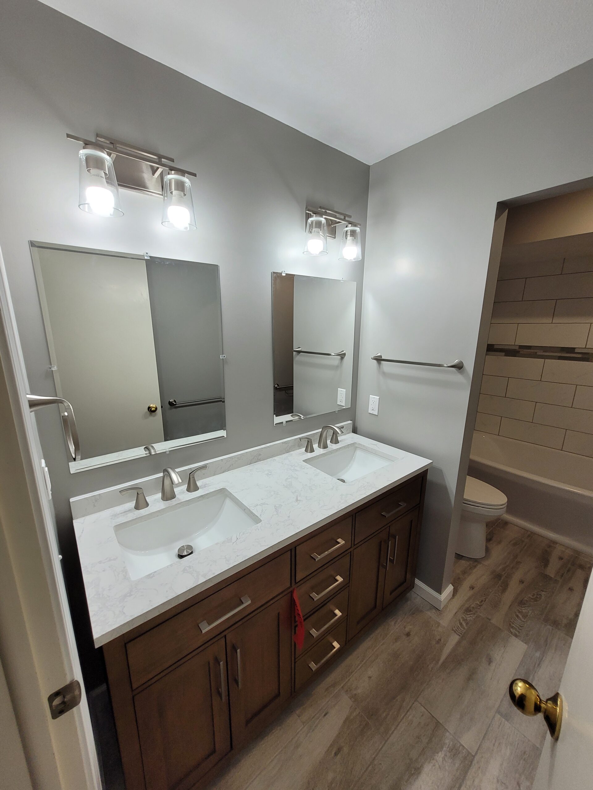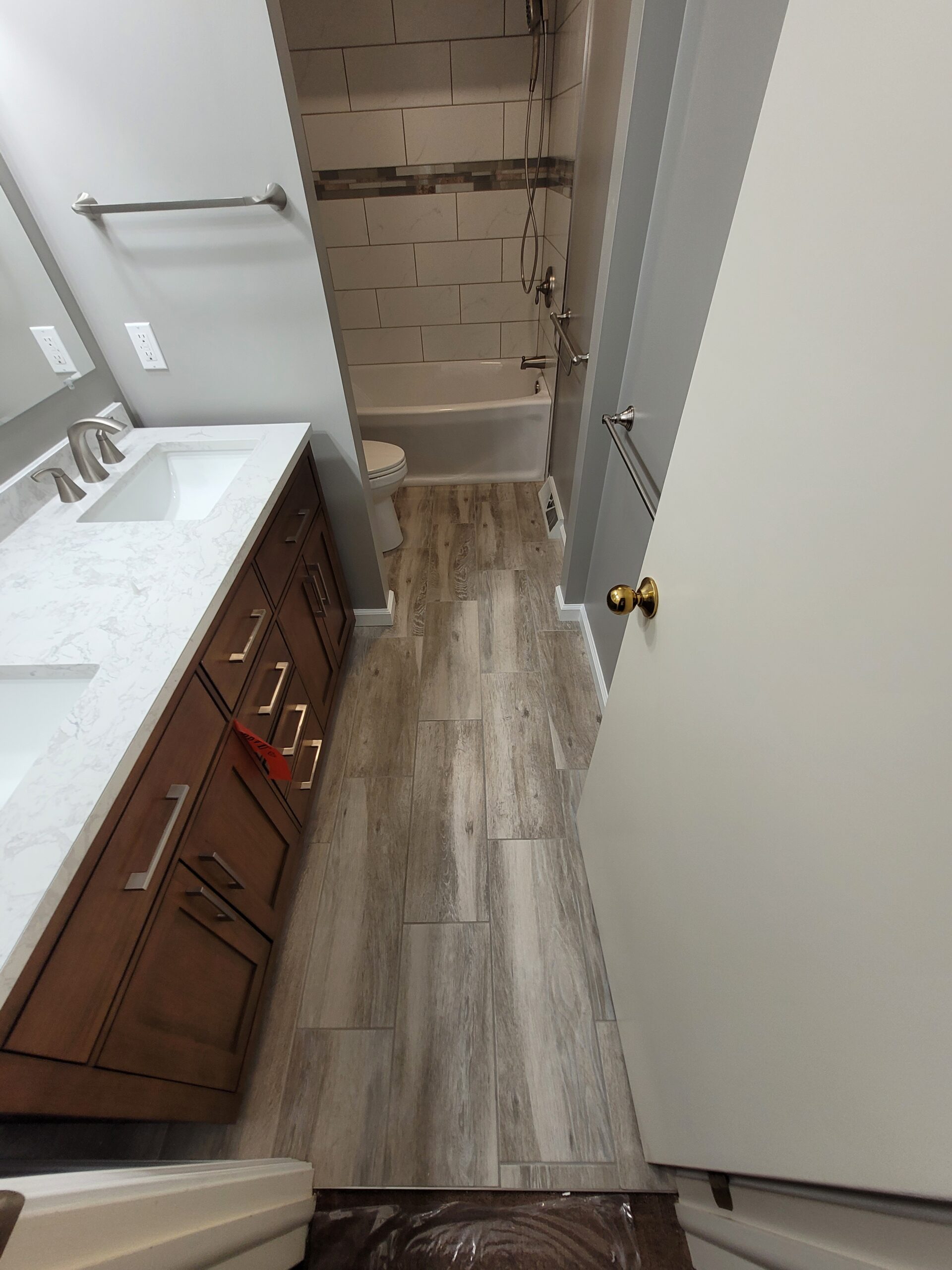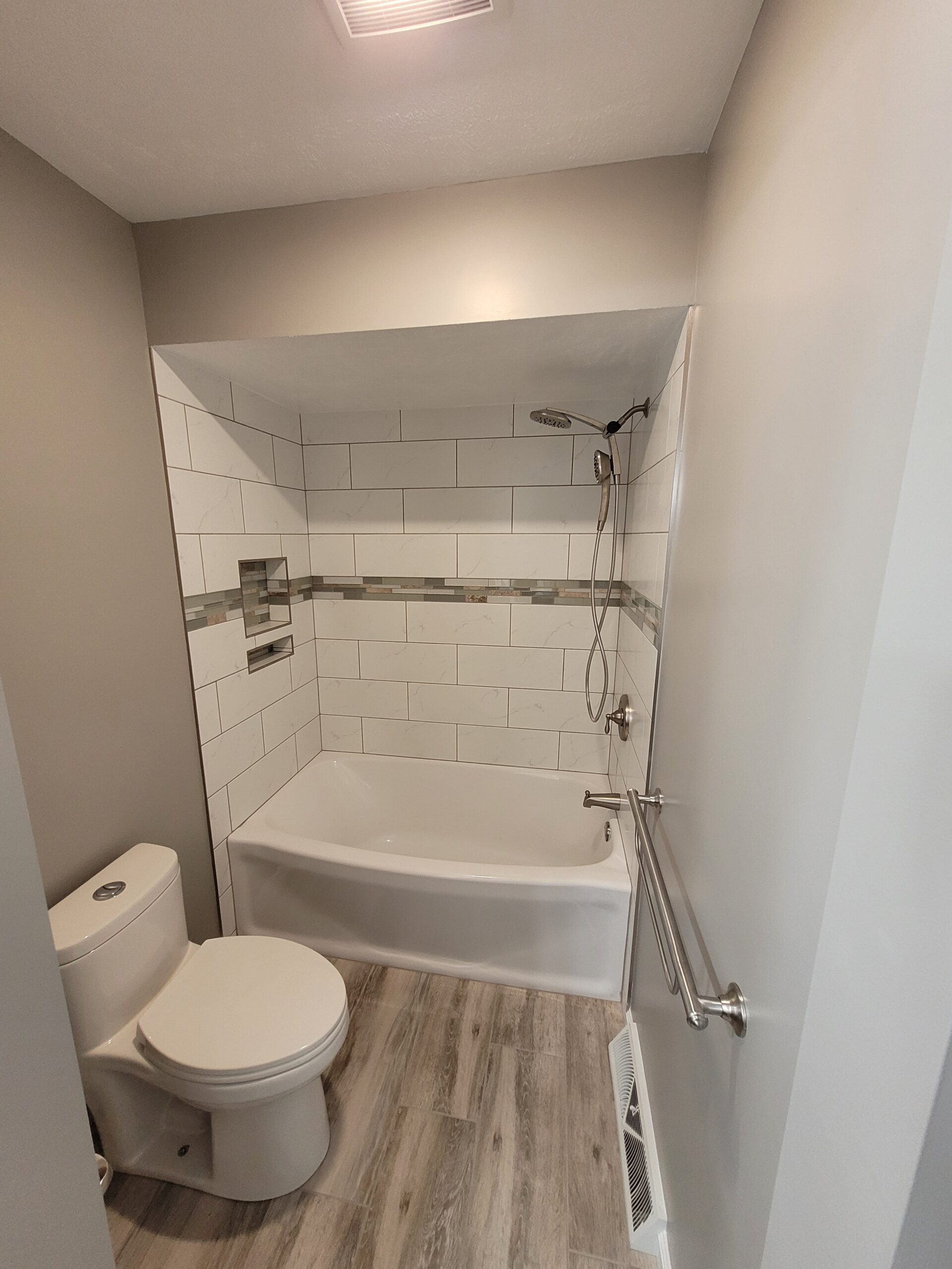 While functional, the space definitely needed an update. Our client opted for a slightly smaller vanity to create a free-standing feeling as opposed to a traditional alcove vanity setup. We also updated the flooring and fixtures as well. The main change, however, centered around the shower enclosure. To create more room, we deleted the bump out at the left of the existing enclosure. This allowed us to install a standard 60″ tub in its place. We installed a tile surround with a tile accent ribbon that helped pull the other colors of the bathroom together.