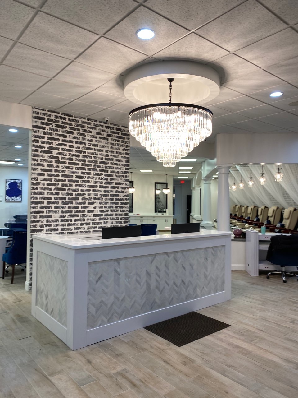 Our client desired a certain look for their refurbished spa. They selected a Retro-Brick brick veneer to cover the walls behind the seating stations. To further add a pop of color, we accented the darker brick with white grout and purposefully did it a little “messy” to give a white-washed feel. We even installed it at the wall directly behind the service desk to catch the eye of clients when they first walk in. To accent the project and brighten the space, we installed beautiful, crystal laden pendant lights above each station. The last touch was installing a gorgeous chandelier over the welcome desk that created a luxurious vibe. The results were perfect, and we look forward to the owner and clients enjoying the space for years to come.