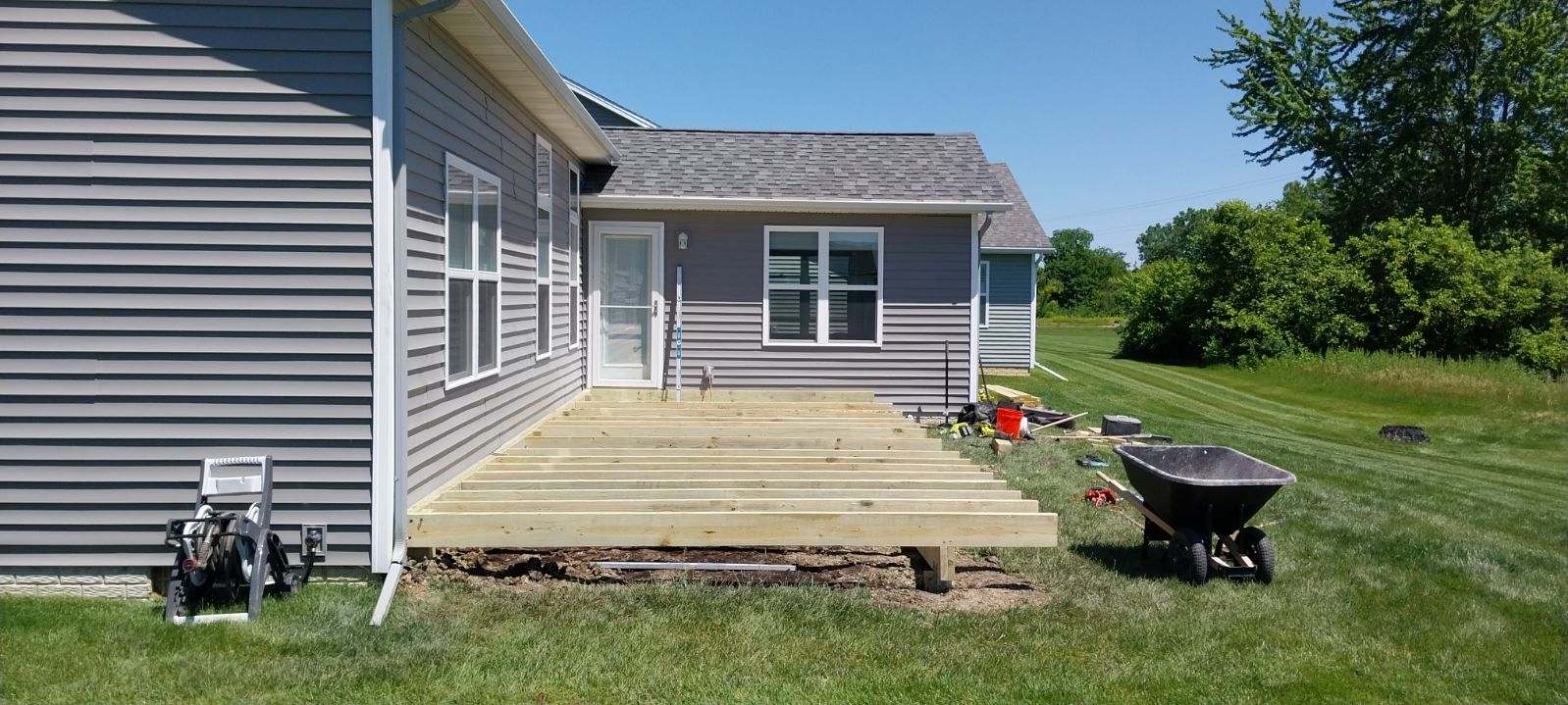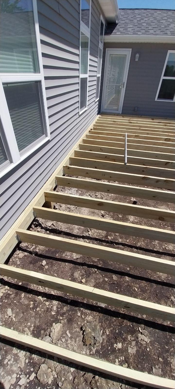 A+ Home Improvements continues to knock out projects this summer! Our next client desired a new deck to replace their concrete patio. The existing patio was small and didn’t suit their needs. Being able to step out onto the deck without stepping down represented a huge must for this home owner. With that in mind, we drew up the plans and got our client’s seal of approval to get the ball rolling. To alleviate the need to remove the concrete patio, we cut sections out to provide room for our new footers. Although not required in this situation, our client opted for a handrail to be installed as well. Let’s see the progress: