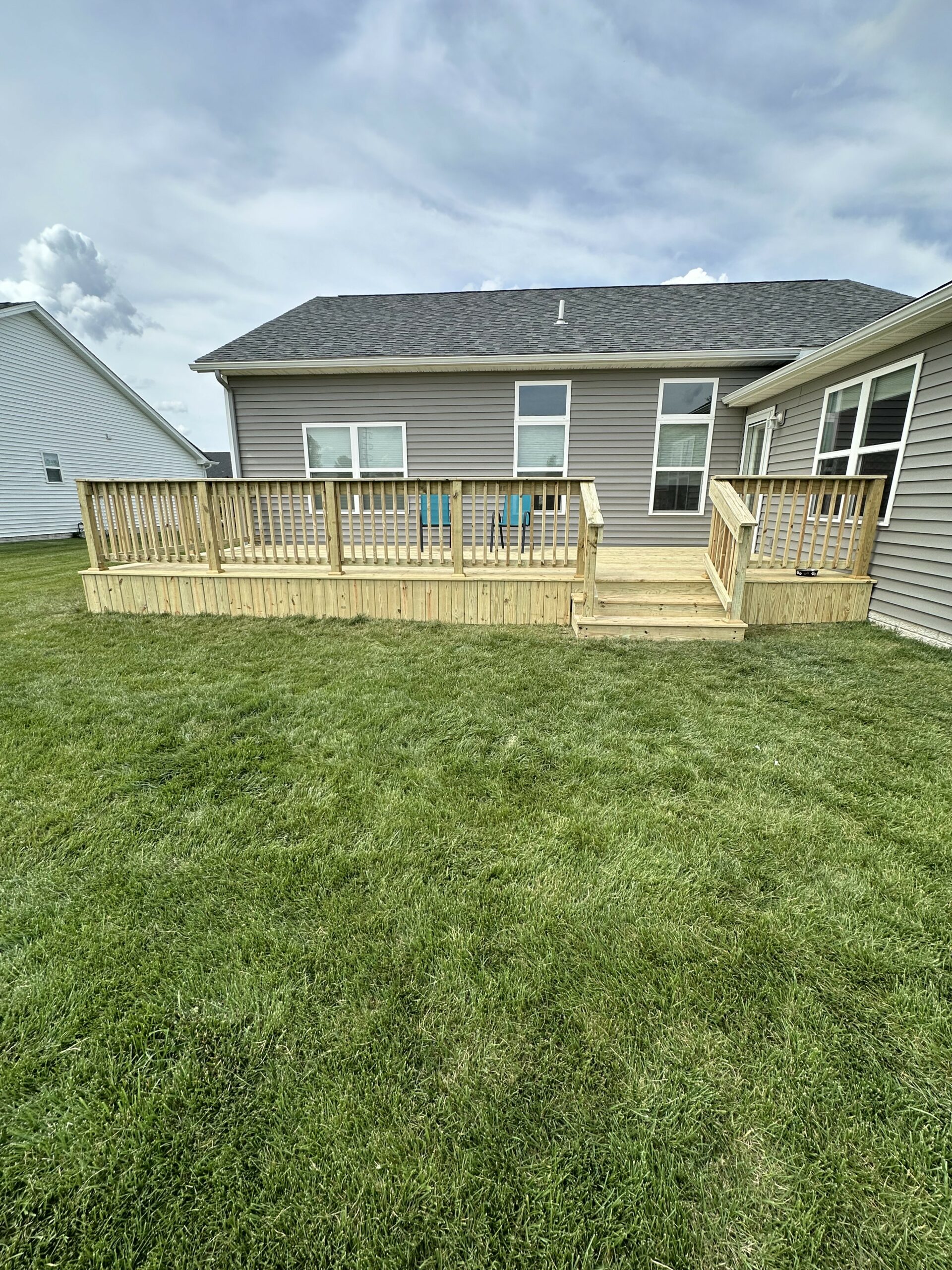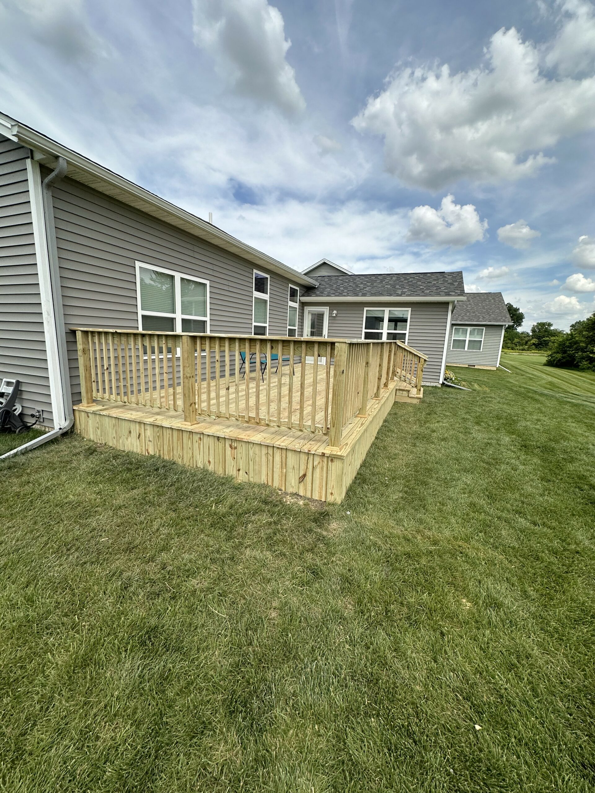 A number of ways exist to frame your deck. For our projects, we typically frame a free standing structure as opposed to ledgering to the home. This allows the look of an attached deck without the extra steps of having to flash the framing into the home. Once we framed the structure, we installed treated deck boards at the floor and skirting. We also installed treated 2x handrails with 2×2 balusters and a set of steps leading to the back yard. The final results turned out to be exactly what the home owner wanted: