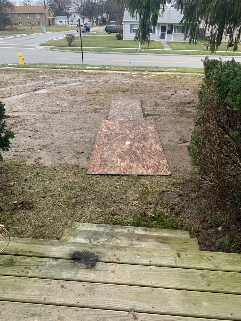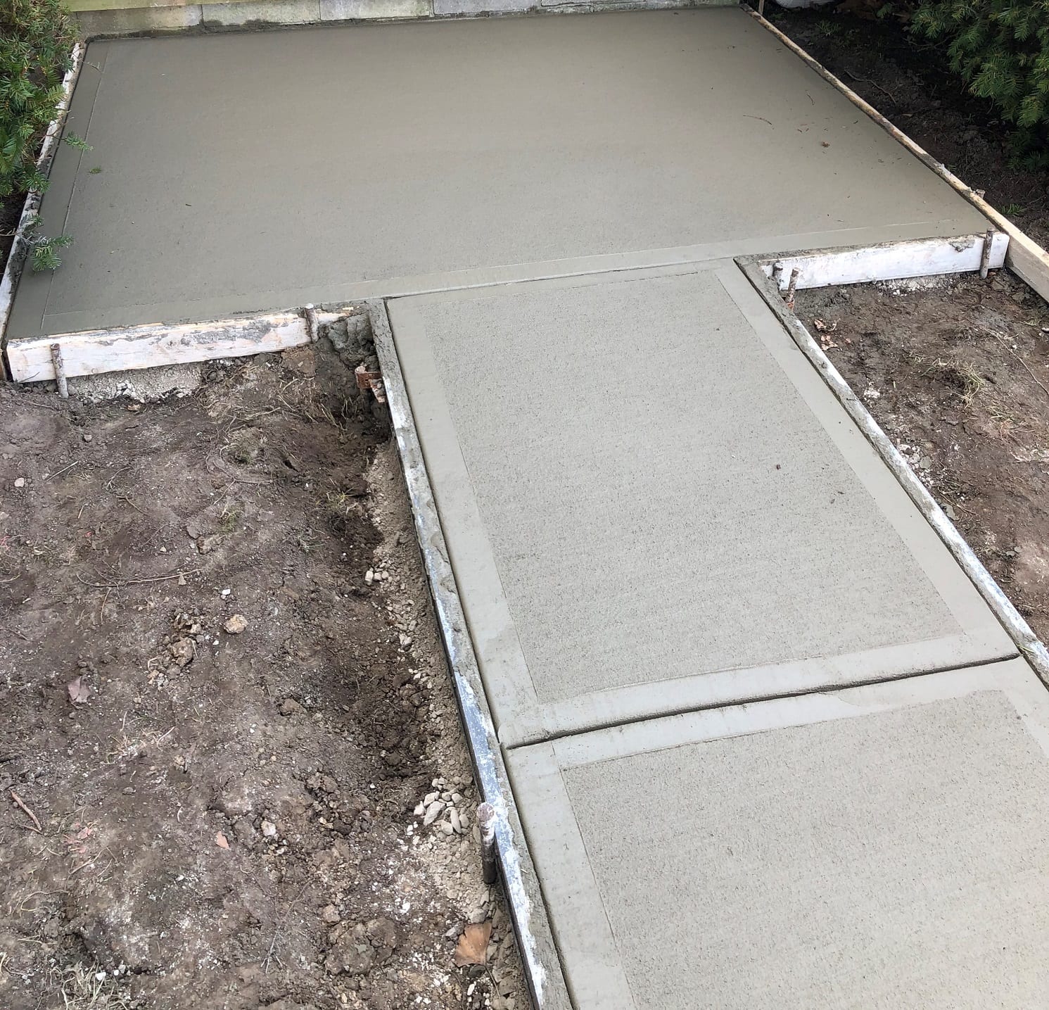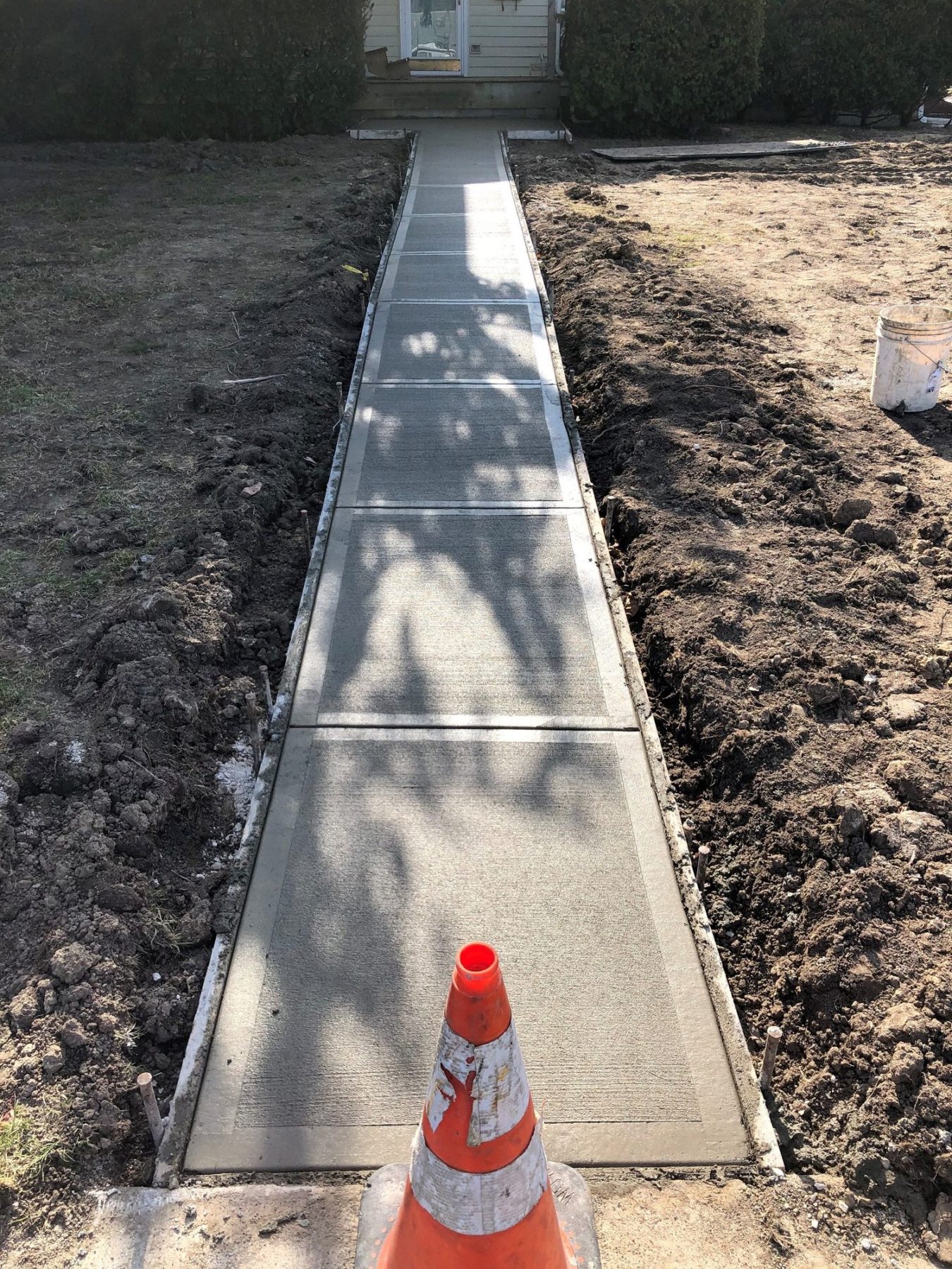 A new sidewalk doesn’t seam like a big deal, unless you trip on your uneven sidewalk when bringing in your groceries. Better yet, when a surprise water line leak springs up and causes you to rip your existing sidewalk out. When looking at the photo below, you can see that the plywood isn’t doing the trick, lol! Our client needed to grade their lawn, as well as pour a sidewalk and slab next to their front porch. After getting an idea of their desires, we went to work on their project.