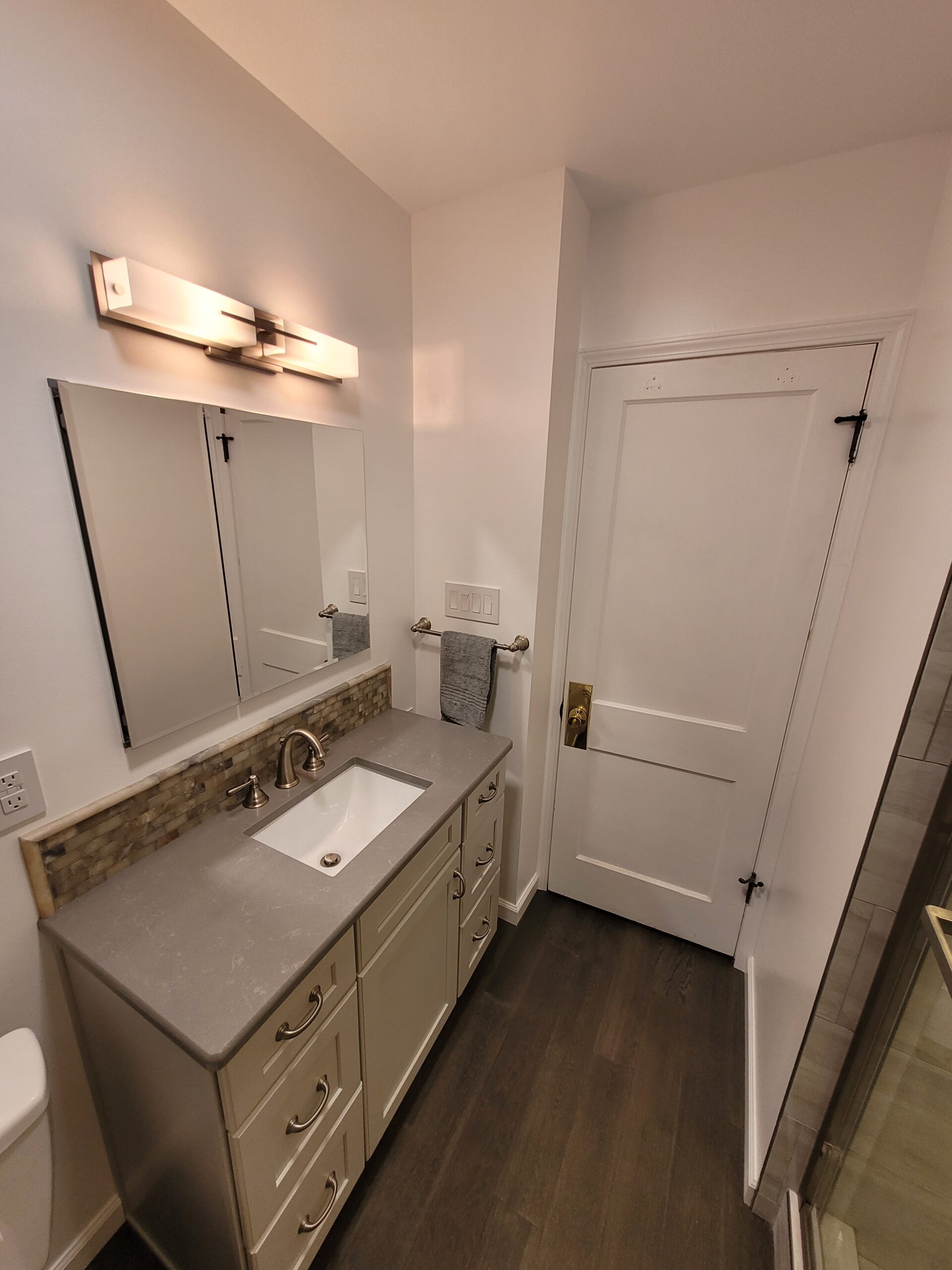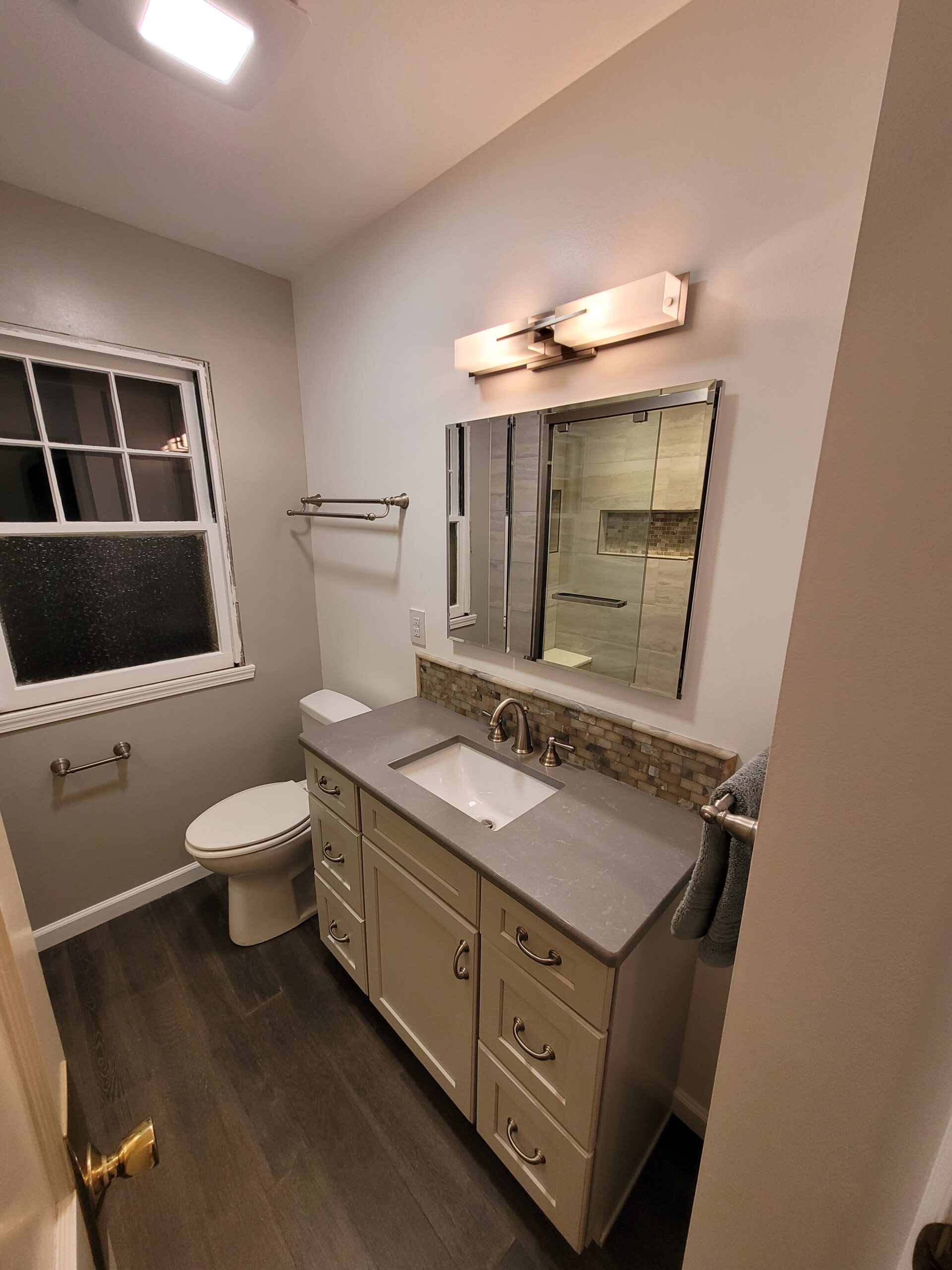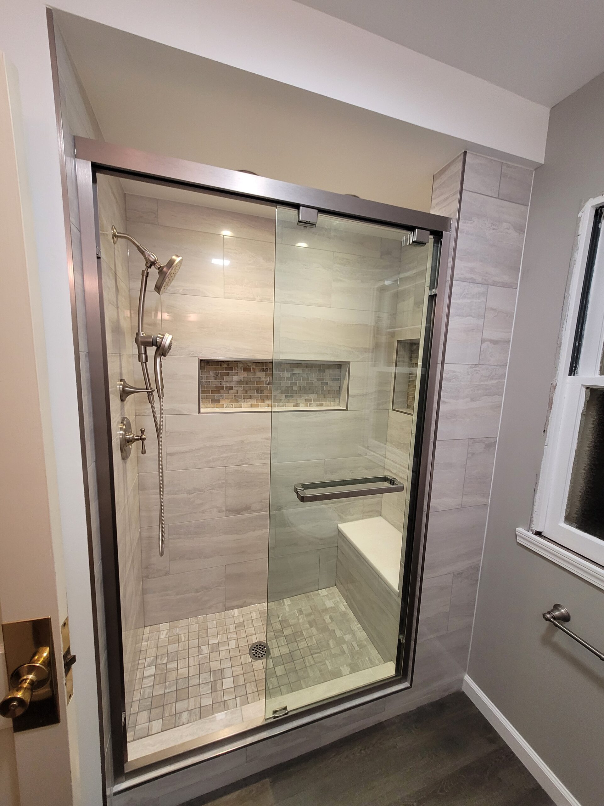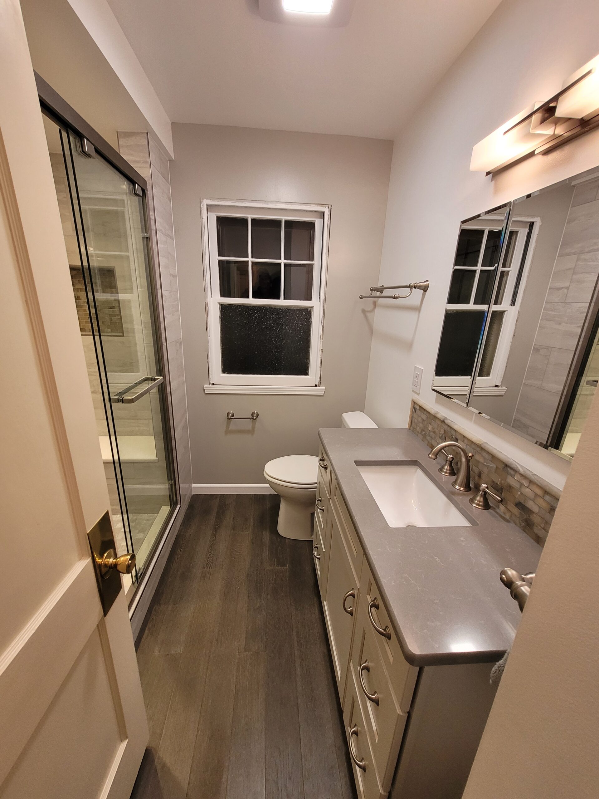 Look at that amazing shower! Everything that our client selected paired perfectly in this renovated bathroom. Colors flowed together seamlessly, and the result was a warm, inviting space that will serve their needs for years to come. We absolutely love taking these renovation journeys with our clients, and would be honored to help you with you bathroom renovation. We have decades of combined experience that we want to incorporate into your project. Give A+ Home Improvements a call to go over your project today – we look forward to working with you!