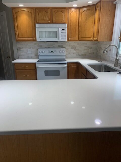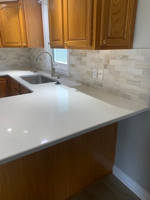 Welcome back to another project presented by A+ Home Improvements! We all know that home renovations come in all shapes and sizes. While large renovations are often needed, smaller changes make a huge difference as well. Our next client desired to install new quartz tops with a tiled splash. Many options exist for counter tops: quartz, granite, Dekton – just to name a few. Quartz offers a fantastic look without much maintenance, which makes it a desirable surface. We helped our client with the color selection along with the sink/fixtures. The kitchen looked like a new space: