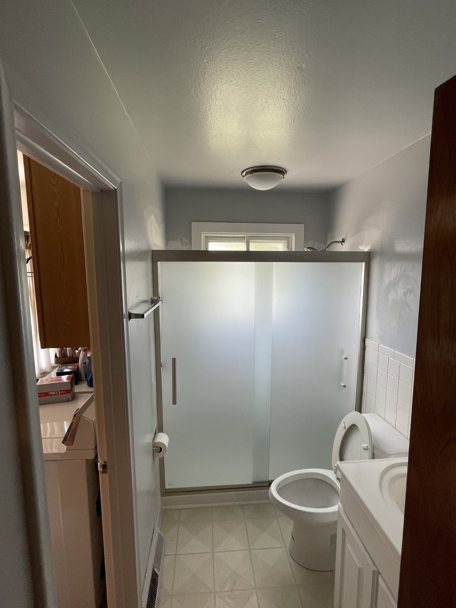 Hey everybody! A+ Home Improvements is tackling another project. Our next client didn’t desire a whole bathroom renovation – they simply needed a quick shower update. The old tub enclosure showed signs of deterioration, so we needed to install a clean, new shower. You will notice the tile wainscot in the pictures below, which is common in many older homes. There are products on the market that claim to be installed over exiting tile, and while that can pose a viable option, we choose to not put a band-aid over bigger problems. We extracted the old tile surround up to the wainscot, then went to work installing new moisture resistant products in it’s place. Our client opted for a clean, white enclosure with shower doors to add a nice finishing touch.