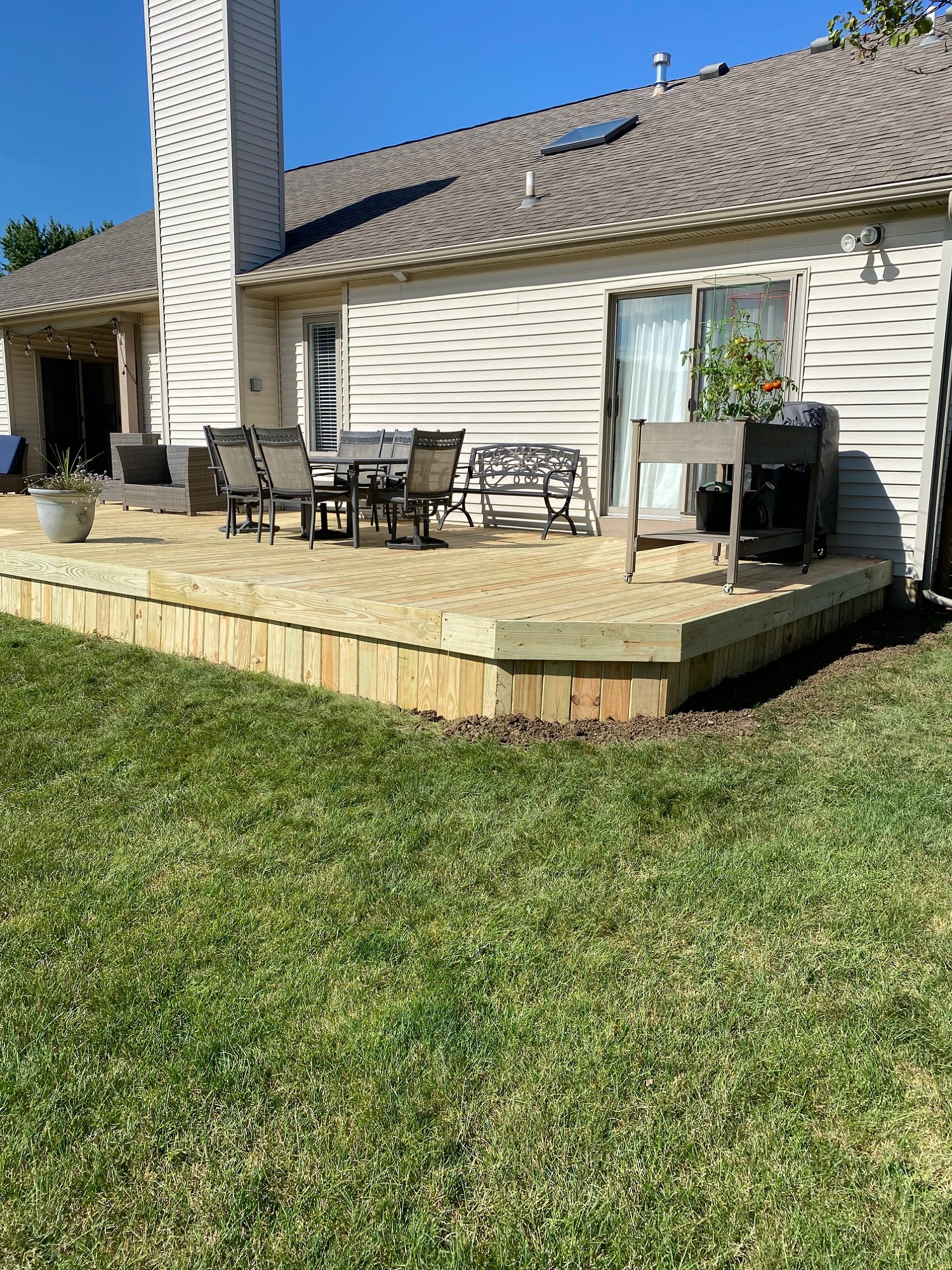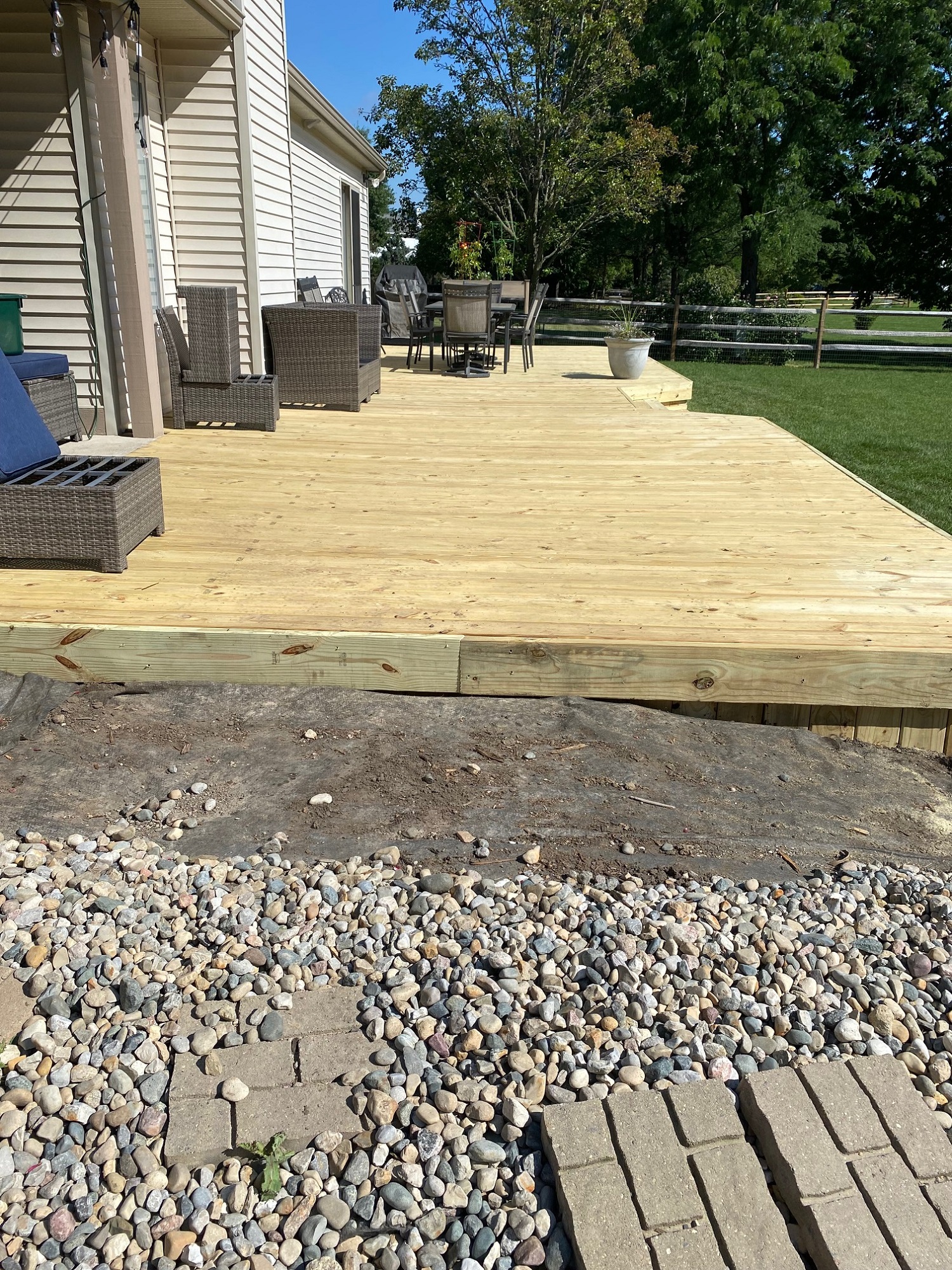 As you can see, this was already a large deck with a great layout. Much of the exposed wood had rotted and needed some attention. We ripped off the deck lid and inspected the framing for damage. Once everything checked out, we installed new treated lumber to bring the deck back to life. Once again, this deck will be able to provide years of summer fun in the sun! Let’s work on your back yard this year. Whether refurbishing a deck or installing a stamped concrete patio, we are here for you. Give us a call to tackle your next project today!