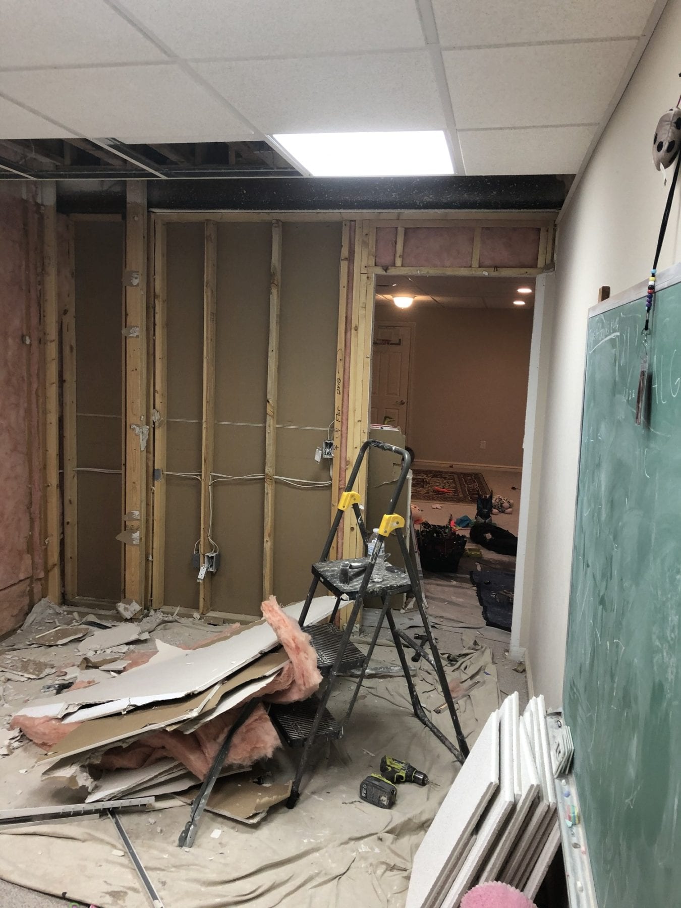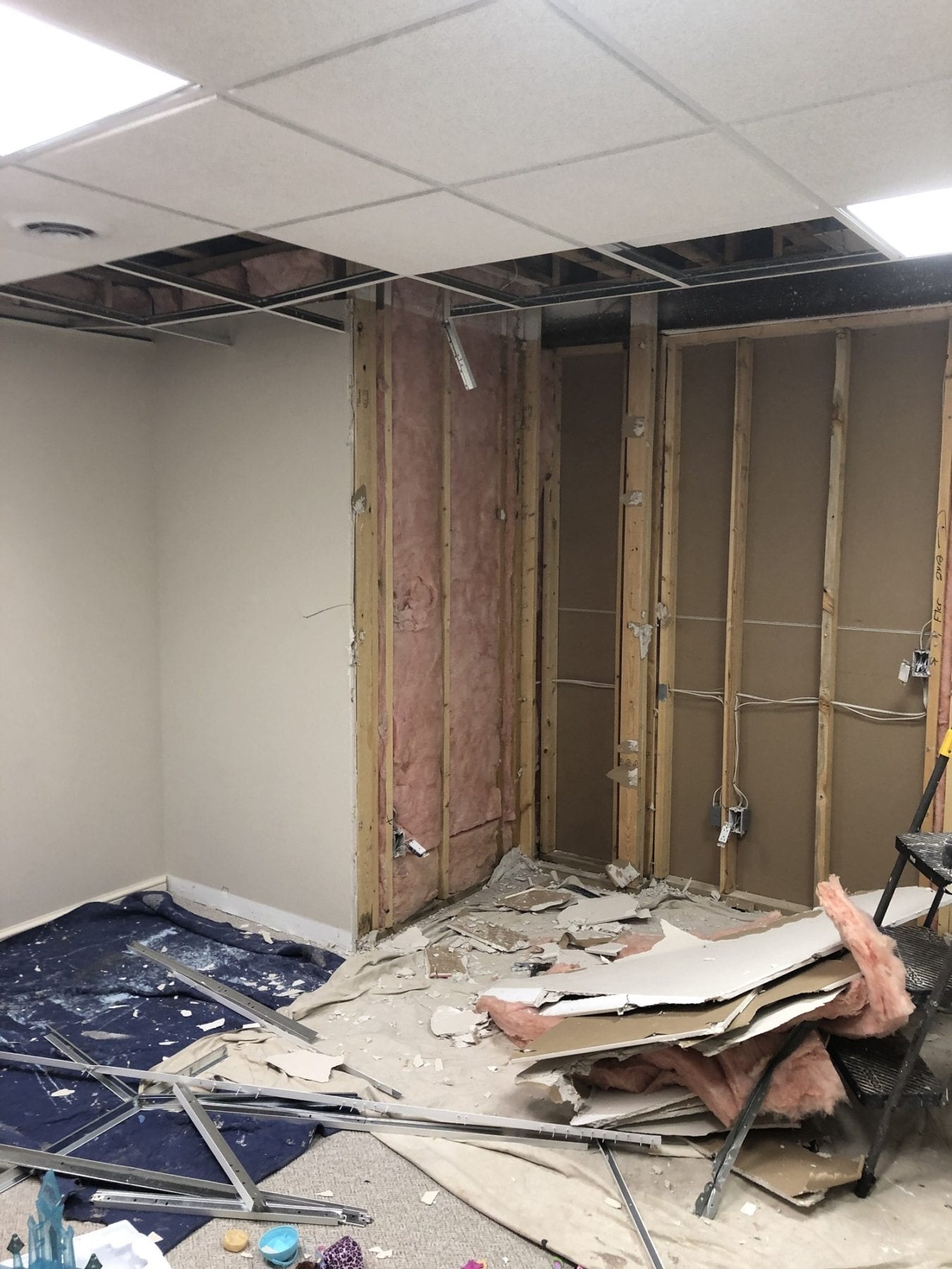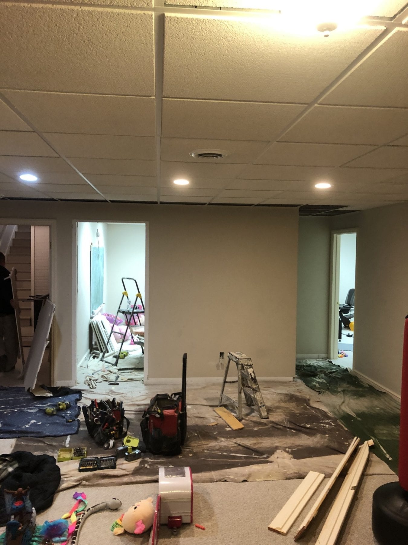 For this project, our client desired to have a more open feel in the basement. These walls were non-loading bearing, which made the project must easier to tackle. We deleted the wall, and repaired the drop ceiling track. Once we repaired the drywall, we pieced in the base moulding for a finished look. While not a large project, it provided excellent results.
