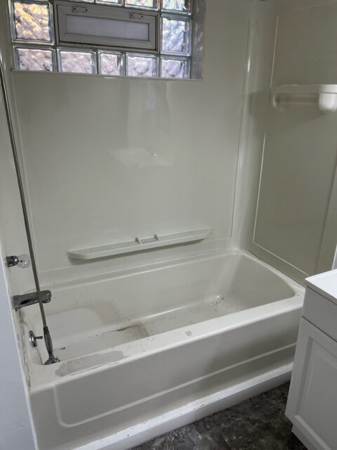 Welcome back to another A+ Home Improvements’ project! While we love tackling large, complex projects, sometimes a small change makes a huge difference. Our client wanted to replace a tub with a shower. The existing tub enclosure needed some serious help. One obstacle for the project was the window. In situations such as this, having a window in the enclosure limits some of the options a home owner has for the surround. Tile and glue up surrounds remain the optimal choices for situations like this. We worked with the client to select the perfect products, then geared up to get the job underway. Here is a look at the old tub enclosure: