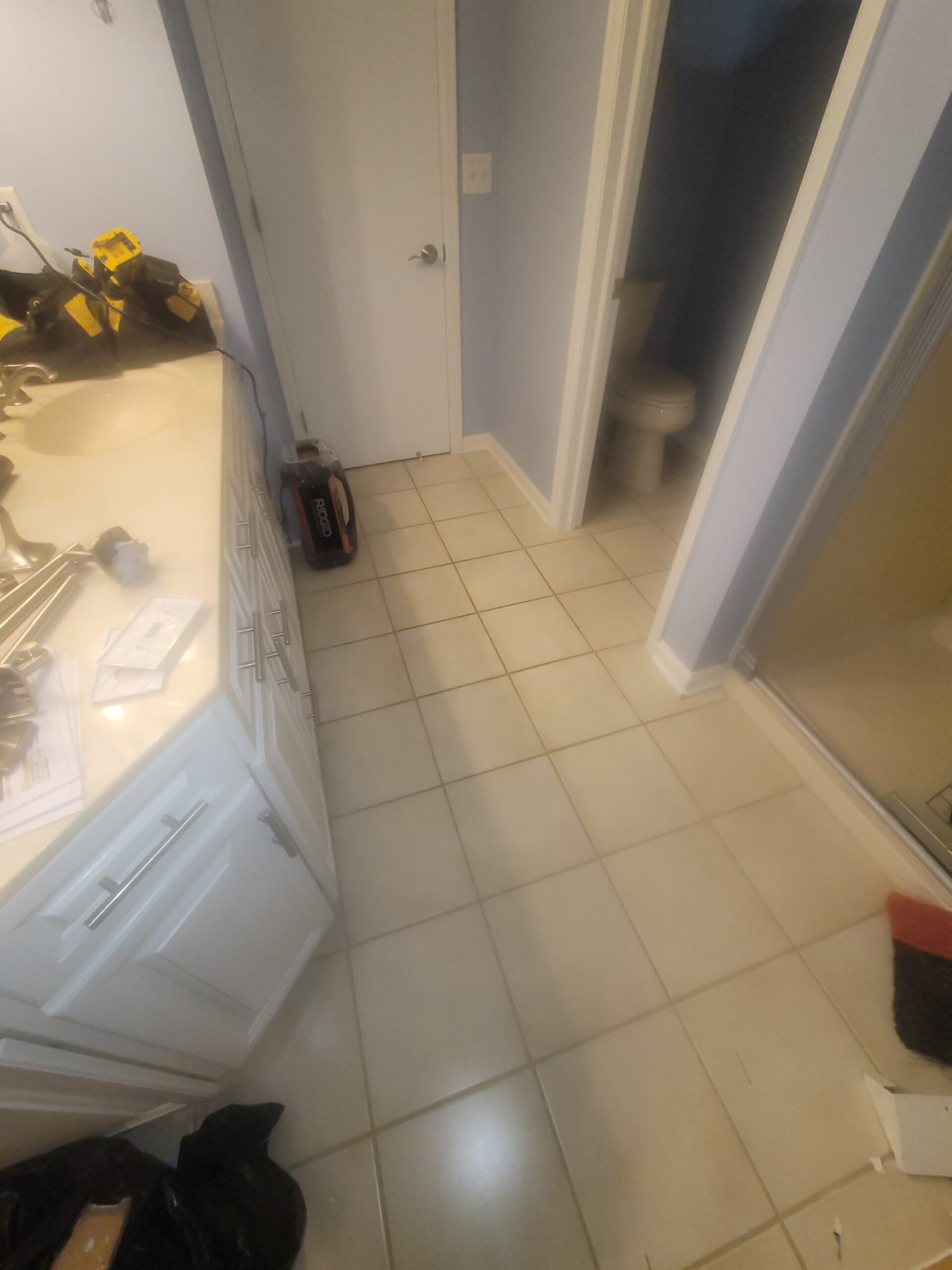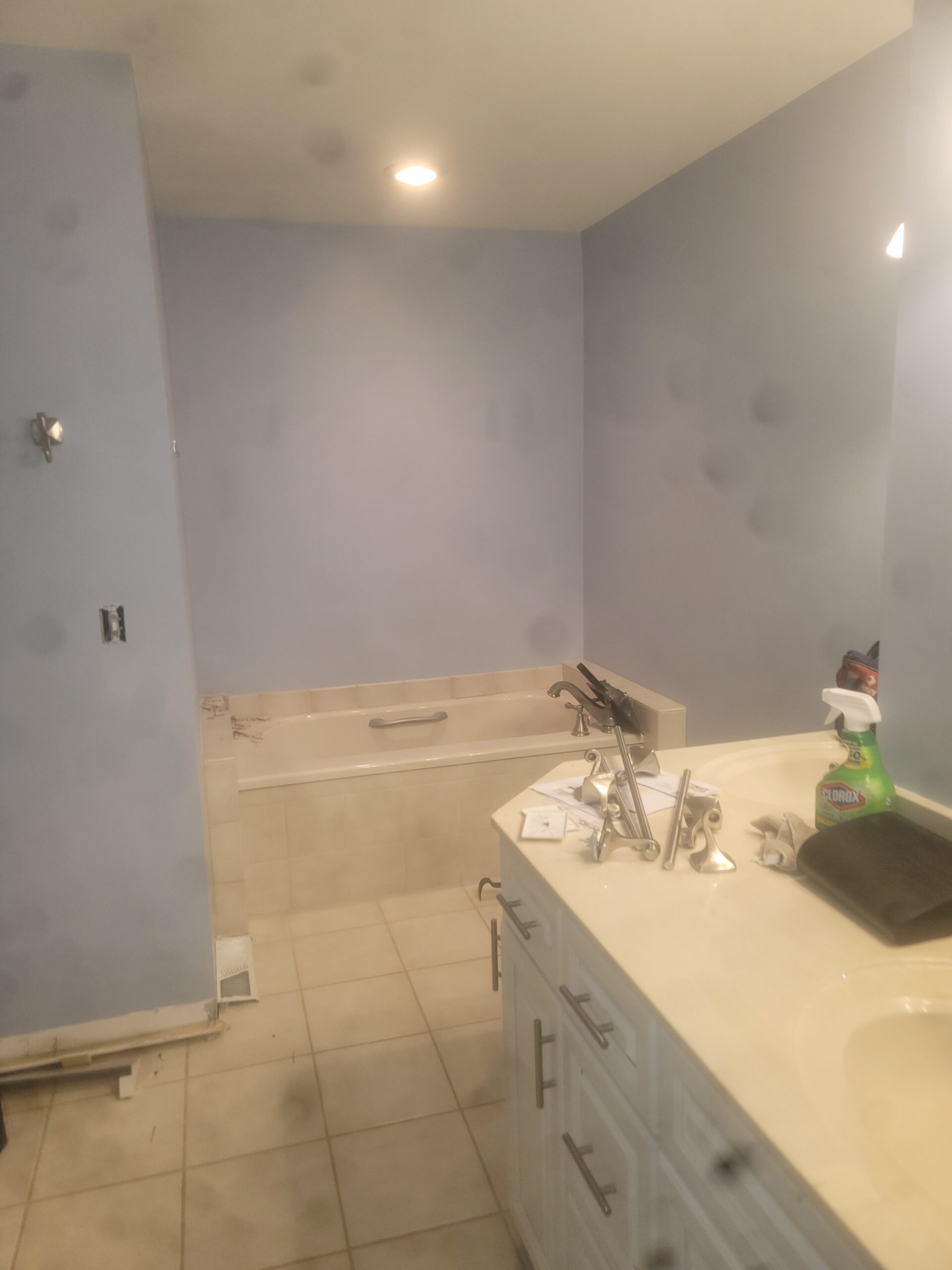 Hey guys, A+ Home Improvements is back at it again! Our clients lived in a beautiful home, but the bathroom left much to be desired. While functional, the bathroom did not service our client’s needs. The main goal was to replace a tub with a tiled shower, but that wasn’t the end of the wish list. They never used the old roman tub, and the existing shower was small and cramped. Our client desired to get rid of the tub and install a tiled shower with bench seating and room to stretch. The vanity layout worked for them, so they opted to replace the counter top to spruce up the space. The old vinyl flooring needed to go, as well as updating the fixtures throughout. Once we completed design layout and product selection, we got the project on the schedule! Here is a peek at what we were dealing with: