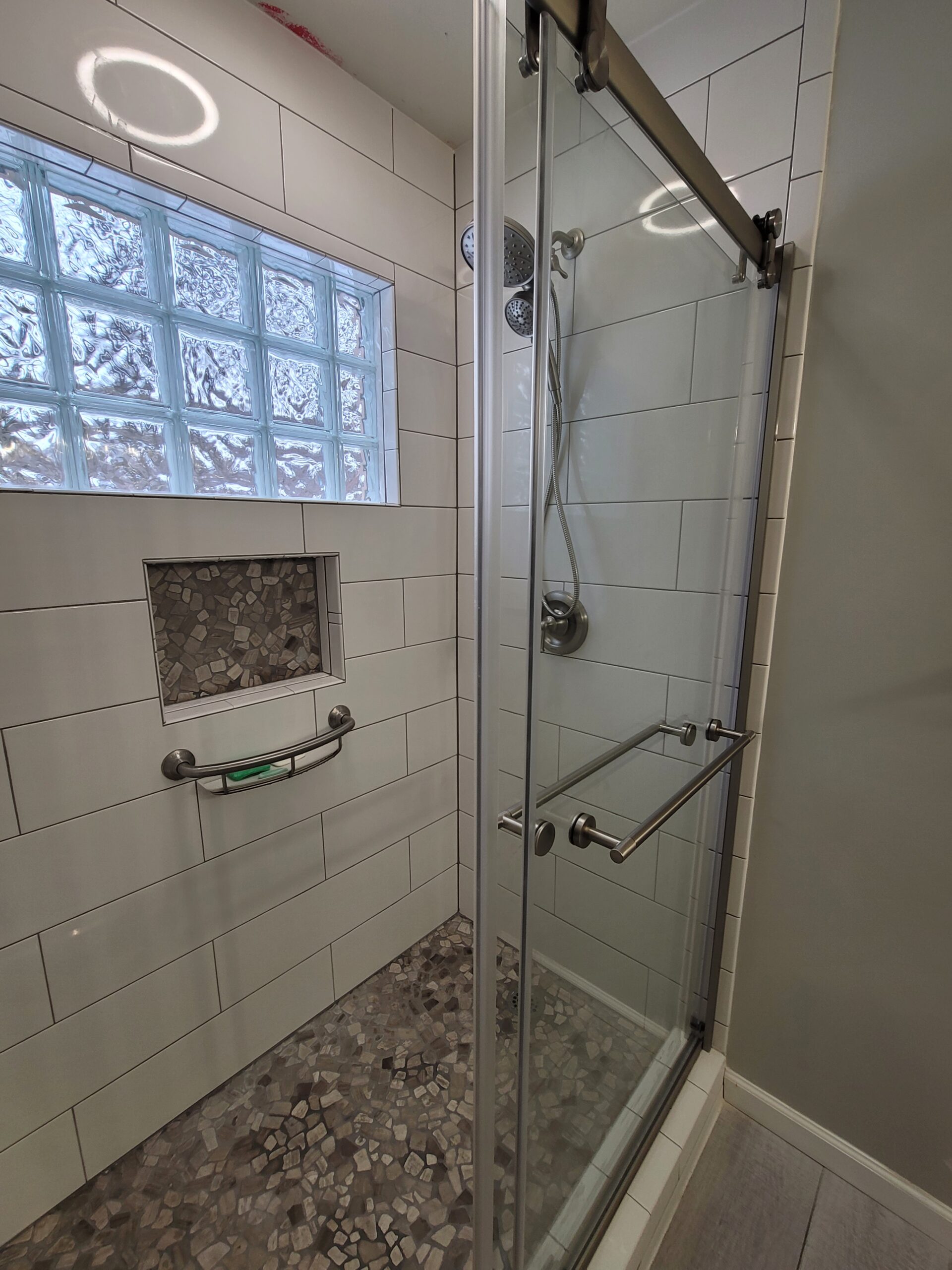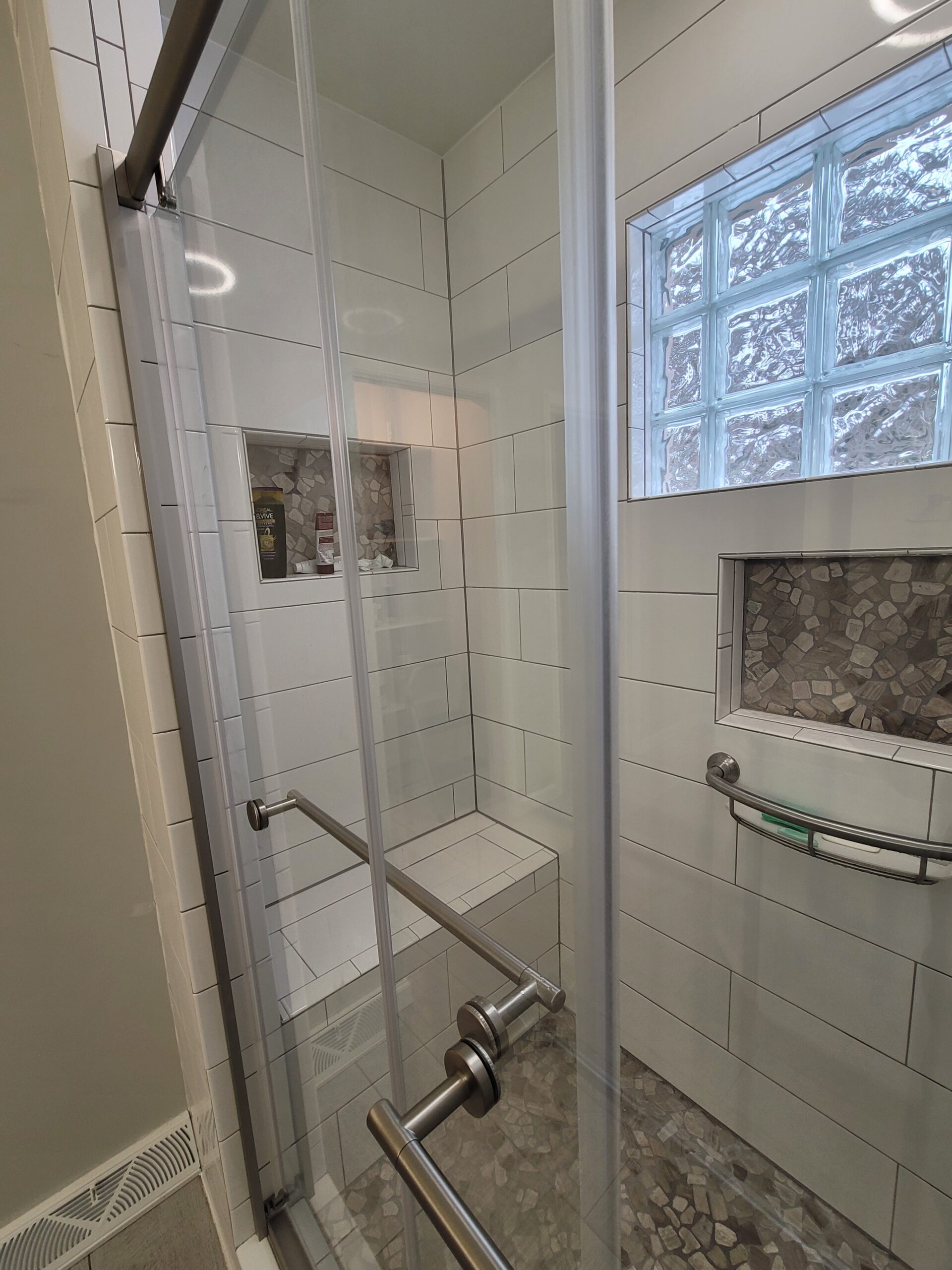 Talk about a big waste of space! The tub sat in a corner by itself like it was in timeout, and the rest of the bathroom screamed “dated”. Lack of storage also presented a problem, so we came up with a solution for that as well. To tackle the storage issue, we deleted the existing shower enclosure and converted into a linen closet. Another obstacle in this bathroom was the lack of light. To combat this, we frame for and installed a glass block window in the new shower enclosure to allow natural light to permeate throughout the room. The bathroom transformed into an entirely different room!