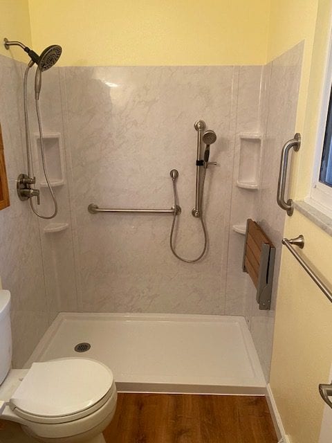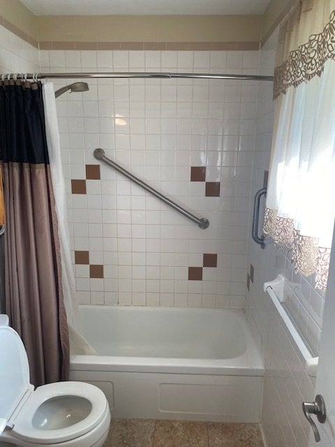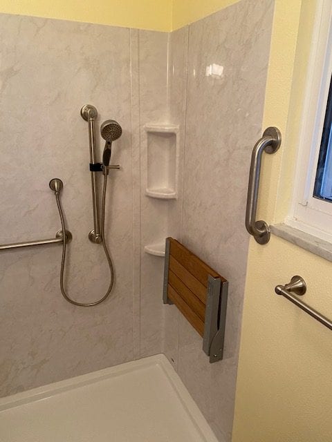 Our client wanted options for their shower faucet setup, and decided to go the route in the pictures above. We installed a new faucet with integral stops, with a separate diverter valve to operate a handheld unit on a slide bar. This allowed out client to sit in the newly installed fold down seat while still having access to a shower faucet within arms reach. The flooring paired nicely with the new seat as well. Instead of dealing with the hassle of cleaning a shower door, we installed a curtain rod. One the paint went on the walls, the bathroom was ready to go.