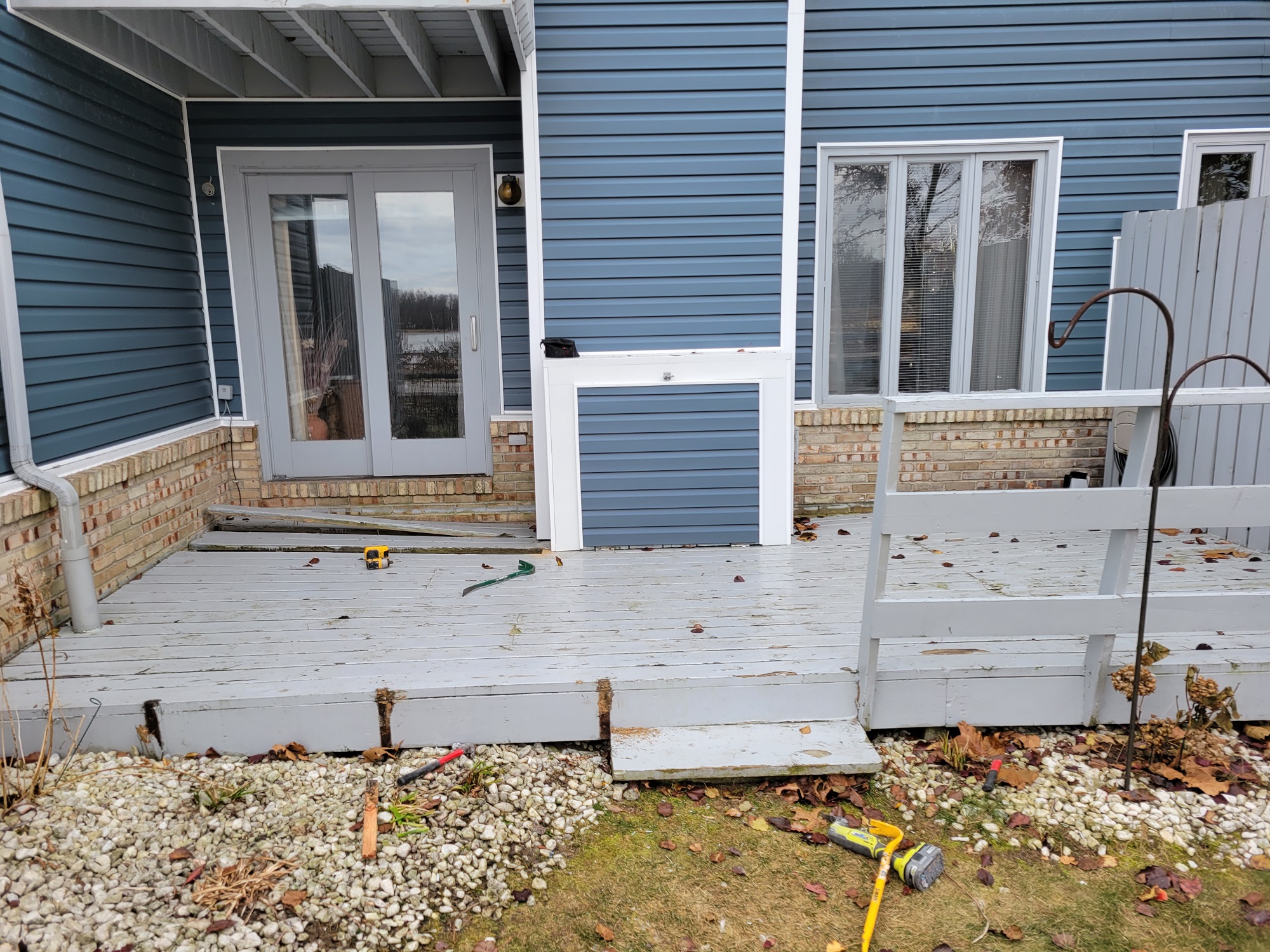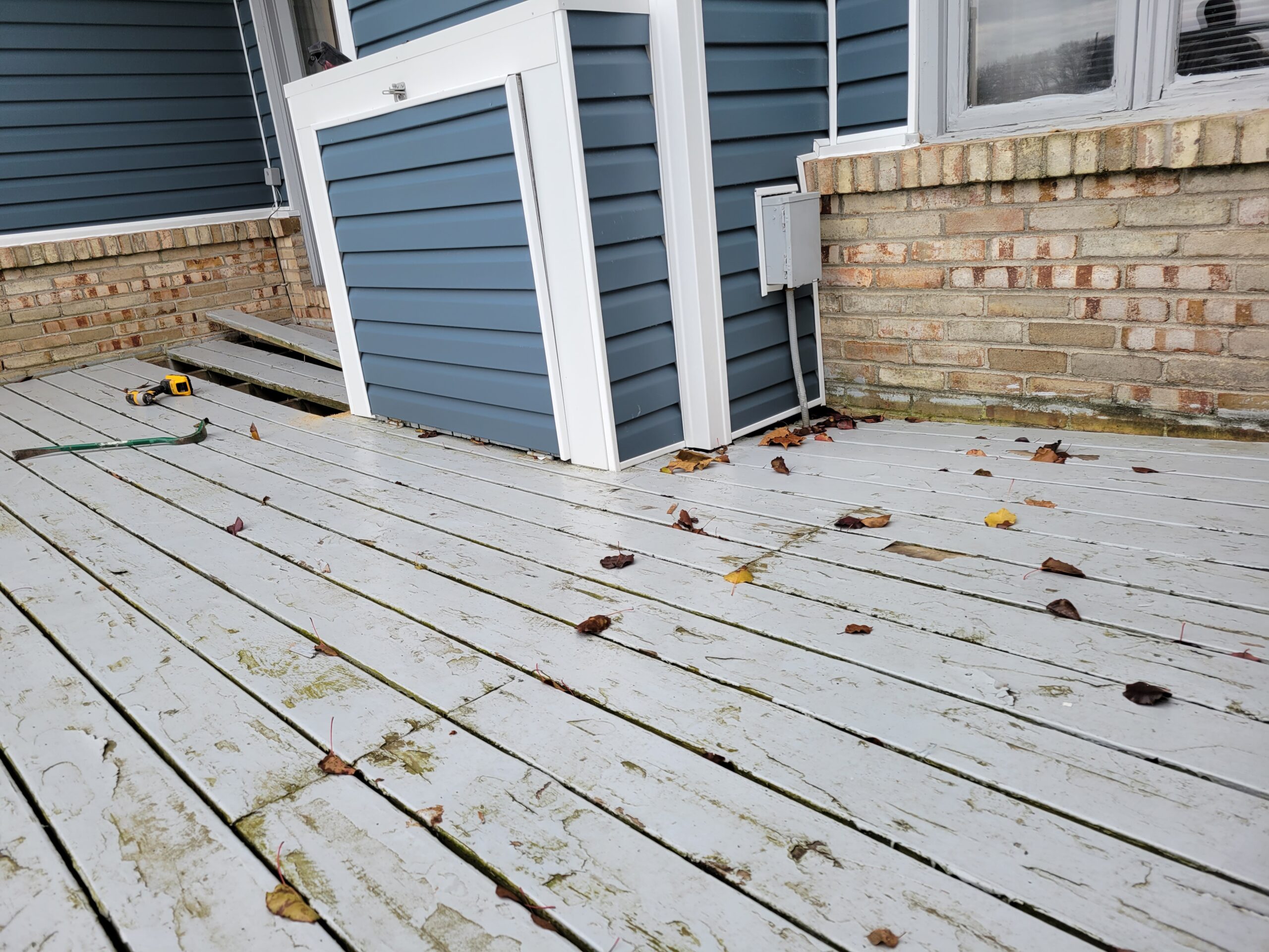 Spring is around the corner, and your deck will soon be a gathering hot spot! People overlook their deck for large parts of the year because they typically are not used year round. So what happens when you walk out and realize that your deck is in disarray? Treated lumber remains a resilient choice for your deck, but the installation is just as important as the materials. Our client desperately needed their sagging deck repaired. They belonged to a condo association, so we had to make sure to keep the original look of the deck. To compound issues, the units had recently been sided and the installers followed the contour of the sagging deck. After realizing that the original ledger board had failed due to improper installation, we came up with a game plan to attack the issue. The pictures show the extent of the issue.