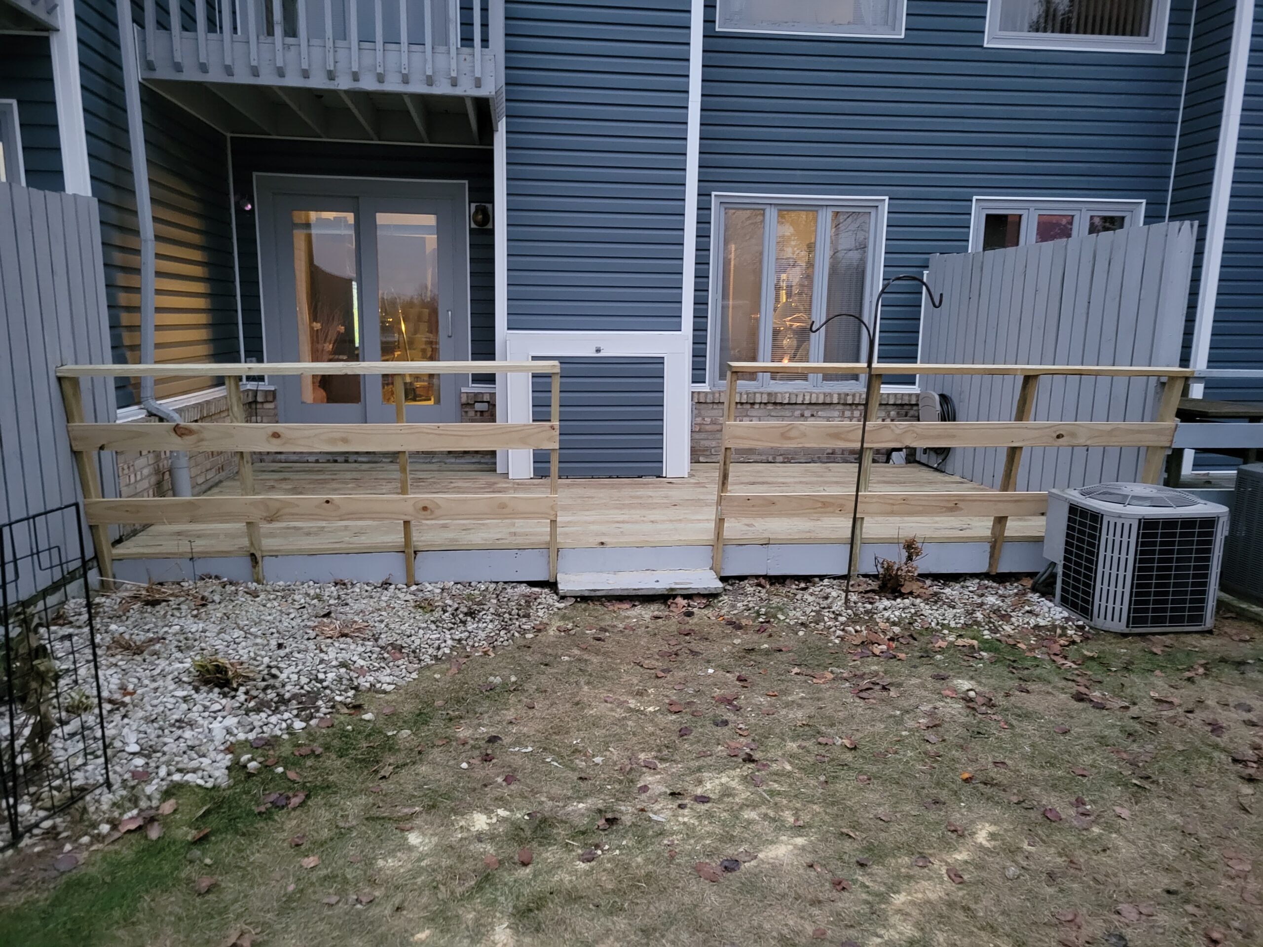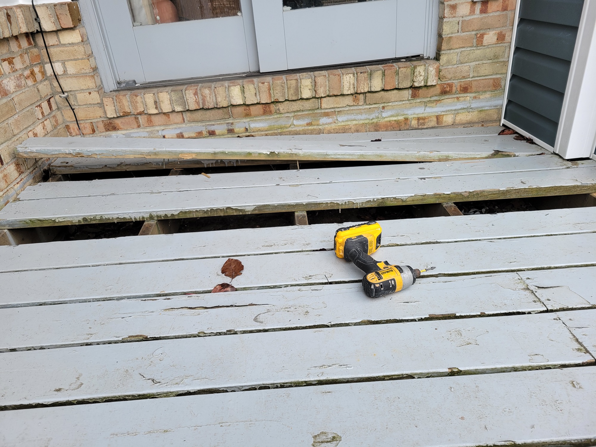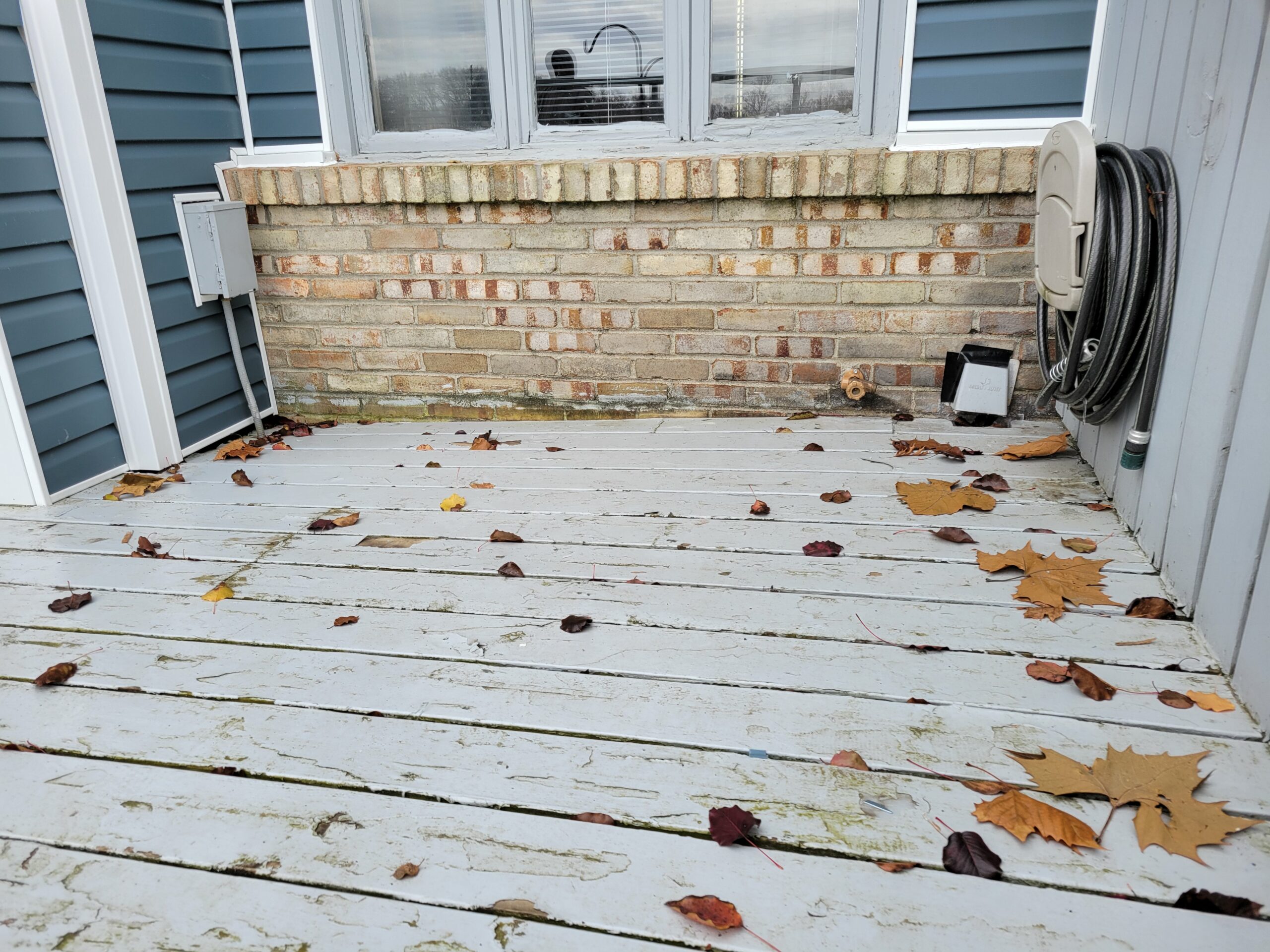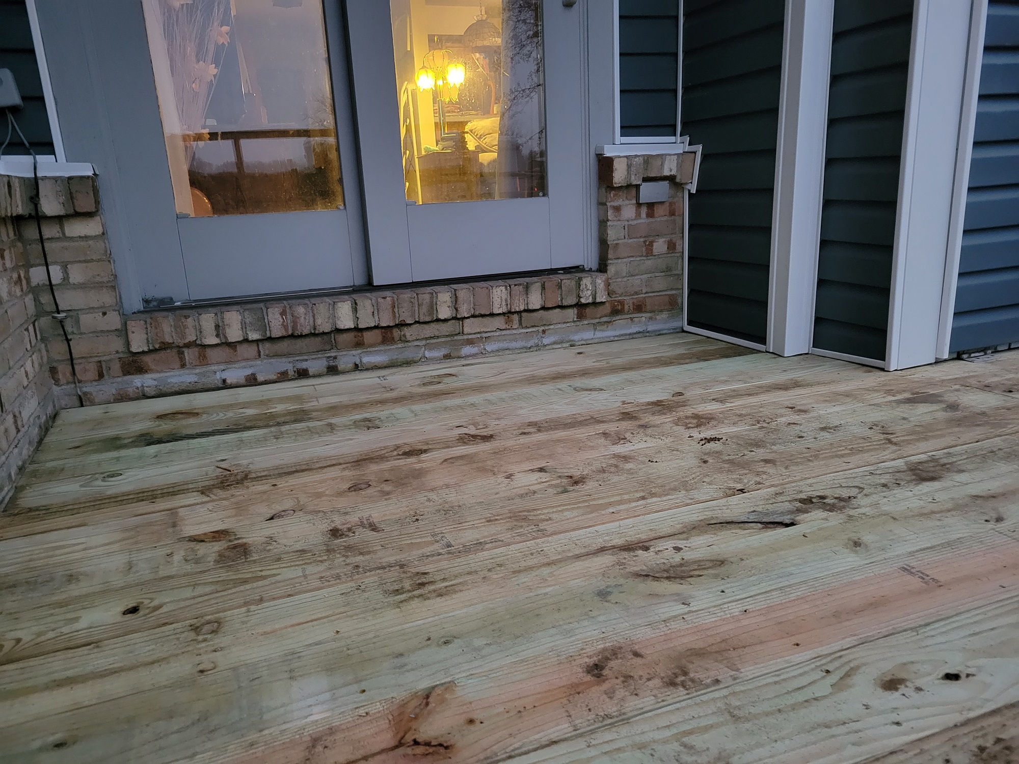 Notice the line on the brick showing where the deck used to sit. To circumvent this problem, we installed a rim beam against the home so we could use joist hangers to support the new joists. We removed the siding, rebuilt the utility enclosure at the chimney chase, and reinstall the siding and trim. We followed up with new treated deck boards at the deck floor, as well as new hand rails to match the community theme. Our client was once again ready to enjoy their outdoor living space!