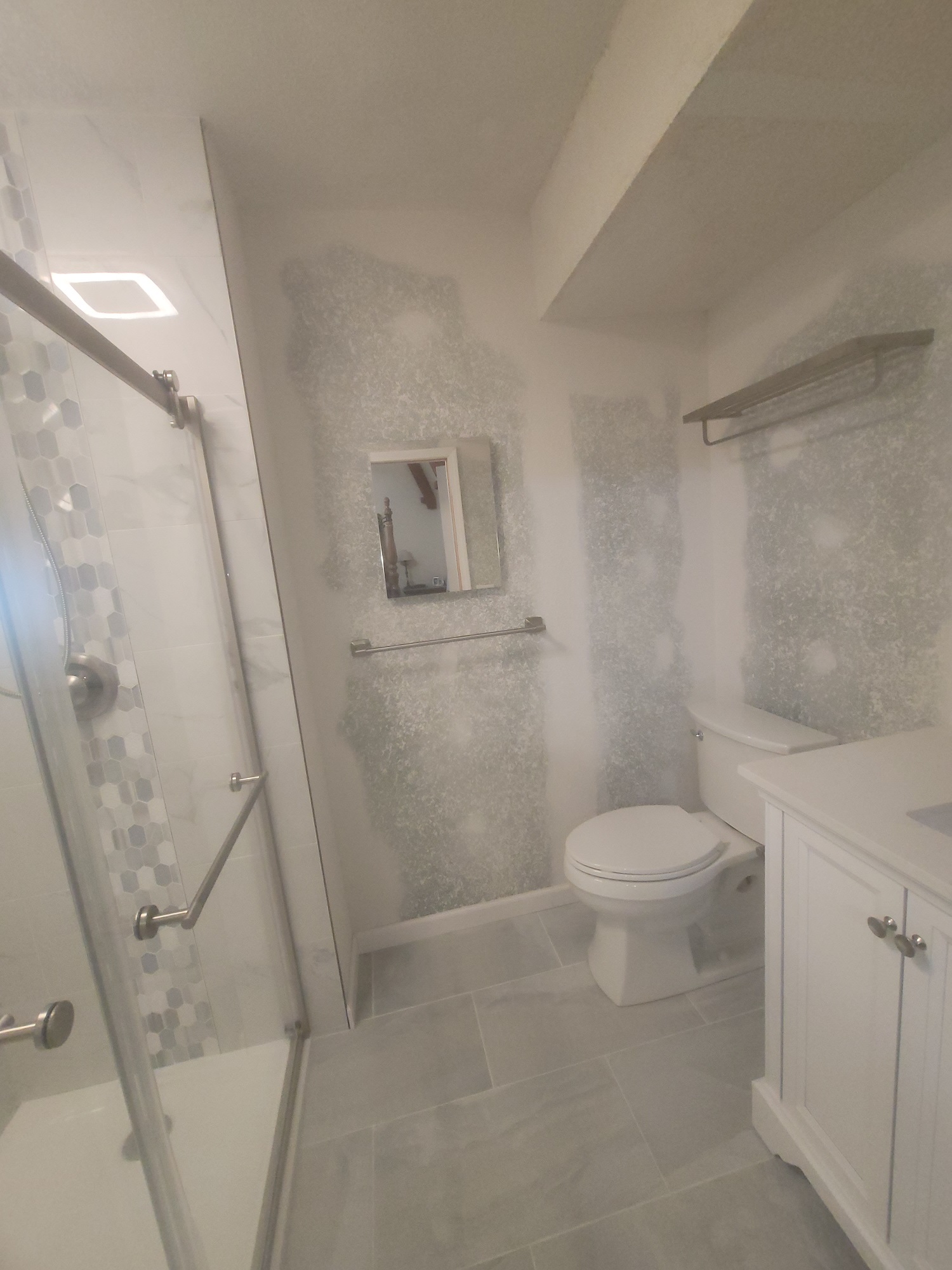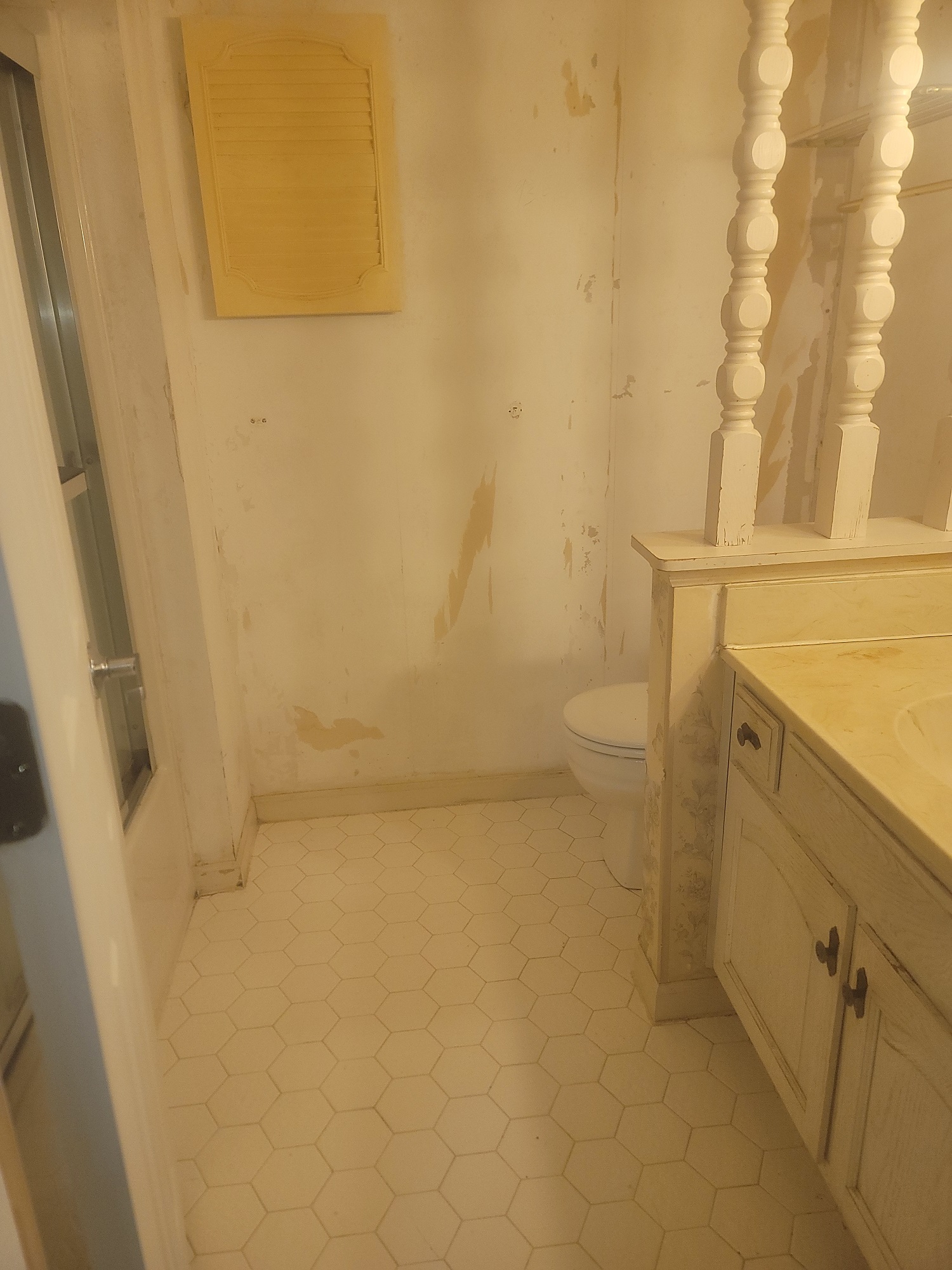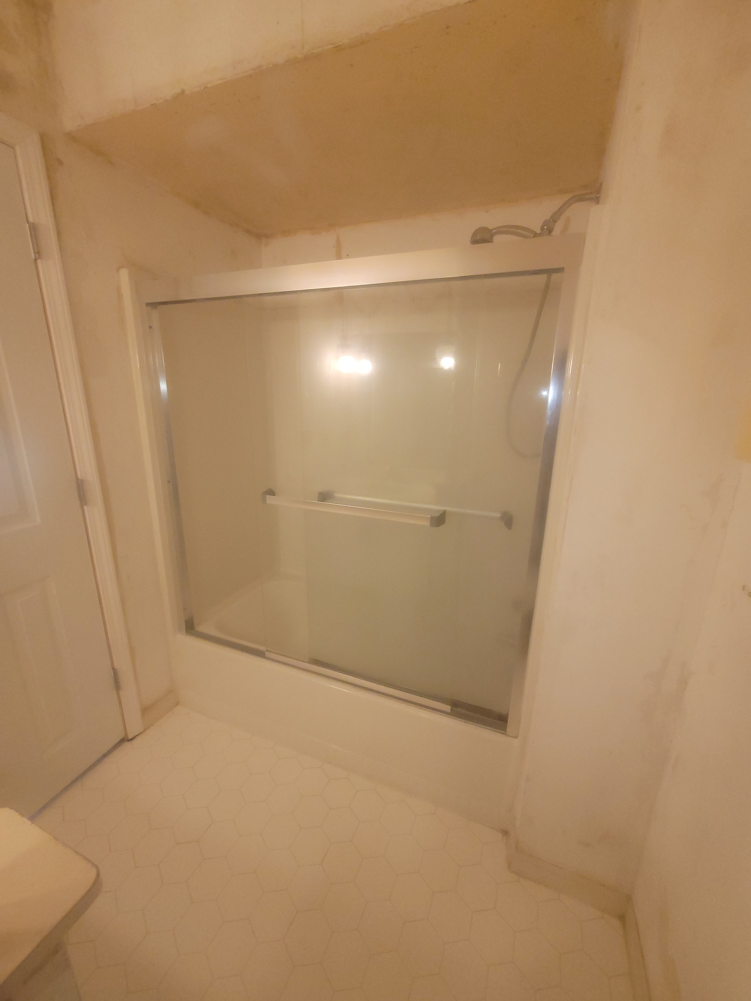 A+ Home Improvements is back at it again! Our next client’s bathroom desperately needed an update. They had been planning the project for a while, and now the opportunity presented itself to get it going. The existing master bathroom consisted of an old tub enclosure, dated fixtures and a bulky wall dividing the toilet and vanity area. A key aspect was a shower with a tile rainfall accent. We discussed a few options with them to help get the wheels spinning, and we were ready. Our designers worked with them on product selection, as well as color coordination. Once everything was selected, we waited anxiously for the products to arrive at our shop. Let’s take a look at what we were dealing with: