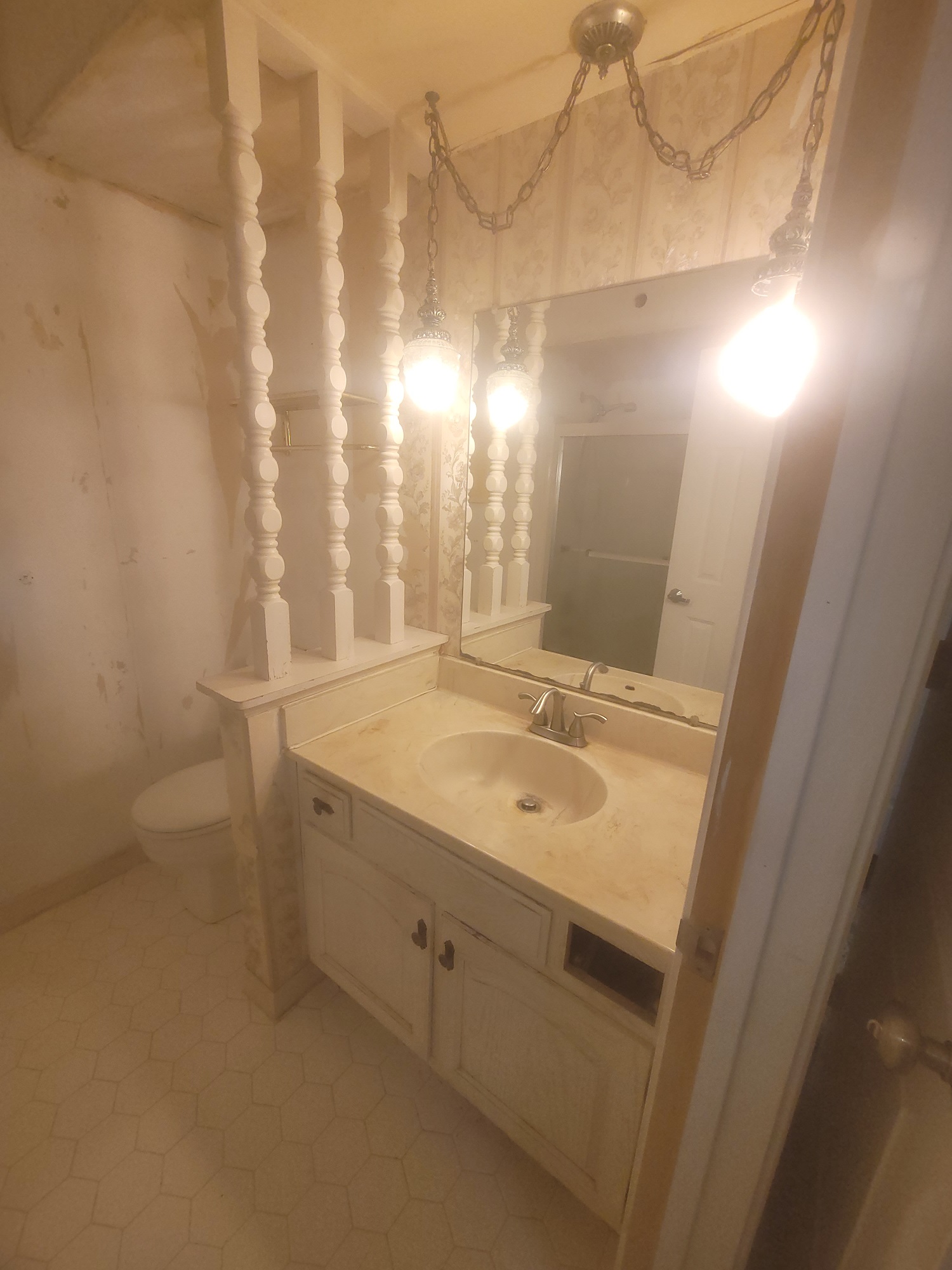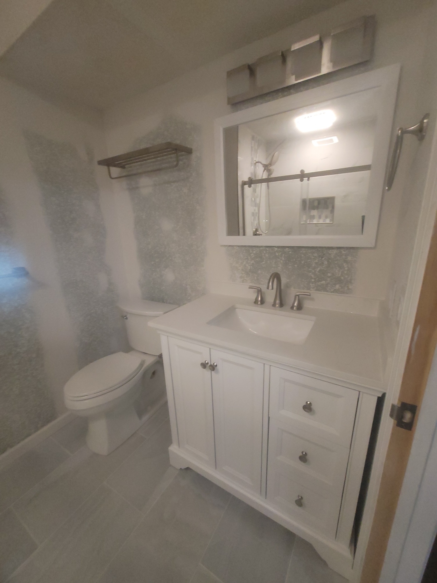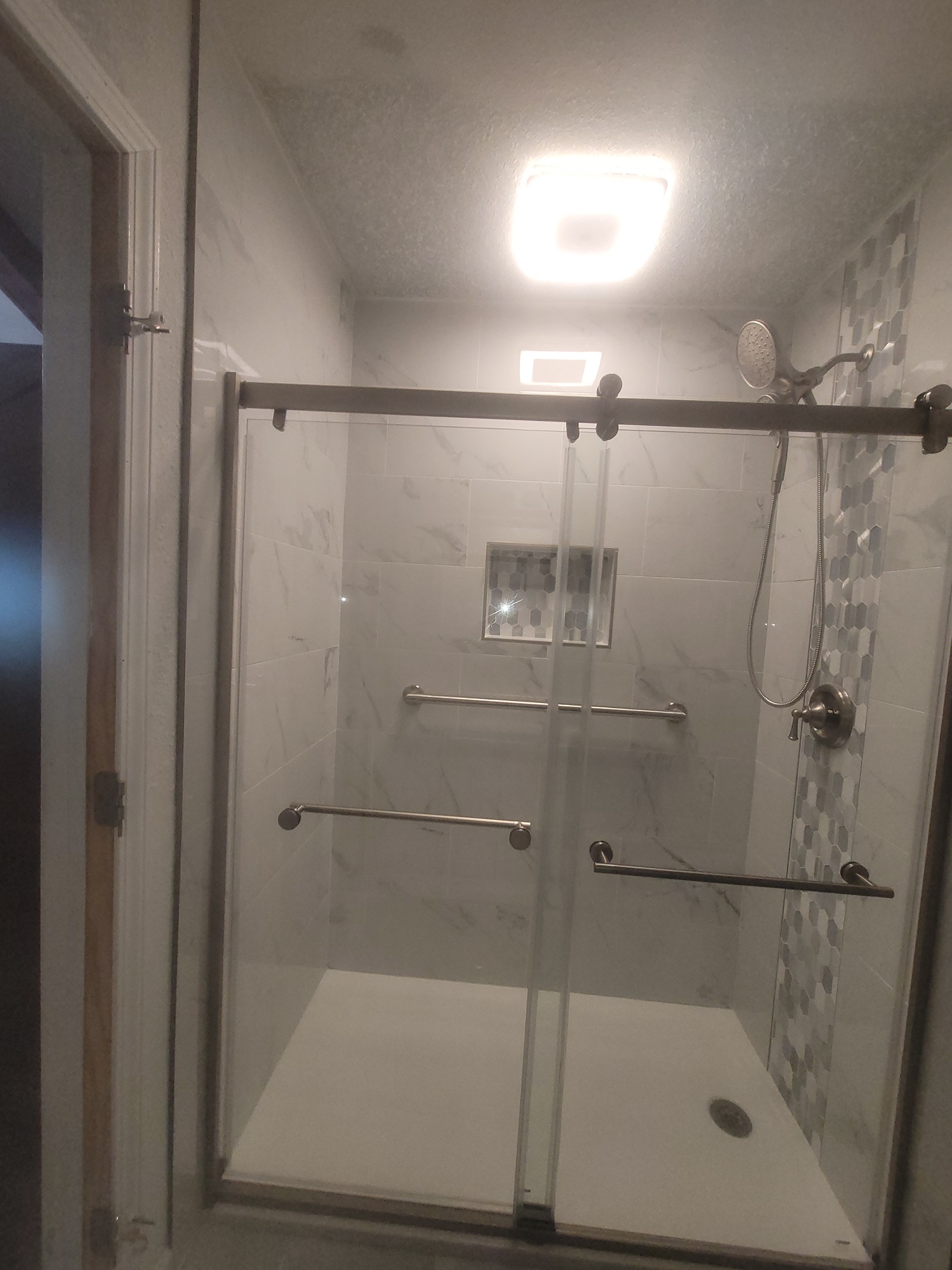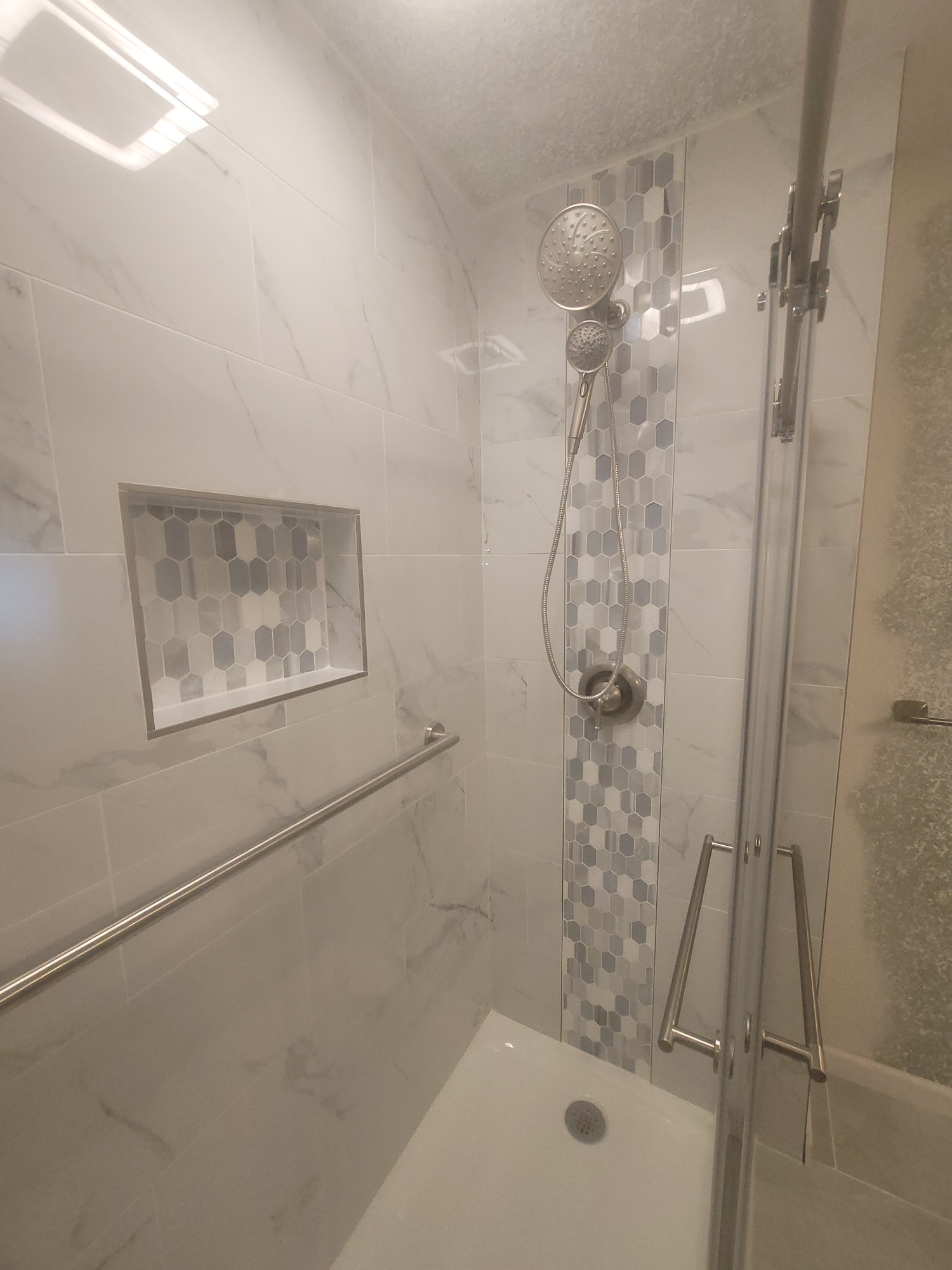 The existing space definitely needed some love! The client desired to replace the tub enclosure with a walk in shower. Additionally, the old vanity and fixtures needed to go. We also removed the dividing wall to create an open space. For the shower, our client opted for a stunning tile shower with a tile rainfall accent. To help pull the look together, we installed the same tile at the rear of the shampoo niche. We also replaced the vanity, flooring and fixtures. The old lighting consisted of pendants hanging from old chains. We moved the wiring to accommodate a traditional light bar, and it made quite the difference.