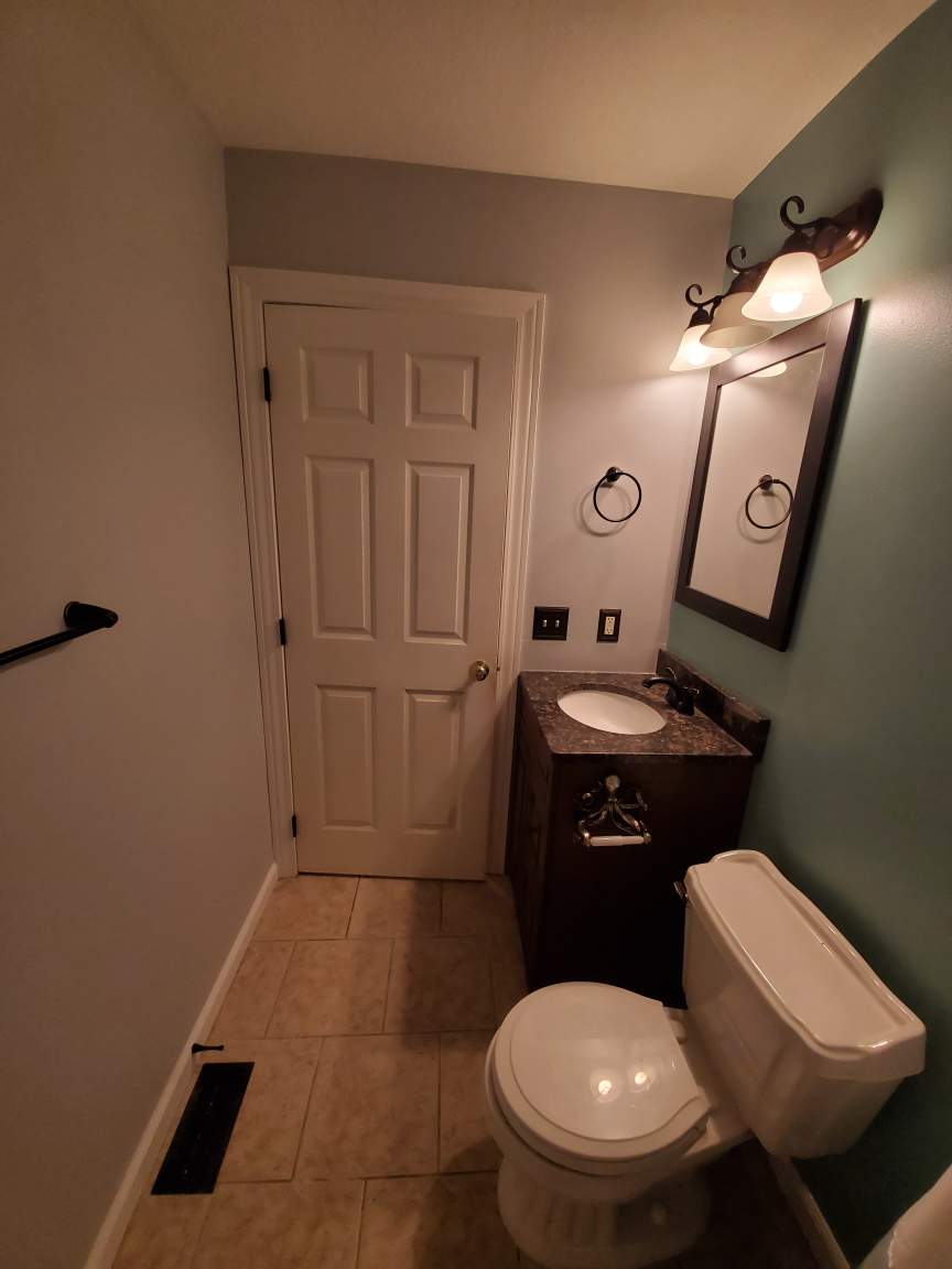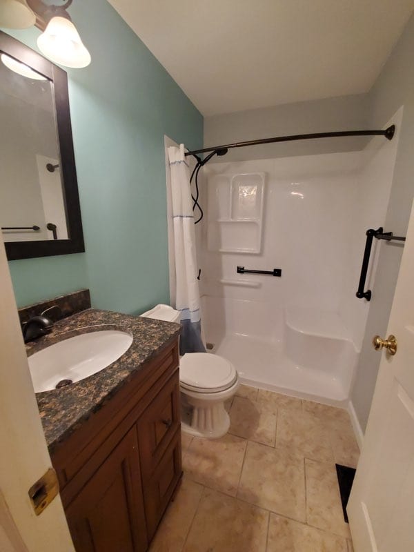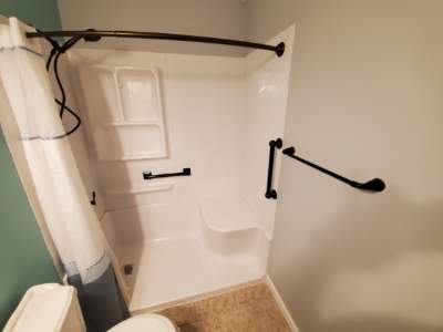 While not a large space, the changes that we made dramatically helped with accessibility. The shower provides an easy to clean, functional area to use. The grab bars help with stability, and the hand-held shower head provides showering options. The light blue walls warm the space up a bit as well. This project hit exactly what our client needed, and we were happy to be able to help out.
