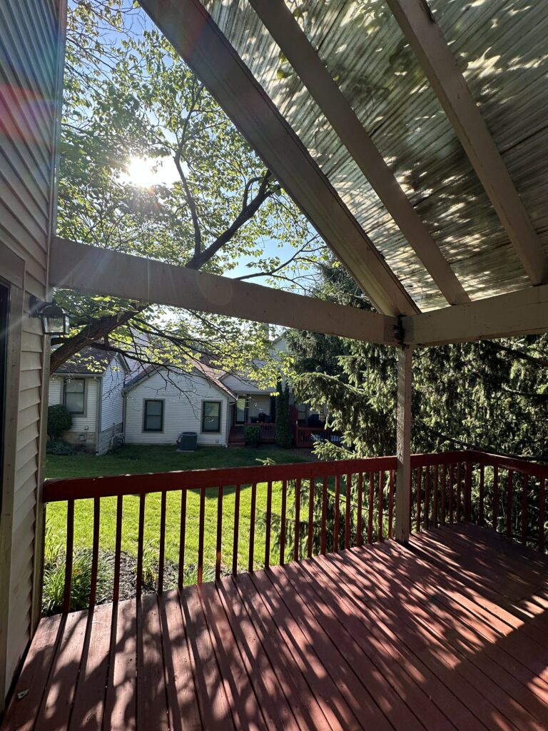 Not the safest structure in the world. You can see in one of the pictures where we had to install bracing in order to jack it back up. We lifted the deck over 6 inches to level it out, and added the proper footers and post to support the structure. For the beams, we supported the existing rafters and installed treated 2x beams to carry the load. Take a look at the results: