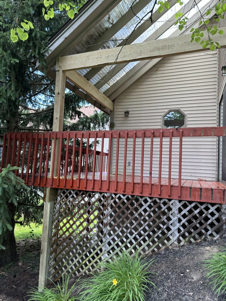 Welcome back to another A+ Home Improvements’ project!! While we love tackling large, ornate projects, not all projects are labeled “sexy.” Sometimes we complete projects based strictly on necessity. Our next client’s home offered a beautiful rear deck to sit out and enjoy their coffee on, but years of wear and tear turned it into a sinking deck. The original structure was framed with rough sawn 2x cedar as opposed to treated lumber. While cedar naturally resists decay, it is only a matter of time before the elements take their toll. Also, the support column began to rot and sink. Take a look at the pictures the below to see the extent of the damage: