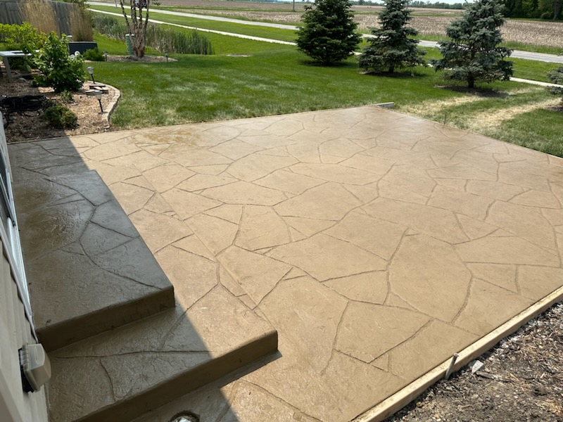 Our client opted for a large random stone design, and highlighted it with the perfect stain and antique. To add a personal touch, they wanted wide treads steps poured and stamped to match. Once the patio was sealed, we prepared to erect the pergola.
