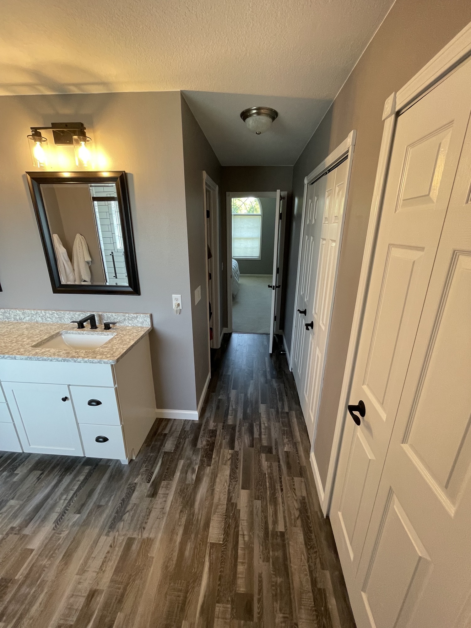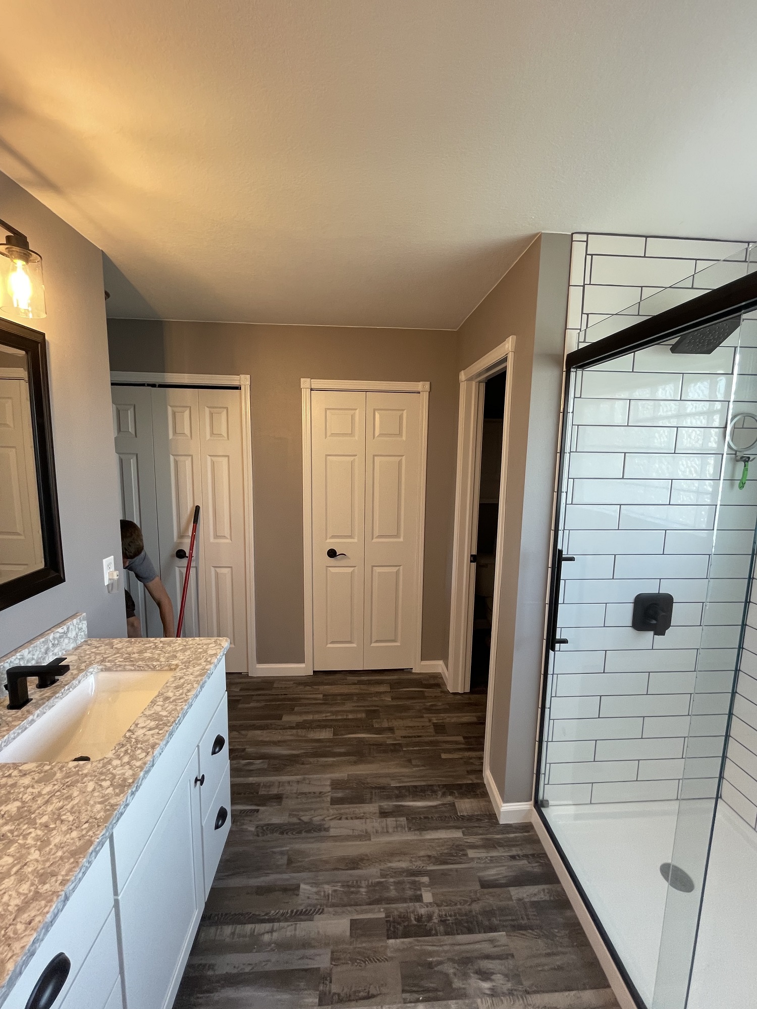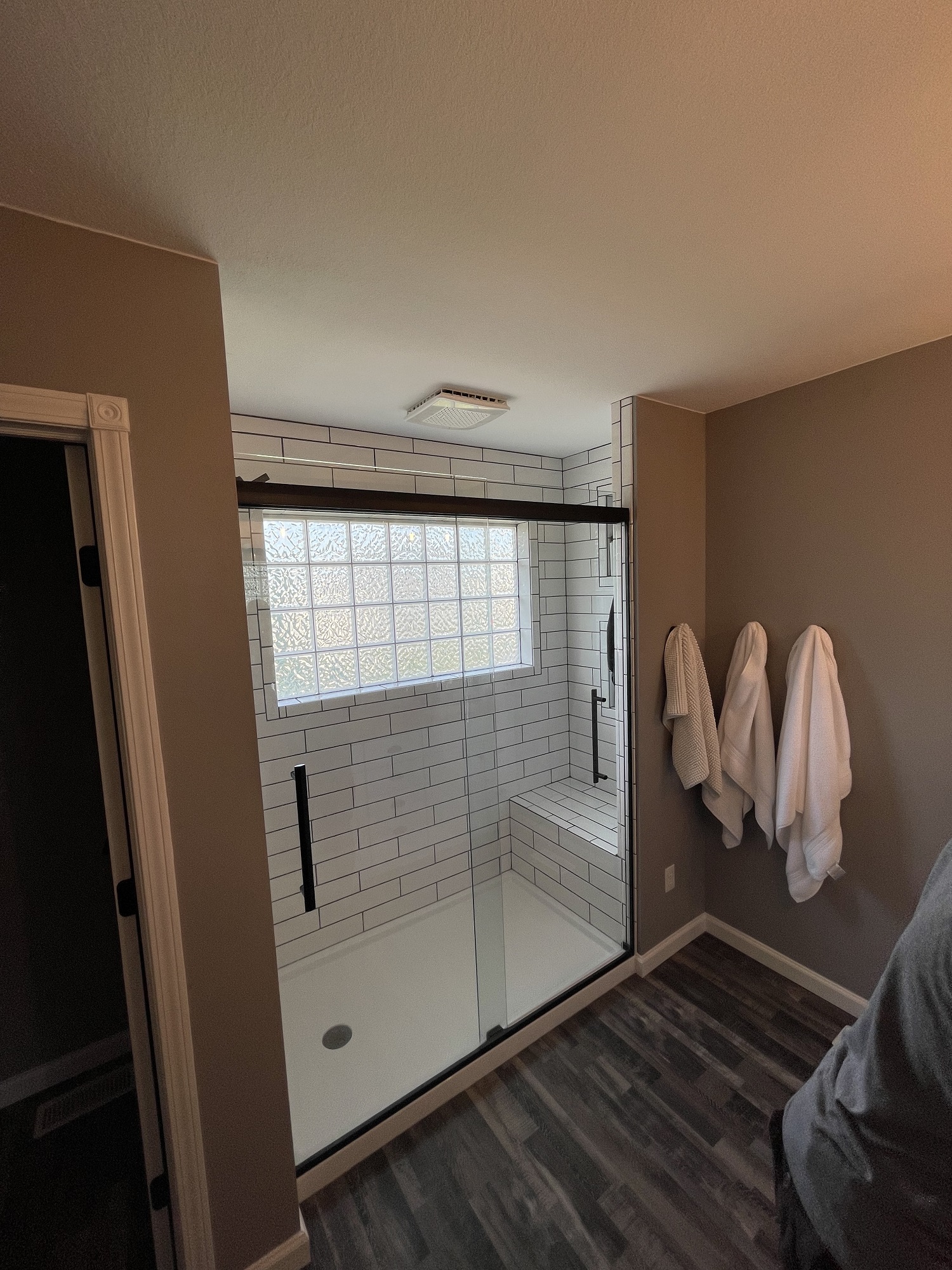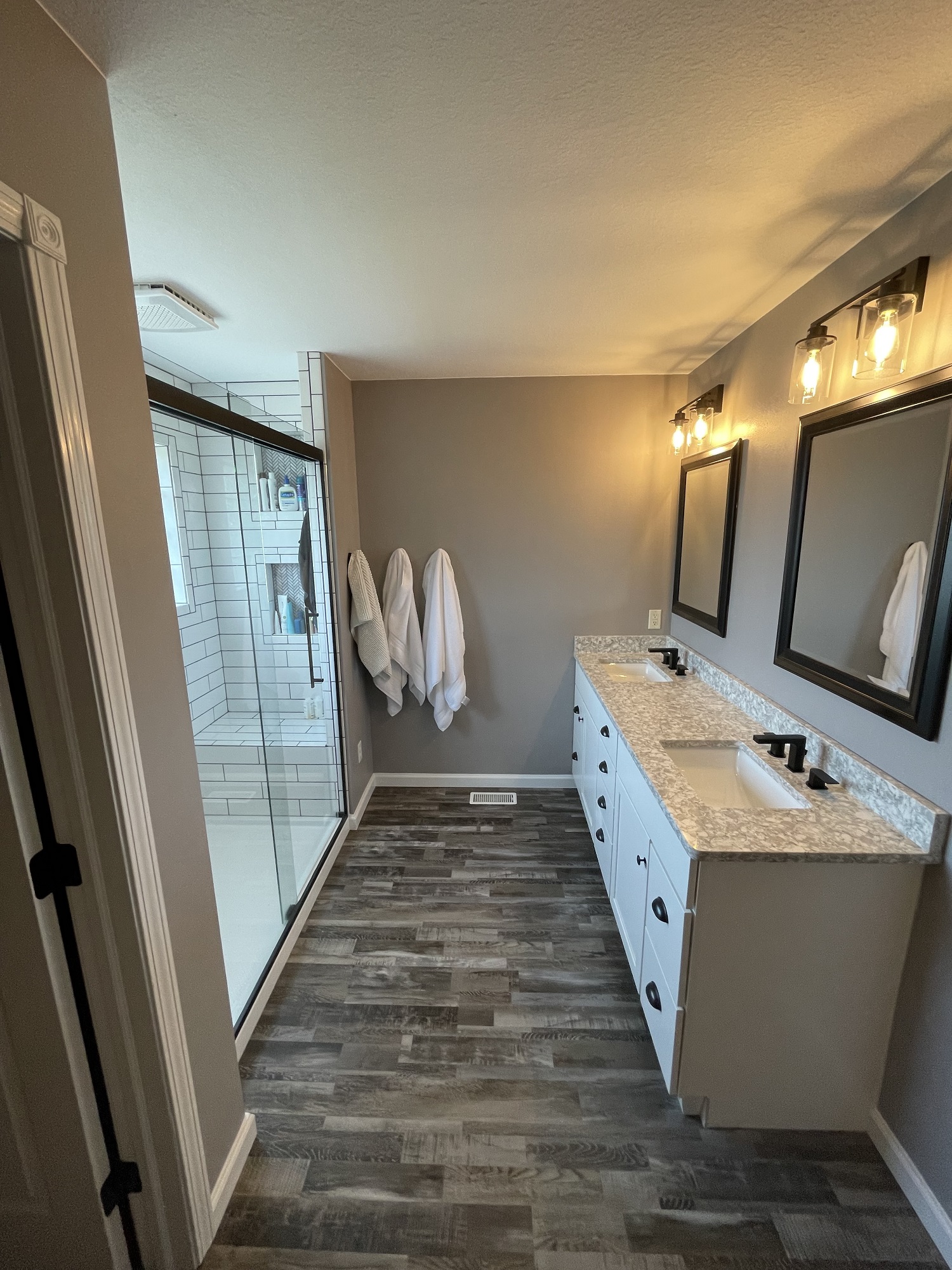 We decided to incorporate the glass block window into the new design to save the natural light that it provided. The bathroom also contained a smaller shower that we converted into a linen closet to provide needed storage for the master bathroom. Along with these improvements, we also updated the double vanity and installed new vinyl plank flooring to pull the space together. Once we completed the material selection process, we prepared to deliver our clients ideal space.
