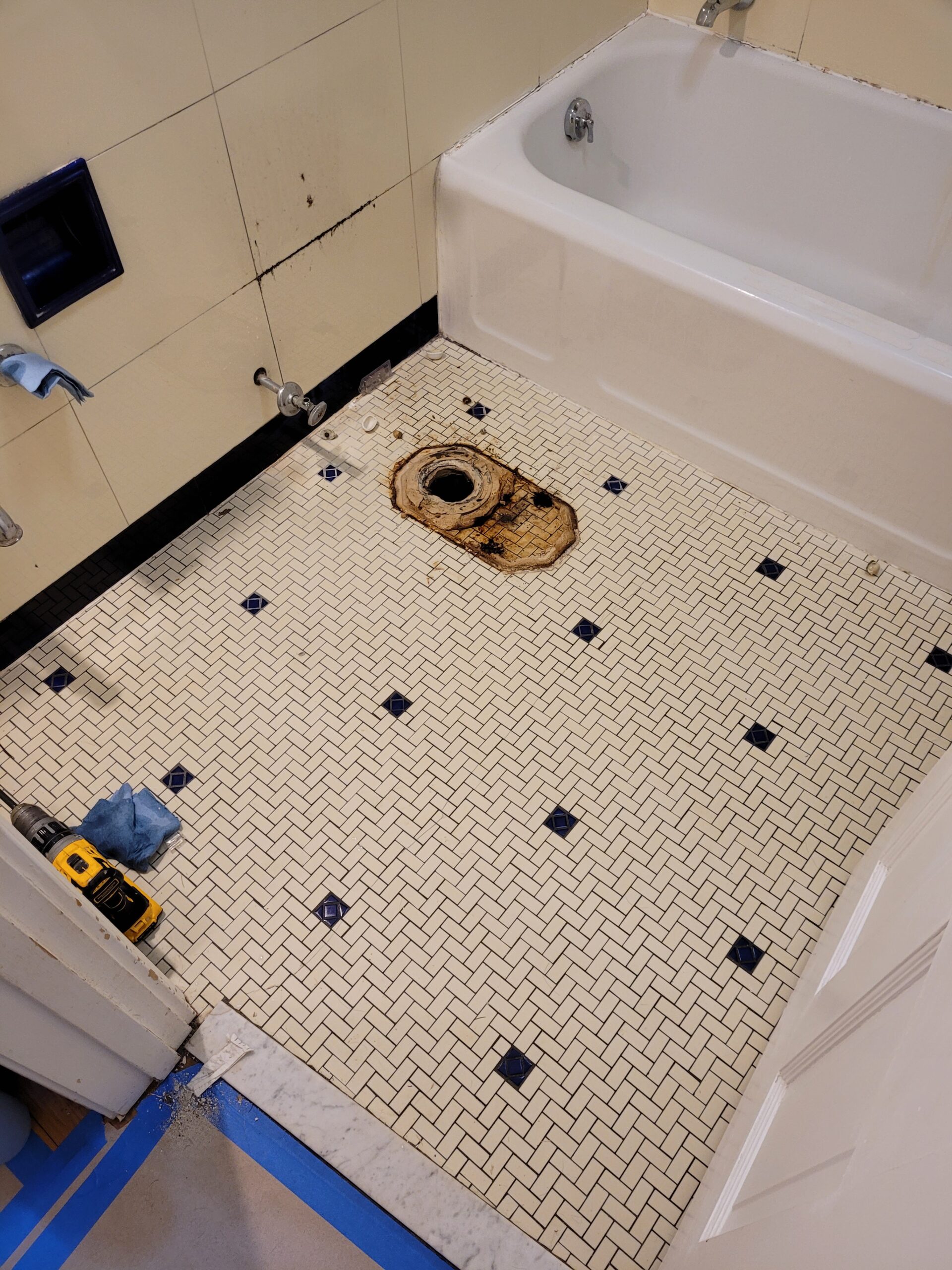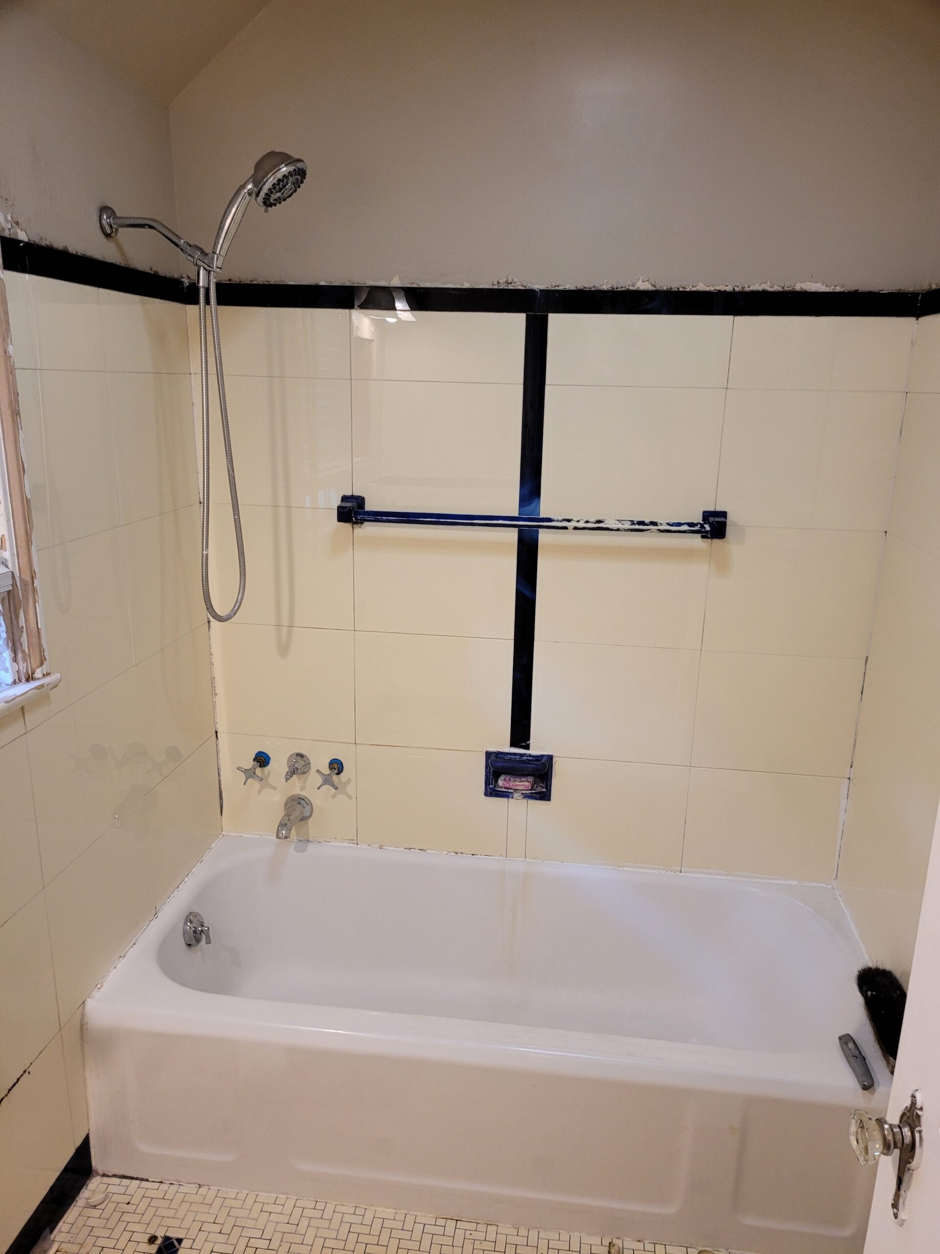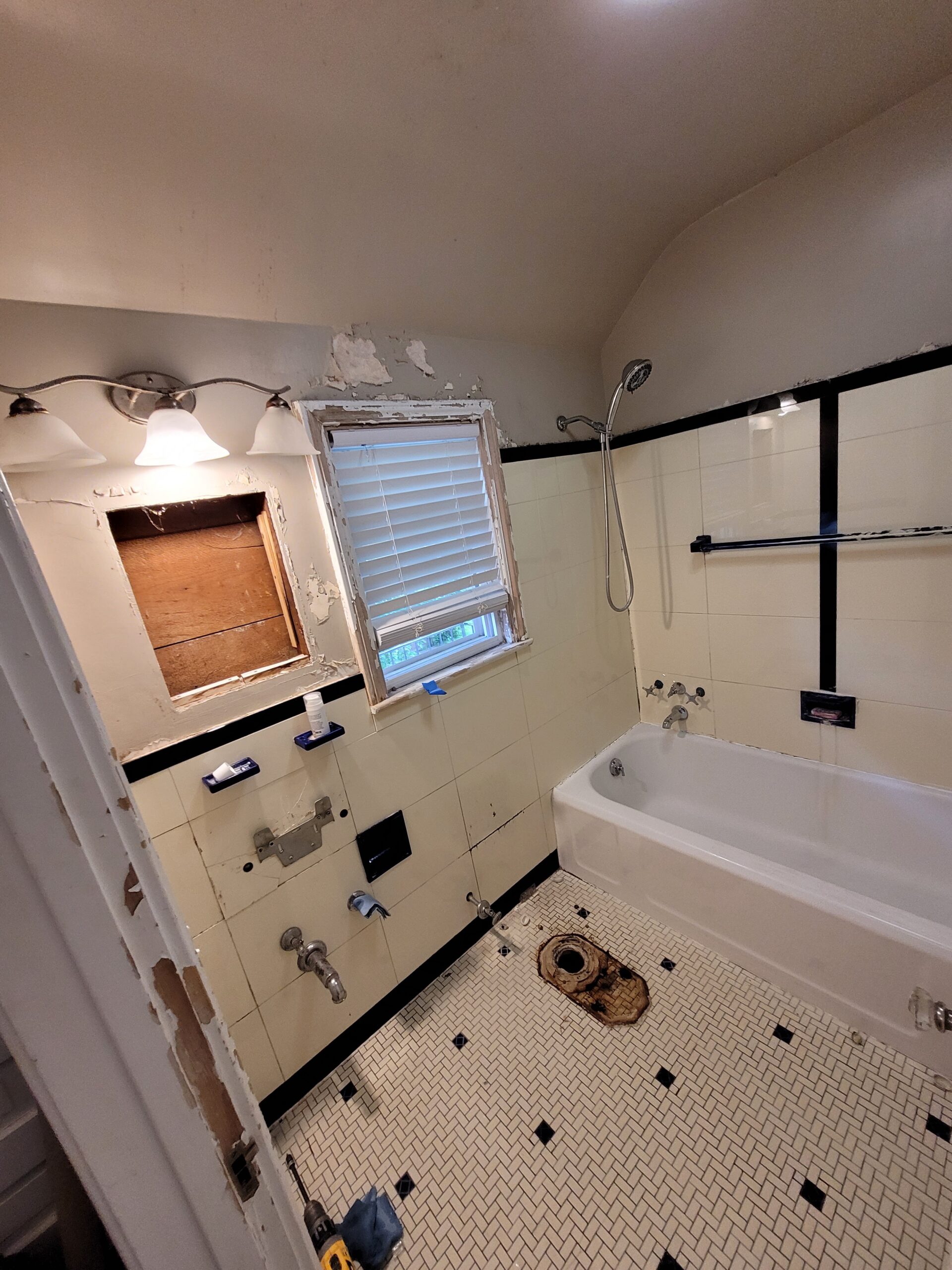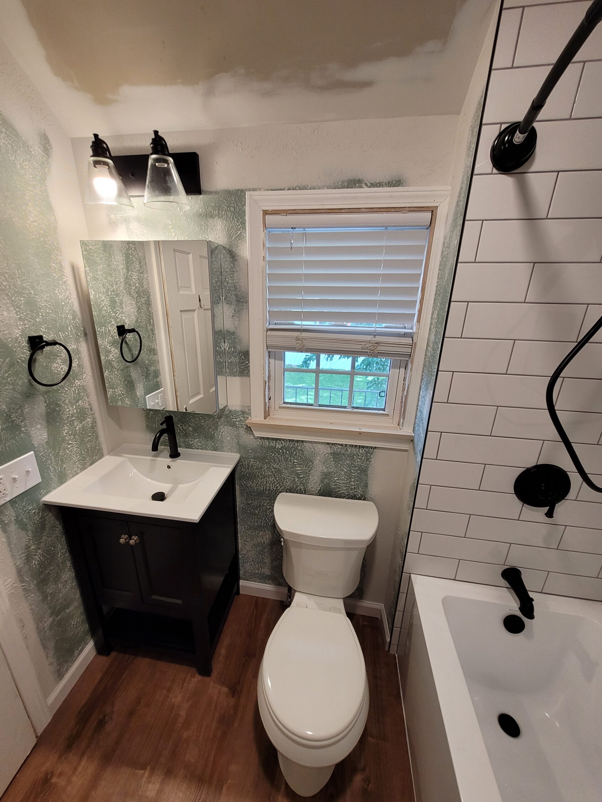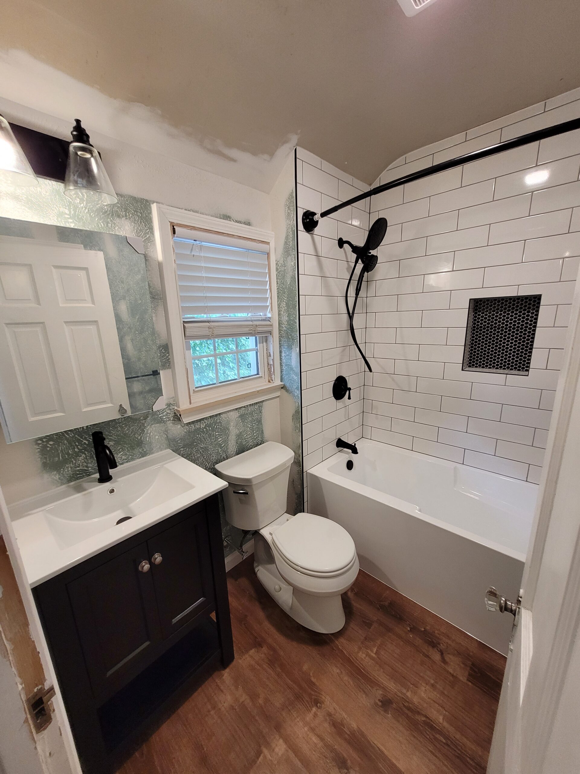 Welcome back! We are excited to show you guys our next project. As you will see from the before pictures, our client’s bathroom needed some serious tender love and care. The existing tile and fixtures had reached their expiration point, and our client desired modernize their bathroom space. When considering design elements, our client opted for a timeless subway tile shower with black fixtures. The walls were in disarray, so we decided to fix them up and apply a light texture that not only repaired the walls, but added a character element that fit with the age of the home. Let’s take a look at the original space: