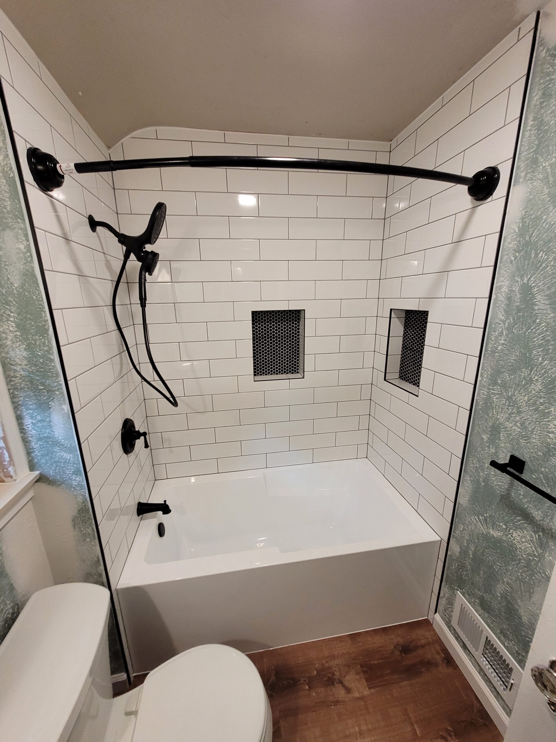 Yikes!! You don’t have to look hard to realize that this bathroom needed an overhaul. We removed all of the tile and fixtures and prepped for the new installation. The original tub was larger than standard, so we framed a small bump out on the left side to not only fit a standard tub, but also provide us with a space to move the plumbing and install adequate insulation. The tile surround went up and we installed two niches to provide ample space for our client’s bathing products. Take a look: