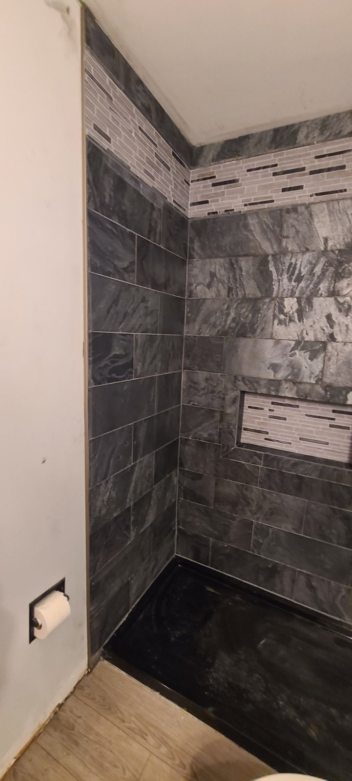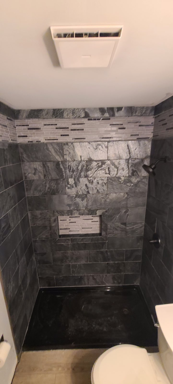 Our client chose a dark surround tile to contrast the lighter accent tile that they desired. They also opted for a black shower pan to provide a different look from the traditional white pan. We incorporated the tile used for the ribbon into the back of the niche as well, which pulled the look together. Our client was thrilled with the results, and we were happy to be a part of the project.