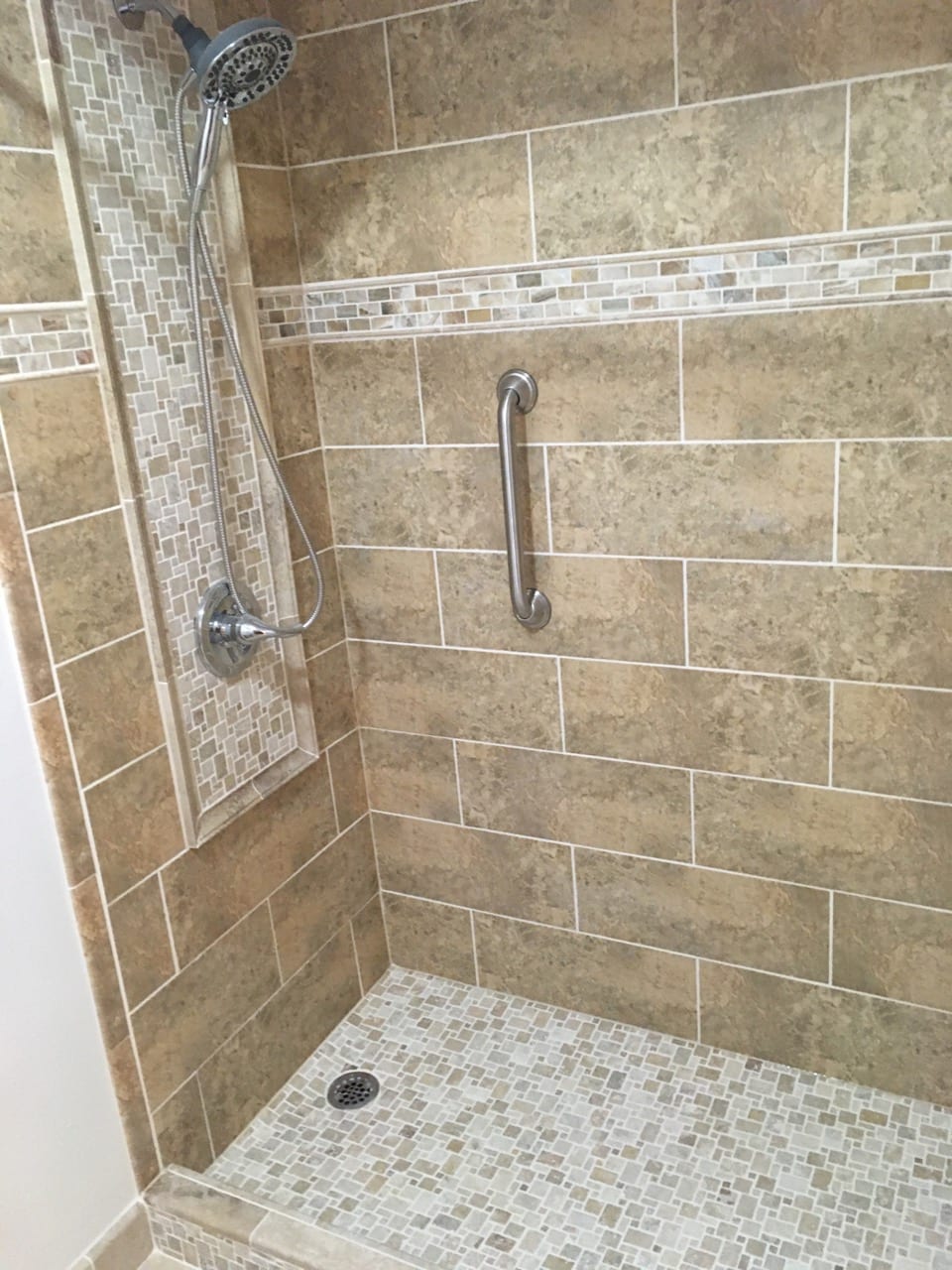 With accessibility being a concern, out client opted to install a grab bar. We often install slide bars for the shower head as well to give individuals an option of where to place the shower head. As long as the space fits your needs, you really can’t go wrong. We offer our opinions when asked, but ultimately the shower needs to work for YOU!