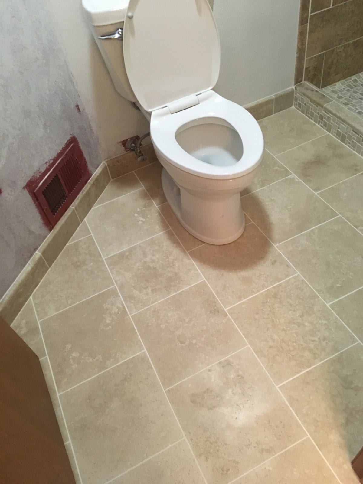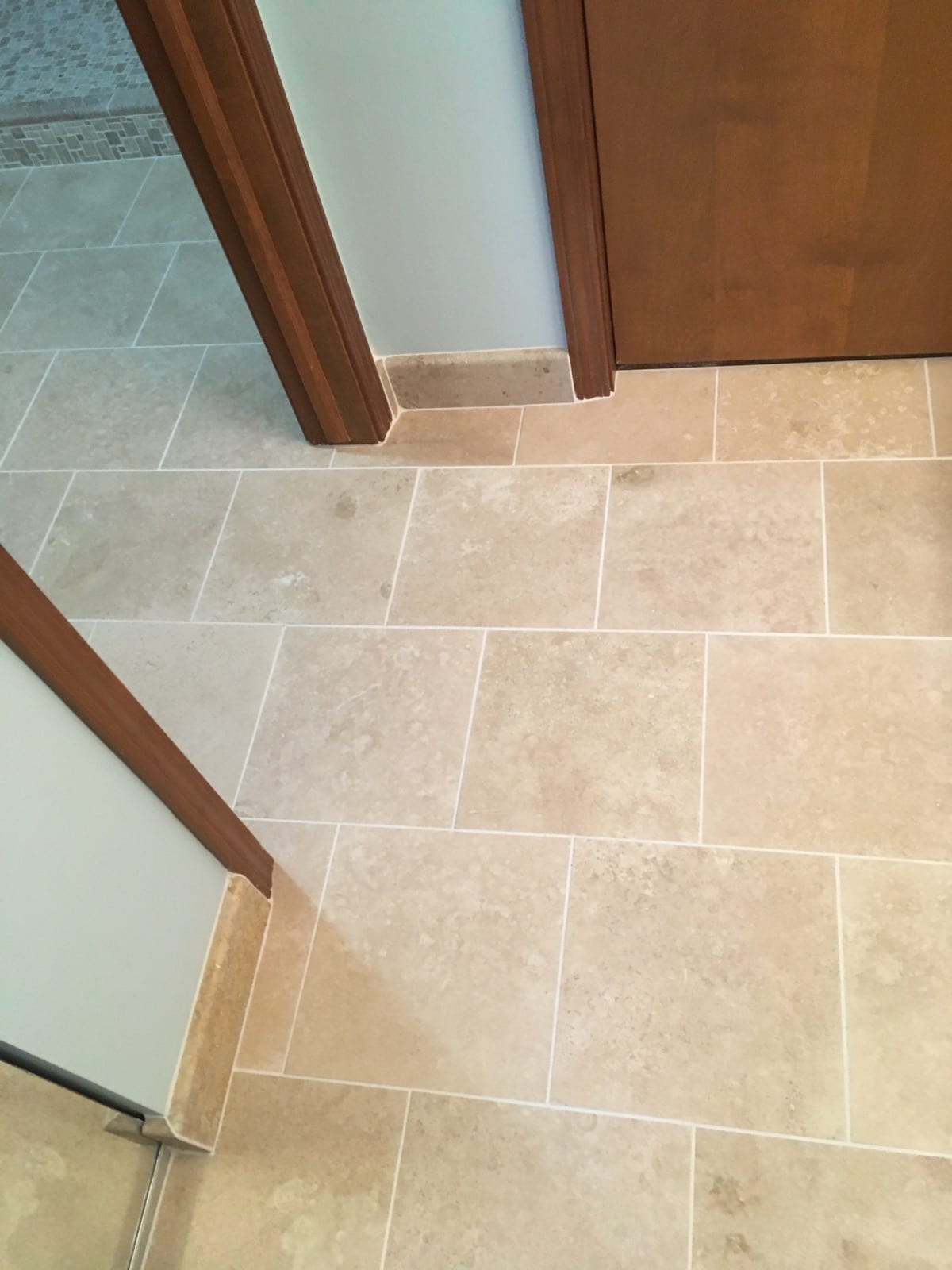 Our client chose 5 different tiles to create their perfect space. With the help of a designer, they put together a layout that was exactly what they were looking for. However, simply picking tile doesn’t create a shower. Careful execution during the install makes the selections work. The waterfall feature around the faucet jumps off the wall, and the accent strips pulls it all together. While the shower stood out, the flooring needed upgraded as well. Our client chose a travertine tile to pair with the colors of the shower, and it was a match made in heaven.
