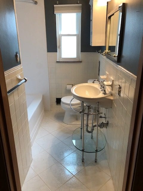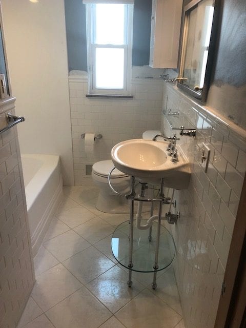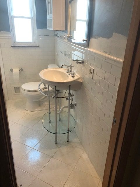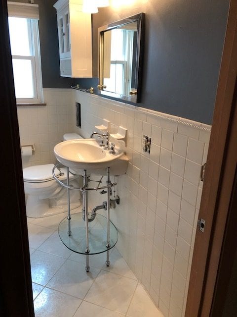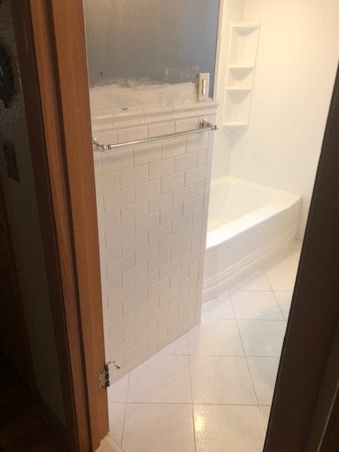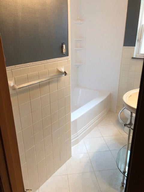 Our client already enjoyed the look of her white tile wainscot, but with dingy grout and old repairs, it had run its course. Most wall tile used to come in traditional 4×4 size, and I’m sure everyone has seen the rainbow of colors that these were available in. To modernize the space, our client chose a traditional subway style tile with a beautiful tile chair rail to accent it. The original tiled in soap holder were swapped out for elegant glass shelving to add some character to the space. Again, not a huge renovation, but a classy one none-the-less!