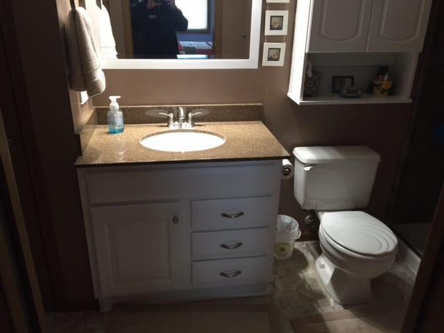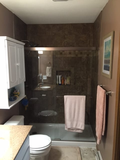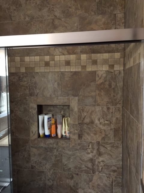 A tiled shower enclosure provides a beautiful addition to your bathroom. Tile style, size and color are important choices that a homeowner gets to choose in order to add their personal flavor to the shower enclosure. This client wanted a simple, clean looking space where grout lines were virtually invisible. The bull nose trimmed out around the shampoo niche proved to be a great choice! Look closely – the tile appears nearly seamless due to the color of grout selected. The flooring and the color coordinated vanity/top, when paired with the tiled shower enclosure, pulls the look together.