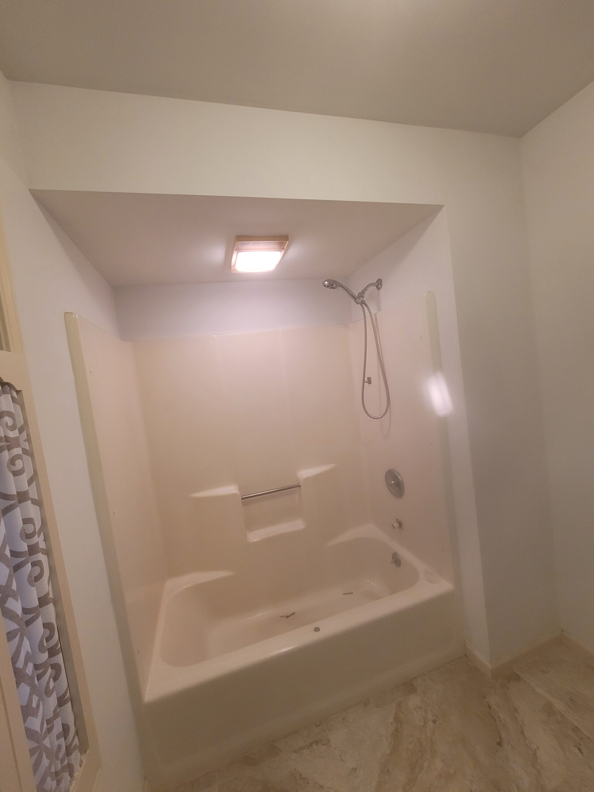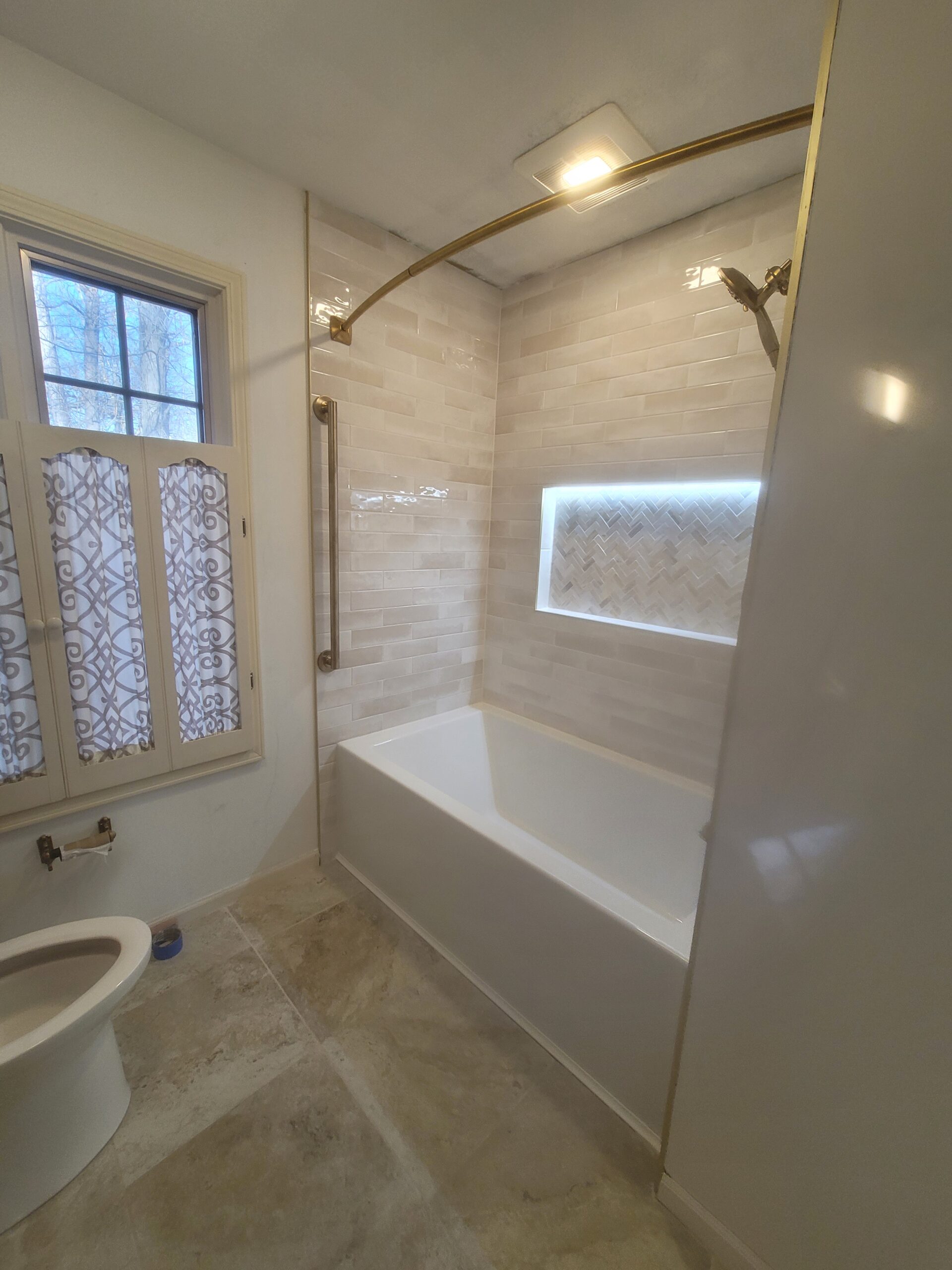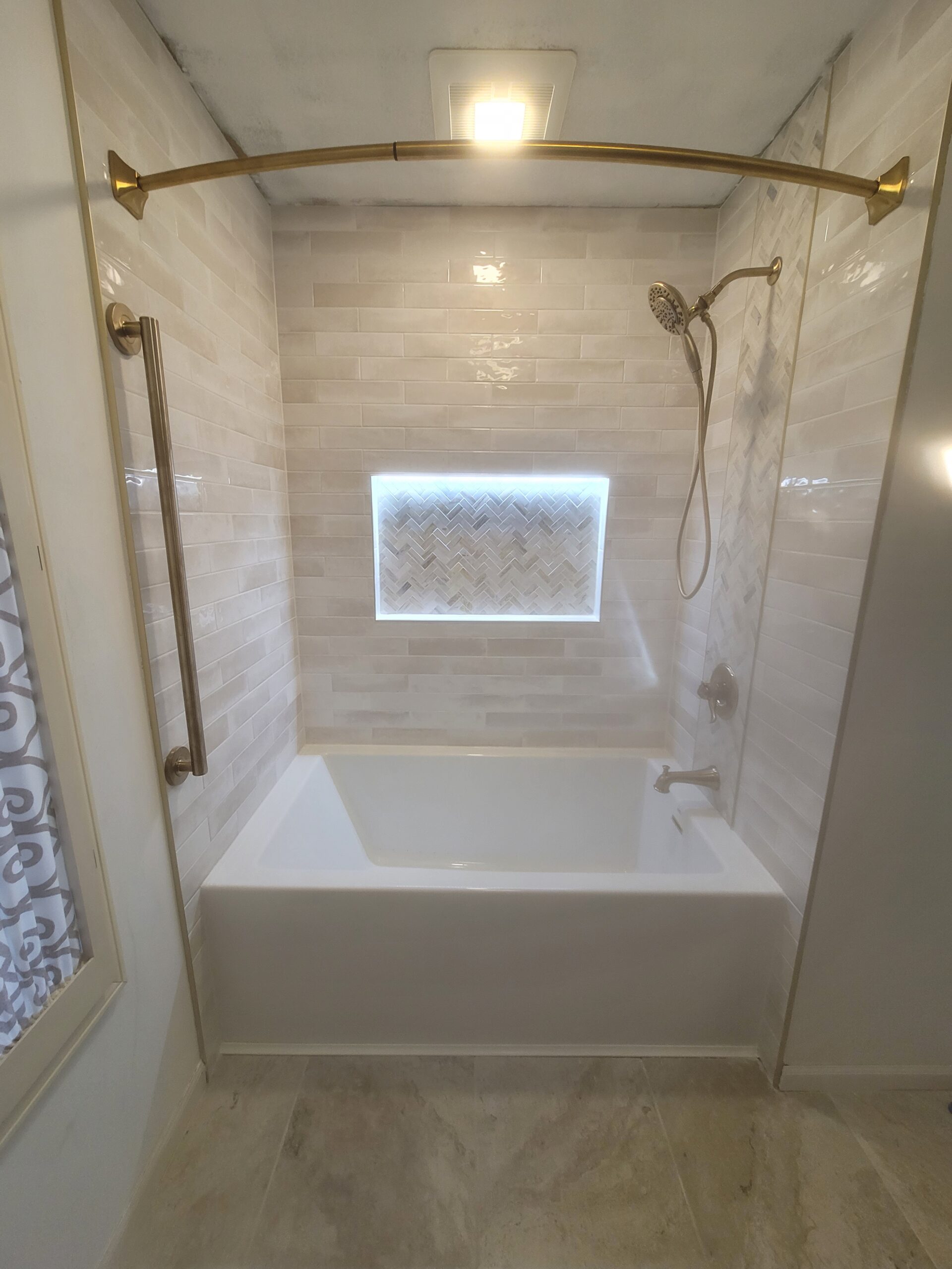 When it comes to sprucing up your bathroom, there are many different ways to accomplish this. While many upgrades have become fairly standard, you can still place your personal stamp on a project by incorporating features that make your project stand out. Our client not only wanted a fabulous tub enclosure, but also desired a tiled surround with a lighted niche. The following picture of their existing tub probably looks familiar to many of you reading this post. The original tub was hard to clean and needed to go.