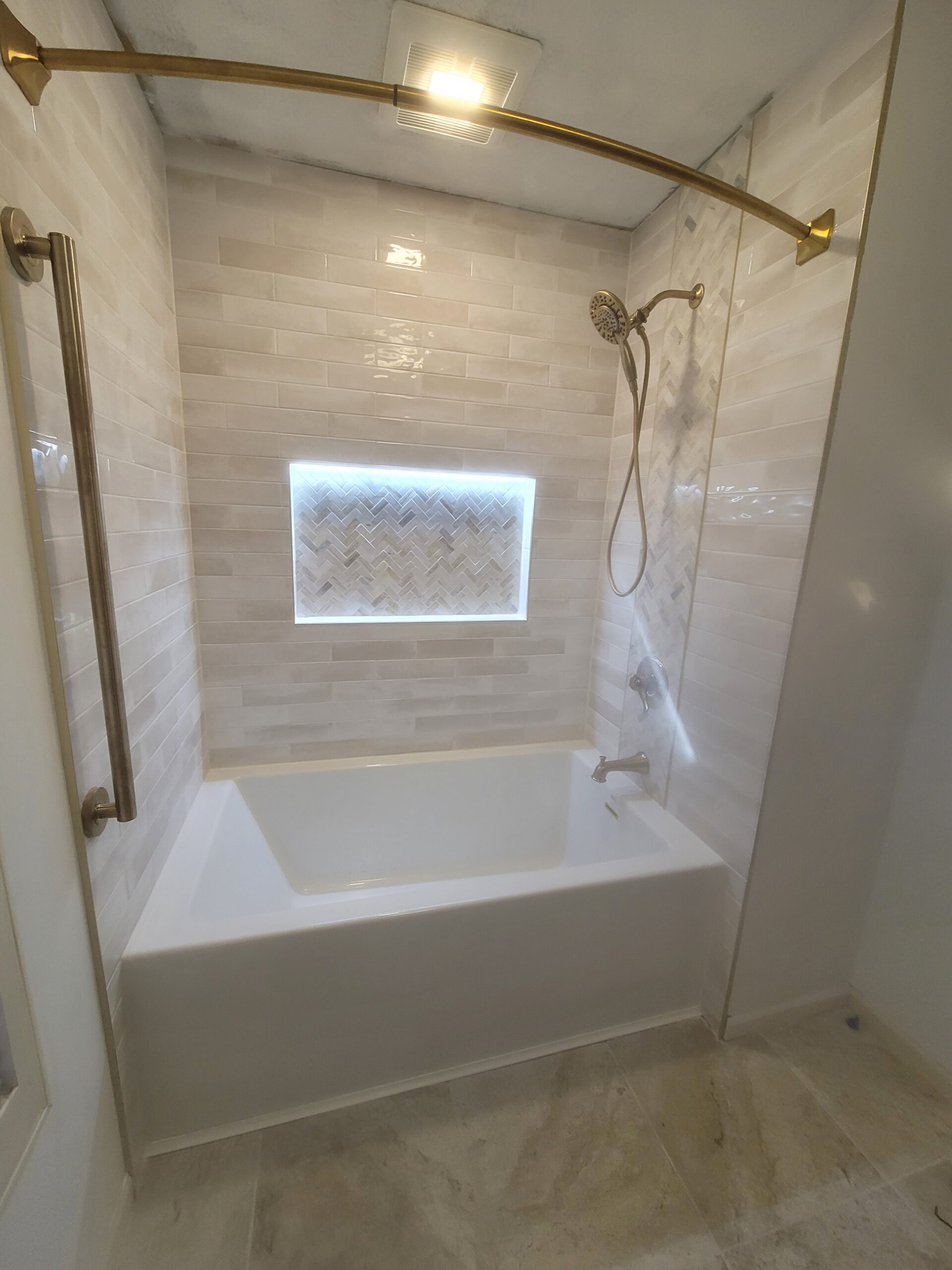 I think we have all seen this style of tub, and can agree that they leave much to be desired. We went to work with our client choosing the perfect tub and fixtures to get the ball rolling. Our client chose a tile for the surround, as well as and accent feature for the fixture wall to add some of their own character to the project. What really made the space stand out, however, was the waterproof LED lighting that we installed at the rear of the niche. The lighting brought the tile to life and created a modern, sleek look for the tiled enclosure.