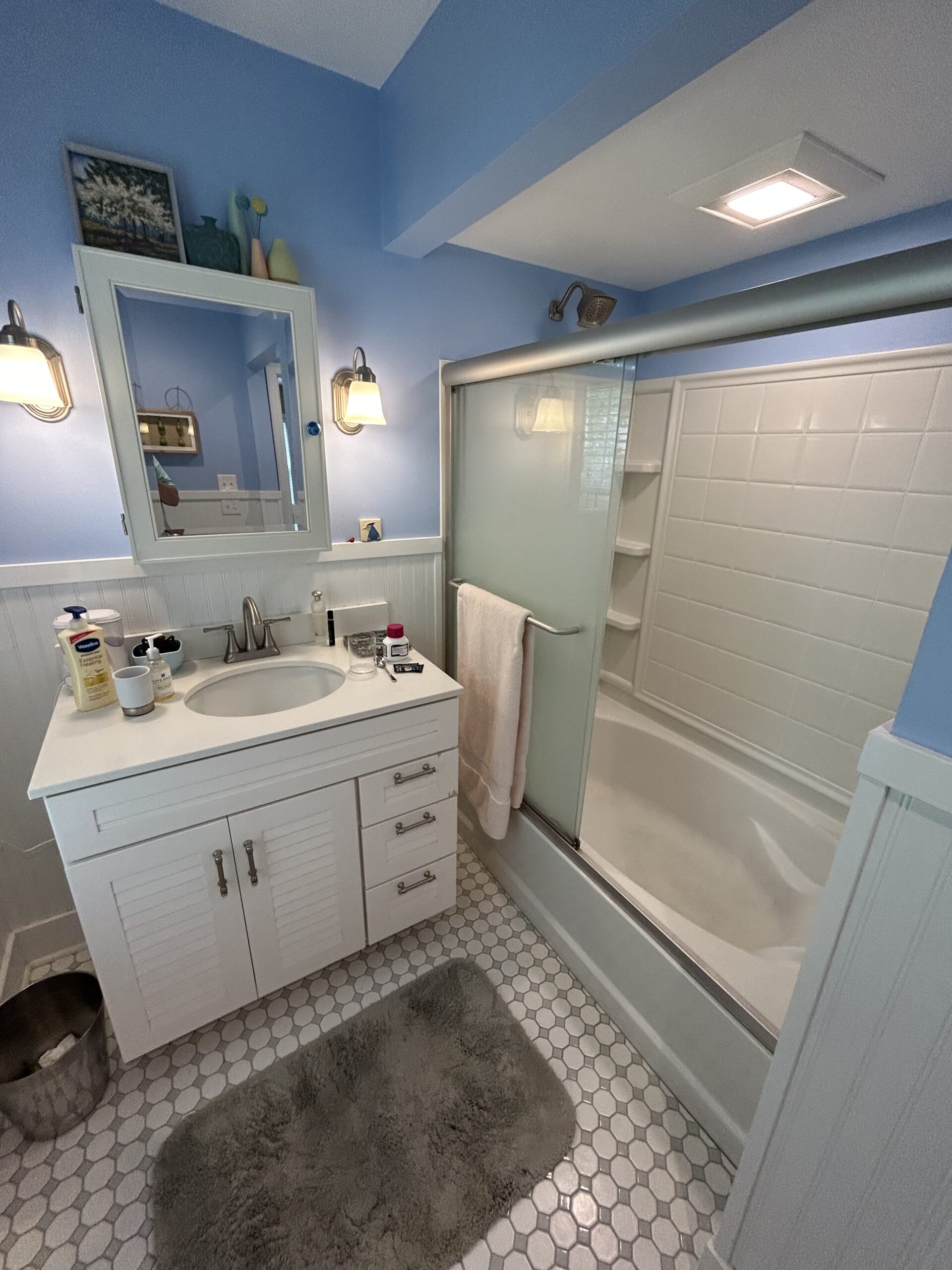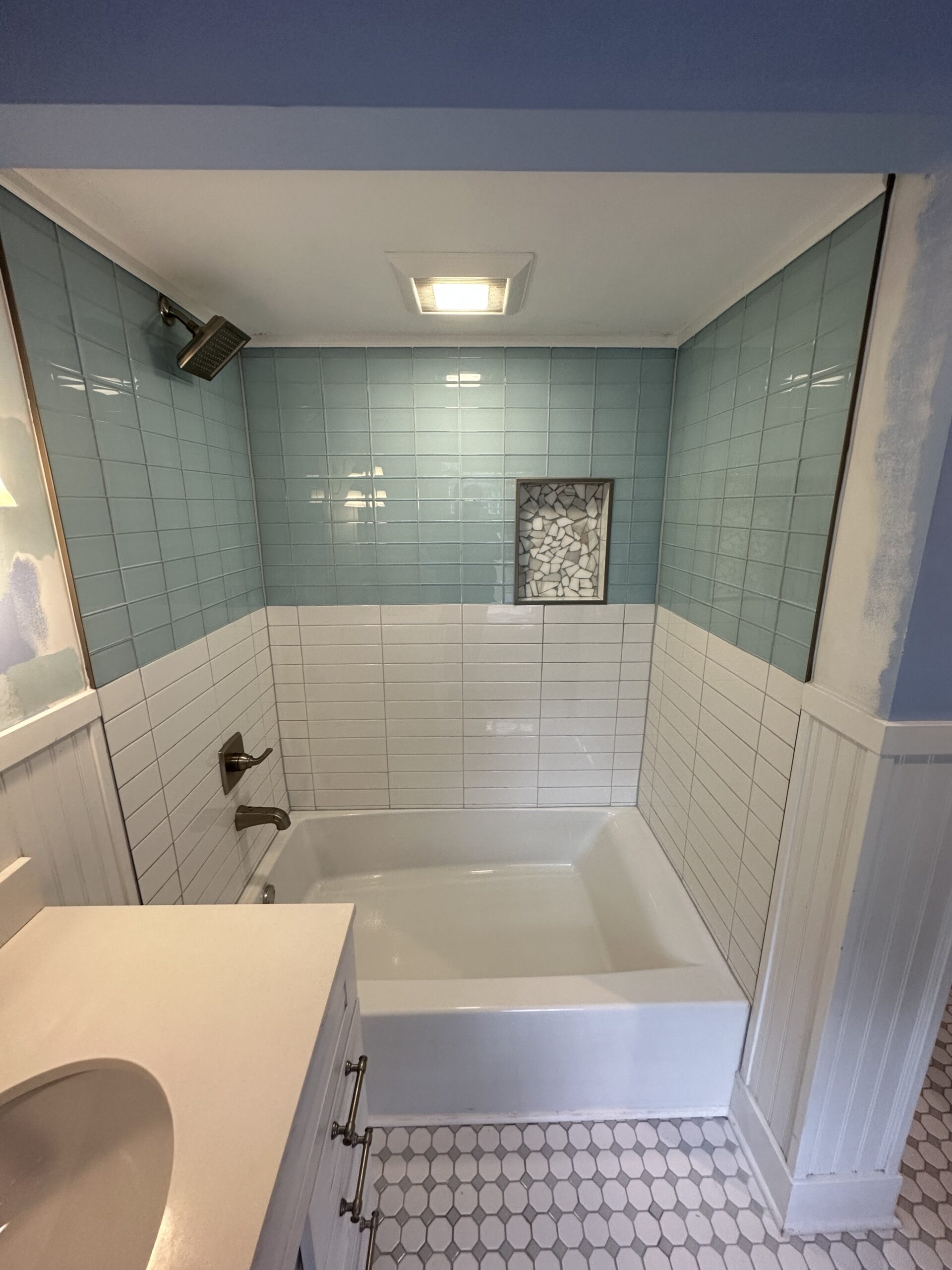 A+ Home Improvements keeps chugging along with our projects. In our last post, we went over a half bath renovation that provided a much needed facelift for our client’s home. This time around, we updated the tub enclosure in their upstairs bathroom. The existing space consisted of a tub with standard, run of the mill surround. Our client already had an idea of how they wanted the tiled tub surround to look, so we simply helped with product selection to achieve their desired outcome. Here is what we started with: